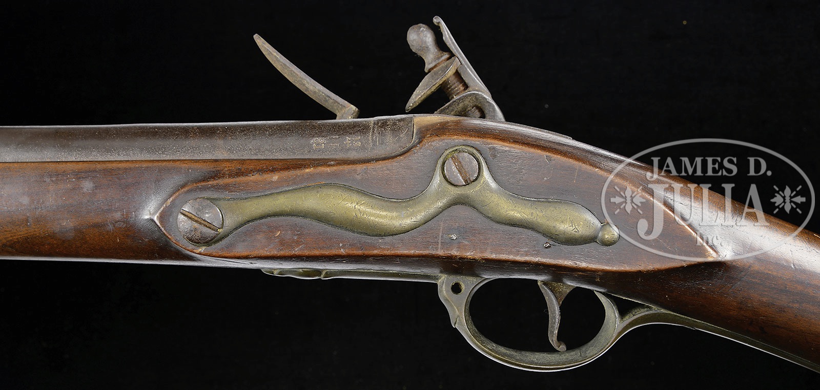 EXTREMELY RARE AMERICAN CHERRY-STOCKED LONG-LAND PATTERN BROWN BESS MUSKET DATED 1740.SN N/A. Cal. .75 rnd 45″ cut from 46″ long bbl marked near breech with Tower view and proof marks. The lock is marked with Broad Arrow in front of Crown/”GR” under the iron pan and behind the cock in two vertical lines “TOWER/1740”. The early King’s Pattern furniture is brass and typical of other early land patterns including long stepped buttplate tang, raised lockplate escutcheon, straight rear ramrod pipe thimbles and front ramrod pipe just over 4″. This gun was restocked in America utilizing American cherry wood closely emulating the orig British walnut with all the orig furniture utilized with exception of thumbplate which there is no provision for. During the restocking in America the muzzle was cut exactly 1″ making the bbl length 45″ from its orig length of 46″. This is as beautiful and untouched an example of an American Revolutionary War first model Brown Bess that you will find. It is understandable why Mr. Flayderman retained this beautiful musket in his personal collection for so long. PROVENANCE: Norm Flayderman Estate Collection. CONDITION: The bbl and lock are brown overall with good, discernible bbl proofs and lock markings as can be seen in photographs. Metal overall is brown and smooth with areas of pitting, especially along top areas of hammer, frizzen, pan and bbl breech. The bore is pitted and uncleaned. The American cherry stock is sound and solid with only minor storage dings, dents and scratches. Metal is mounted extremely well with some wear and erosion at breech behind hammer. There is a hairline crack forward of lock that is only about 1″ long. Stock is missing nosecap and as noted in description bbl has been irregularly cut to make bbl now almost exactly 45″. 4-51195 JS29 (15,000-25,000) – Lot 2137