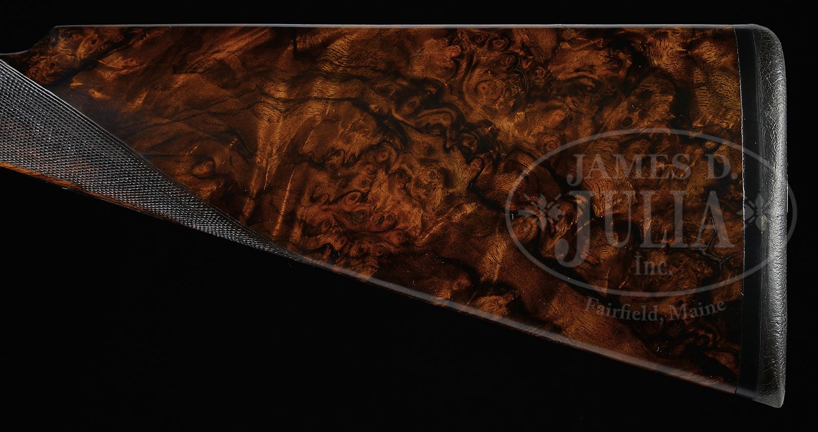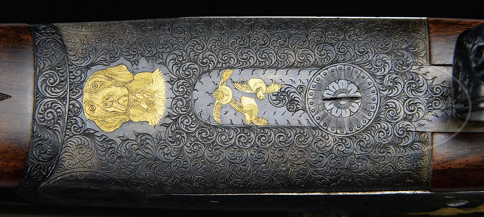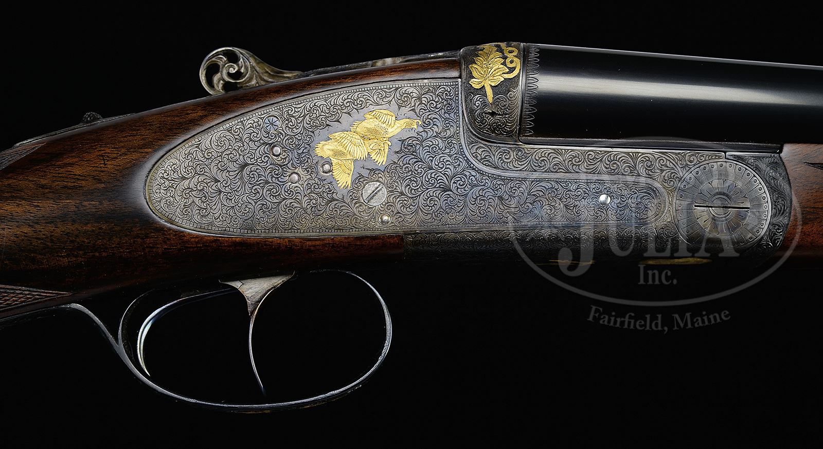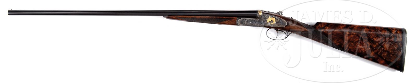 *CUSTOM GOLD INLAID 28 GAUGE GRULLA SIDELOCK EJECTOR GAME GUN.SN 31-03-083-04. Cal. 28 GA 2-3/4″ Chambers. 28-1/4″ Chopper lump bbls fitted with screw chokes and low, narrow, concave game rib are marked “GRULLA ARMAS S. L. EIBAR MADE IN SPAIN” on top of right bbl. Engine turned bbl flats are stamped with Spanish nitro proofs for 28 ga and 2-3/4″ chambers. Case hardened, round bodied, H&H type sidelock action features non-automatic safety, bushed strikers, raised rib tumbler end cocking indicators, H&H type detachable sidelocks, and dbl triggers, front articulated. Action is engraved with near full coverage simple scroll as background for semi-relief gold inlays of flowers and birds. Fences are inlaid in leaf and ribbon design. Left lock portrays a pair of gold cock pheasant dueling, spurs raised. A pair of quail fly across right lockplate. Bottom of action has gold portrait of a retriever with a trio of on-coming quail are on trigger plate. Top lever is pierced in scroll design. Sgl beaded trigger guard bow is also pierced in foliate design with gold inlaid flowers. Exceptional burl figured European walnut straight grip buttstock measures 14-1/2″ over thin black Decelerator pad. Point pattern checkering is at grip. Matching splinter ejector forend has Anson release with gold inlaid spider on tip. Drop at heel: 2-1/16″, drop at comb: 1-3/8″. Weight: 6 lbs 4 oz. LOP: 14-1/2″. Gun is accompanied by its orig box and packing materials and three additional Briley thin wall choke tubes (2 in gun) and wrench. PROVENANCE: Larry Baer Estate Collection. CONDITION: Excellent, showing little use, with scant evidence of having been fired, since proof, retaining essentially all of its orig finishes on wood and metal, with few light handling marks. Mechanically crisp. Box is fine. 49427-12 MGM260 (5,000-8,000) – Lot 2137