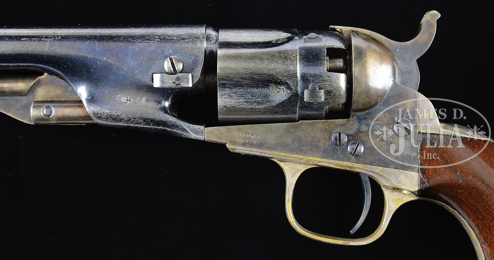 FINE CASED PAIR HARTFORD-LONDON COLT MODEL 1862 POLICE REVOLVERS.SN 21655/17431. Cal. 36. Rarely are found double Colt casings, especially for such a scarce model sold in the London market. This pair of Colt’s conform to other Model 1862’s with 5-1/2″ rnd bbls, 5 shot rebated cyl with patent dates in one flute, 1-line New York address and London proofs on each bbl housing and each cyl chamber. Both guns are in similar fine matching condition, retaining most of their orig finish. The accompanying orig oak Colt London casing is fitted with “Colt’s Patent” flask and mold. These particular guns were made in 1863 and few similar sets are known. PROVENANCE: The Esteemed Collection of Steve Ardia. CONDITION: Very fine overall, matching and complete. The higher serial numbered of the two guns is slightly better, especially in cyl finish and stock varnish. Both guns retain about 95% inky blue finish on bbls. Both guns retain about half their finish on cyl, both with 5 crisp safety pins. Both guns retain much of their orig muted case colors on loading assemblies, frames and hammers. There is no cal marking on rear trigger bow of 21655, though found stamped as normally found on 17451. Grips are sound and well fit on both guns, higher serial number gun retains virtually all its orig varnish with edge wear. 17451 has a clearer varnish with similar edge wear. Wedge on 17451 is matching, but appears cleaned and does not fit tightly. Mechanically guns are fine with crisp bright bores and some orig finish retained in each chamber of cyl. Bullet mold retains half its orig finish with numerous small dings and dents. “L” shaped combination screwdriver/nipple wrench is very good, retaining traces of orig finish. Accompanying “Colt’s Pocket Flask” made by James Dixon has adjustable spout and large dent on reverse, overall retaining some thinning finish and patina. Accompanying pewter oiler is unmarked and very fine. Iron knobbed cleaning rod accompanying is also very fine. Oak casing is very good overall with uninscribed brass plaque on lid. Lining is average, faded, lightly soiled and worn. Lid is slightly warped retaining most of its orig finish with numerous small blemishes, especially to brass plaque. 49631-26 JS (12,000-20,000) – Lot 2137