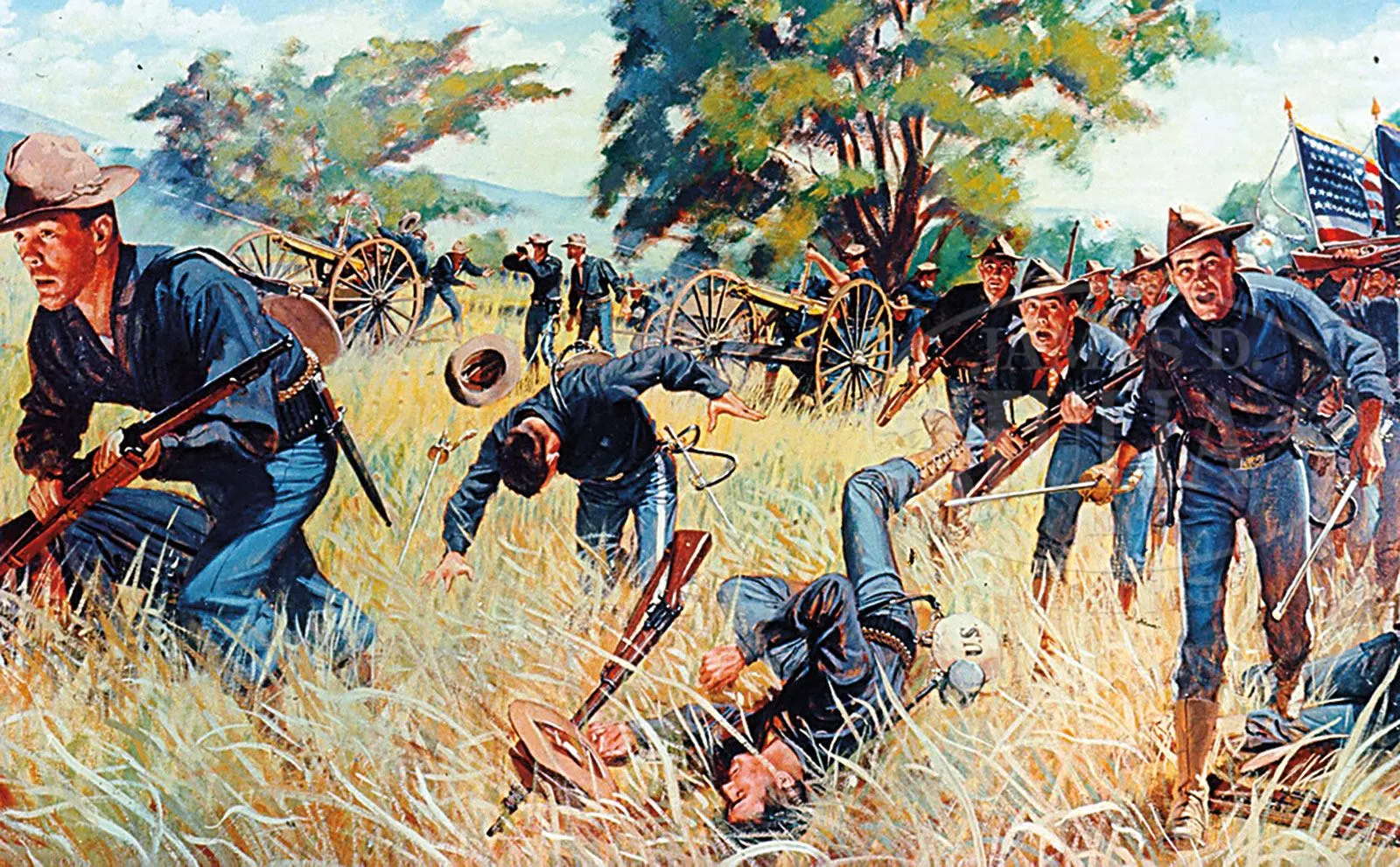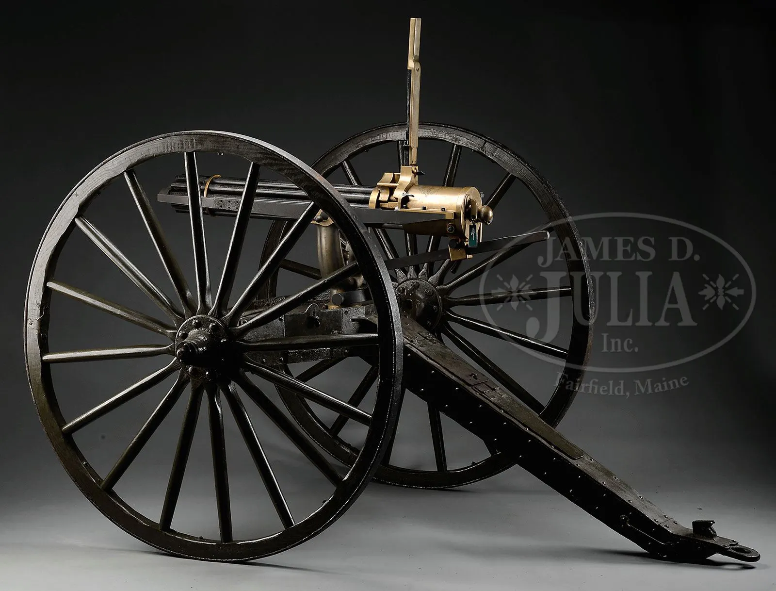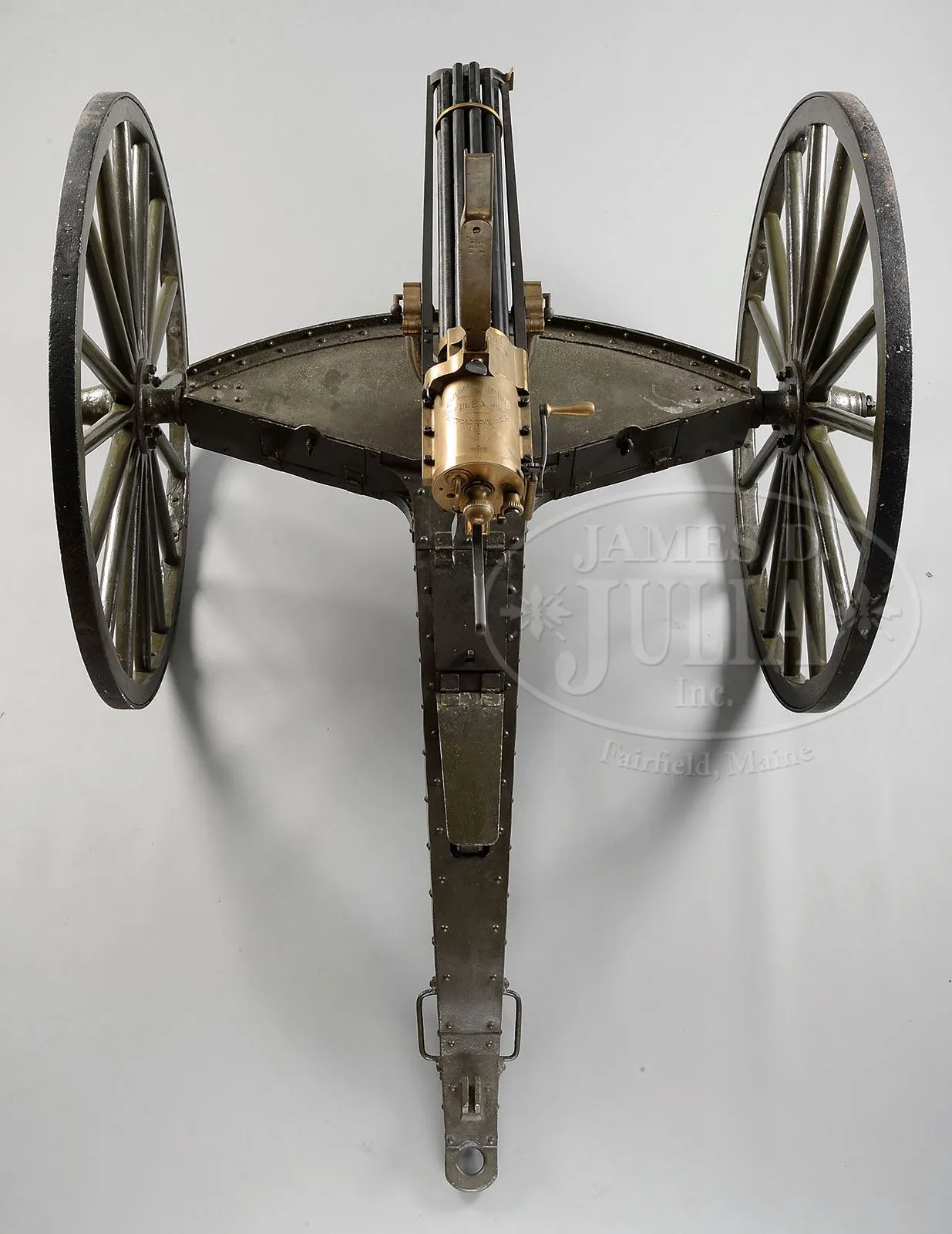 RARE MODEL 1893/95 GATLING GUN ON ORIGINAL CARRIAGE.SN 1011. This is a fine 10-bbl Colt manufactured Gatling Gun with 10 32″ bbls, bronze housing. Bronze breech cover marked “GATLING GUN PATENTED / Manufactured by / Colt’s Pt. F.A. Mfg. Co. / HARTFORD, CONN. U.S.A. / NO. 1011 / CAL. 30 / D.M.T.” (Daniel M. Taylor, Inspector). The right rail cover is marked MODEL 1895. Gun is mounted with orig bronze yoke with iron pintle and tiller on orig 1895 field carriage. SN 1011 is one of 18 guns ordered by the US Ordinance Department June 19, 1883. From page 129-130 Wall & Toppel 1971 The Gatling Gun “A clause in this contract provided that at the option of the US government, the Gatling Gun Company would later convert these guns to the “Bruce Feed”. In 1897 General D. W. Flagler ordered all 18 guns converted to Bruce Feed (SNs of these guns 1001-1018). At the time of the conversion of the Model 1893 Bruce Feed, the head space adjustment was also modified. Originally, head space in this model was adjusted by screwing the cascabel knob in or out; setting was fixed by engaging a spring lock that held the knob at any point. This was found to provide too much latitude in adjustment and the cascabel knob was replaced with one only having 5 settings, in increments of .003 inch.” The identical gun and carriage is of the type utilized in the Spanish-American War as seen in contemporary photograph of the 13th US Infantry Gatling Gun Detachment training at Tampa, Florida, June 1898. Lt. John Henry Parker aka “Gatling Gun Parker” commanded a battery of four guns (thought to be SNs 1040-1043) on San Juan Hill and Kettle Hill. On San Juan Hill, Parker’s battery of Gatling Guns continued to rake the trench lines until the American assault broke into a charge about 150 yards from the crest of the hill. Upon gaining the hill, the carnage wrought by the Gatling fire was immediately noted in contemporary accounts. Captain Boughton, among the first officers to surmount the crest of San Juan Hill, stated The trenches on the hilltop were filled with dead and dying Spanish riflemen, while the open ground behind was covered with dead and dying Spanish defenders who had been shot while attempting to flee the hail of Gatling fire. Teddy Roosevelt noted that the hammering sound of the Gatling Guns raised the spirits of his men. PROVENANCE: Val Forgett Collection, Dolf Goldsmith 1959, Evergreen Aviation & Space Museum. CONDITION: Fine to very fine as restored. Gun appears fully functional and has been used in live fire after restoration. When gun was orig found, bbls were rusted as were carriage parts. Bbls are well machined copies in .308 for ease of obtaining ammunition for firing, where 30-40 new Krag rounds are difficult to find. Bronze housing, feed housing and most other brass or bronze parts appear orig and smooth with discernible markings. Patent dates on orig “Bruce Feed” magazine are weak but discernible. Iron rails and carriage parts are all refinished with heavy pitting on carriage portions. Carriage appears orig with exception of replaced compartment doors and wood portions of wheels. This is a fine, shoot-able Gatling Gun, potentially with Spanish-American War history. 4-51802 (125,000-150,000) – Lot 2138