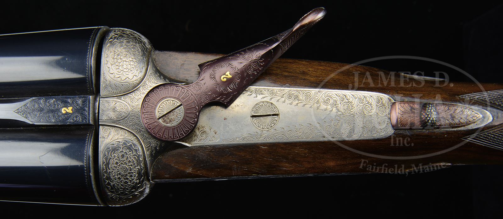 *PAIR OF ARRIETA XXV GAME GUNS.SN 26799/ 26800. Cal. 12 ga. 2-3/4″ Chambers. 25″ Chopper lump bbls with Churchill ribs, are marked “Fca. de Escopetas Arrieta – Elgobar (Espana)” on tops of right bbls. Guns are made as a pair with numbers “1” and “2” gold inlaid on rear portions of ribs, top levers, and forend tips. Bbl flats are stamped with Spanish nitro proofs for 2-3/4″ chambers. Each bbl set is fitted with H & H type spring opening assist mechanism. Coin finished sidelock actions feature non automatic safeties, bushed strikers, and single triggers. Actions are engraved with British style rose and scroll. Bottoms of actions are marked “FABRICA DE” “Arrieta Y Cia” “ELGOIBAR”. Blued top levers and single beaded trigger guards are also scroll engraved. Nicely fiddle figured European walnut straight grip buttstocks measure 14-1/2″ over checkered wood butts and feature faceted drop points, diamond hands, point pattern checkering with mullered borders at grips, and brass ovals on toe lines engraved “C. R. A.” Matching splinter ejector forends have Anson releases. Gun no. “1”: Bore diameter: left-.723, right -.725. Bore restrictions: left -.019 (Mod), right -.010 (IC). Drop at heel: 2-3/8″, drop at comb: 1-3/8″. Weight: 6 lbs. 12 oz. LOP: 14-1/2″. Gun no. “2”: Bore diameter: left-.722, right -.723. Bore restrictions: left -.013 (Mod), right -.005 (IC). Drop at heel: 2-3/8″, drop at comb: 1-3/8″. Weight: 6 lbs. 12 oz. LOP: 14-1/2″. CONDITION: Excellent, showing limited field use. Bbls retain nearly all of their lustrous factory blue with a number of minor marks. Gun “1” has a number of considerable rubs on right bbl at front of forend. Actions retain nearly all their orig coin finish. Stocks have a number of handling marks in their orig finish, some relatively deep on gun no. “1”. Bores are excellent. Triggers do not set up for second shot. Guns are in need of some cleaning. 46430-2 MGM125 (5,000-8,000) – Lot 2138