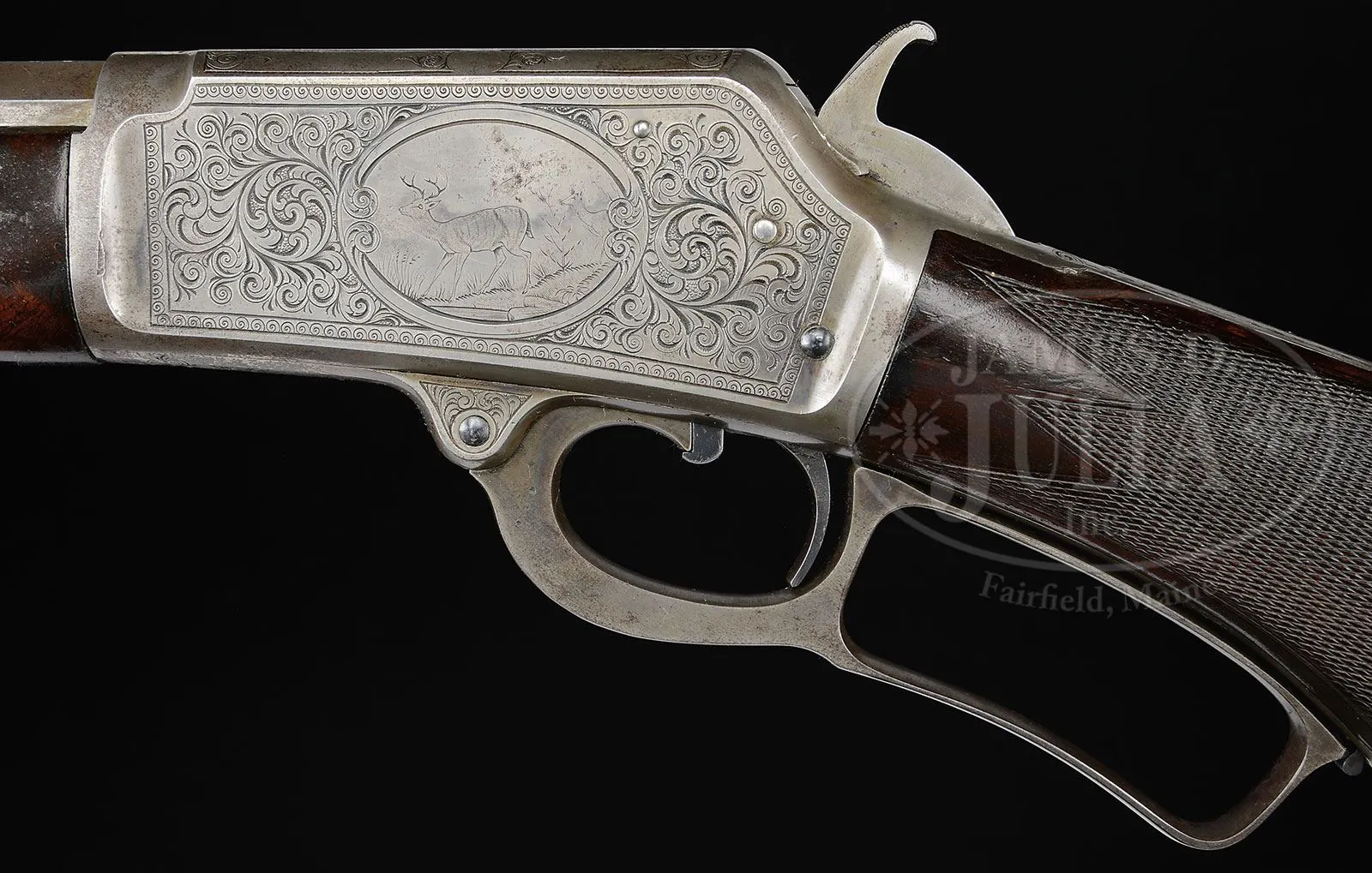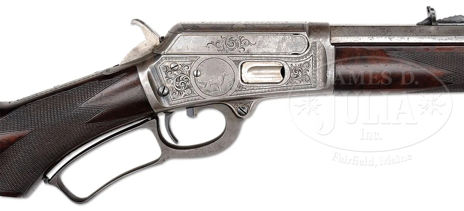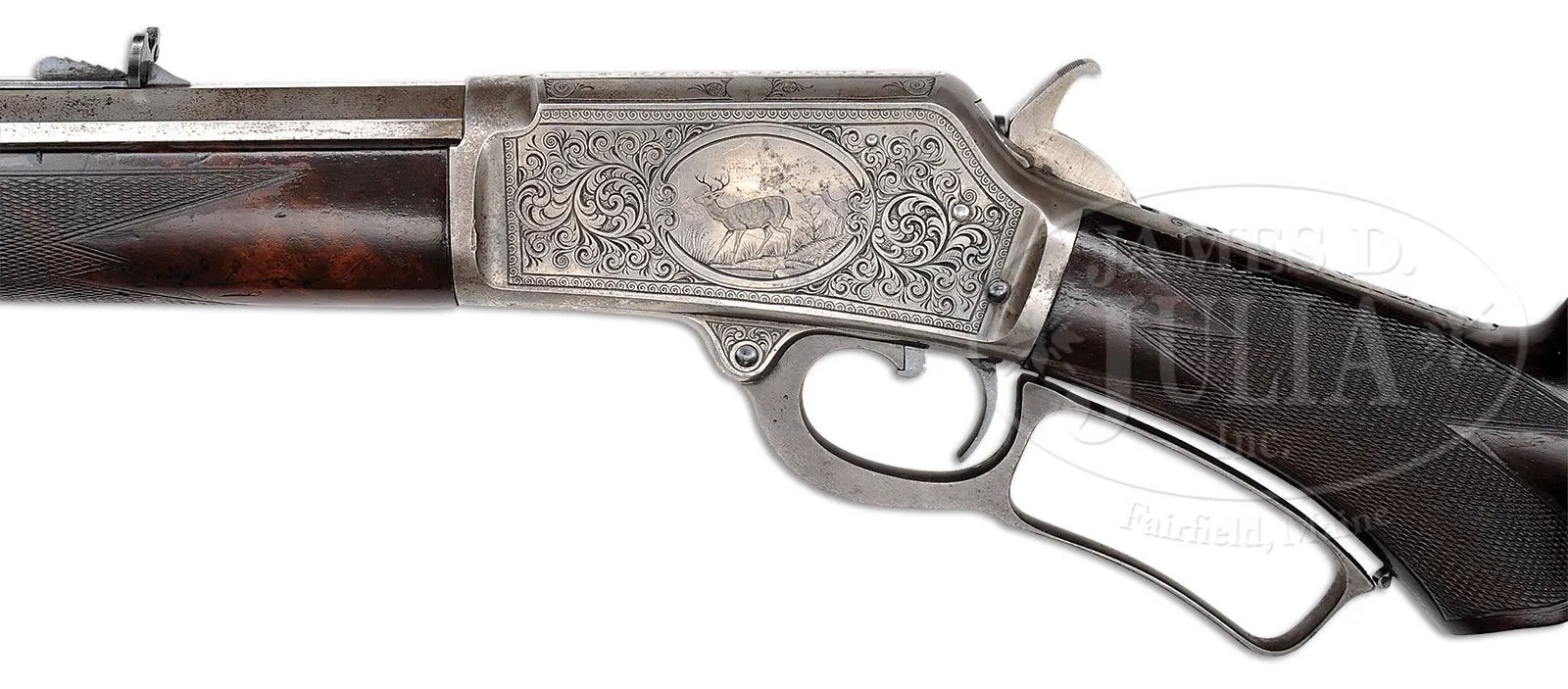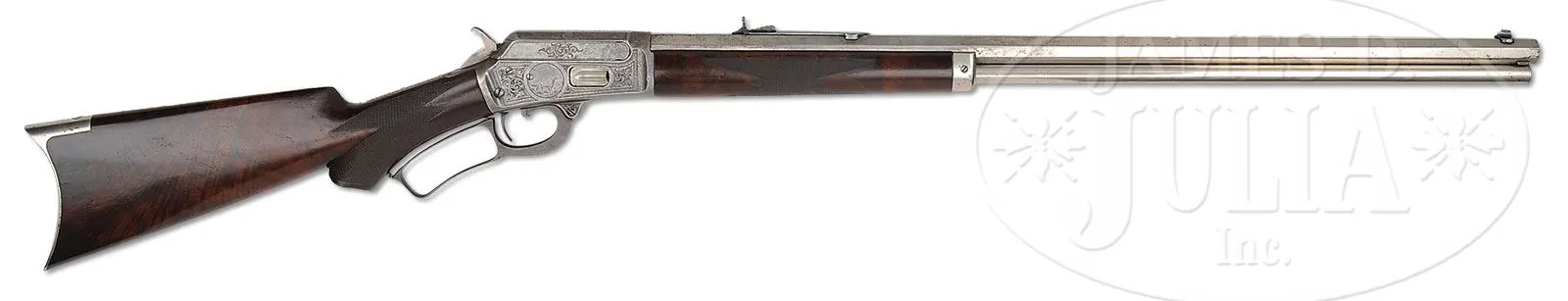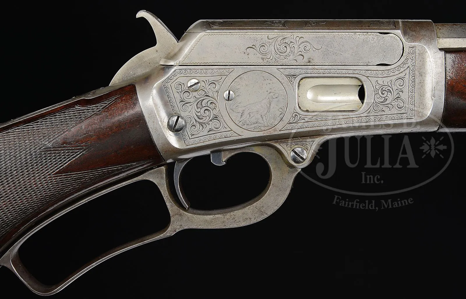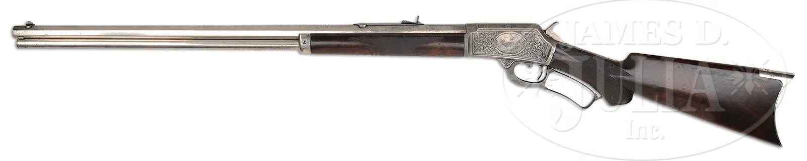 SN 76813. Cal. 38 WCF (38-40). Beautiful special order Marlin rifle with 26″ oct bbl, full magazine, slightly damaged front sight and semi-buckhorn rear sight. Mounted with very highly figured, center crotch, flame grain American walnut with B-style checkered forearm and serpentine grip buttstock and crescent buttplate. Receiver is beautifully engraved, probably by Conrad Ulrich, in #2/3 style which consists of the vignette of a whitetail buck & doe in a forest scene vignette on the left side and English Setter on point vignette on the right side. Both vignettes are surrounded by very fine foliate arabesque patterns and wavelet borders. Engraving extends over the top & bottom of the receiver and top tang. Bbl, magazine tube, forend cap, loading gate and buttplate are factory nickel finished. Receiver, lever & hammer are color case hardened. Accompanied by a Cody Firearms Museum/Marlin Firearms Co. letter which identifies this rifle in 38 caliber with 26″ oct bbl, shipped Apr. 29,1893. No mention of the deluxe wood, engraving or nickel trims is in the letter and is normal for Marlin records. According to Flayderman’s Guide to Antique American Firearms there were about 55,000 of this model produced in four calibers and a multitude of bbl lengths, of which only 3,729 were 26″. Of that small number very few were deluxe configuration and extremely few had special plating. This was Marlins first side eject rifle model and was very successful. These arms usually saw very hard service and are rarely found today with high orig finish. CONDITION: Fine. Bbl, loading gate, magazine tube & forend cap retain about 95% strong orig nickel with some minor flaking about mid-point on the bbl and on the forend cap; buttplate retains about 85% strong orig nickel; receiver, lever & hammer retain traces of case colors having mostly turned silver. Both front edges of the receiver have small dings. Wood is sound and retains most of its finish. Mechanics are fine; bright shiny bore. 4-51289 (12,500-17,500) – Lot 2138a