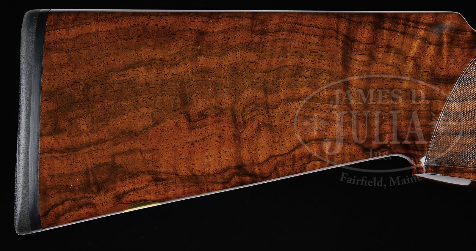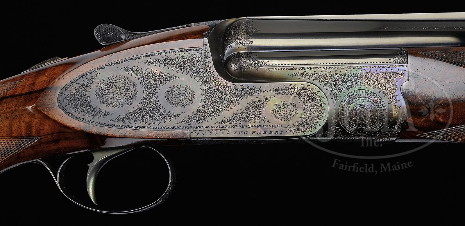 *IVO FABBRI TITANIUM ACTION PINLESS SIDELOCK EJECTOR SINGLE TRIGGER OVER-UNDER GAME OR PIGEON GUN WITH CASE.SN E1010. Cal. 12 ga. 2-3/4″ Chambers. Finely struck 28-3/8″ demi-bloc bbls are fitted with medium width file cut flat solid rib gold inlaid “1” at rear. Gun is one of a pair with “1” engraved at rear of top tang and on forend tip. Left side of top bbl is engraved “IVO FABBRI – BRESCIA”. “FABBRI SS 2002 STEEL” is on right. Bottom bbl flat is stamped with makers name, gauge, importer, SN, and 2007 Italian nitro proofs. Dark anodized low profile OU action with pinless sidelocks, is made of titanium, noted for its extreme strength combined with light weight. Action features automatic safety (SAFE engraved) and single non-selective trigger. Action and lockplates are engraved with classic small scroll and rose bouquets in “British Best” tradition. “IVO FABBRI” is on both sides of action under lockplates, and on bottom. Engravers signature (Creative Art) is on trigger plate. Small bow trigger guard has SN at grip. Exhibition quality, beautifully flame/ fiddle figured, well streaked, European walnut extreme pistol grip buttstock measures 14-5/8″ over thin black Decelerator pad. Well cut point pattern checkering with line border is at grip. A vacant gold oval is on toe line. Matching one piece full forend has gold pigeon sitting on branch inlet into wood at rear. Bore diameter: top -.733, bottom -.734. Bore restrictions: top -.011 (IC), bottom -.011 (IC). Drop at heel: 1-15/16″, drop at comb: 1-7/16″. Weight: 6 lbs 8 oz. LOP: 14-5/8″. High quality tan leather two gun motor case by Nizzoli has stitched leather corners. Case is lined in burgundy cloth and has Fabbri paper label in lid. PROVENANCE: Copy of letter from Tullio Fabbri stating that “they are the first pair of titaniums ever shipped to the U.S. These guns are the first choice of the King of Spain, and many other people that pride quality and performance above all.” He goes on to explain many of the special features and materials inherent in the making of Fabbri guns today, not only the titanium actions, but also including their special bbl steel, micro welded construction, and superior finishing, including a black colored diamond coating of the bbl surface. CONDITION: Excellent, essentially as new with little evidence of firing since proof, with only one or two of the lightest marks in all finishes on wood and metal, most notably two or three light scratches on butt. Mechanically crisp. Case leather is excellent, with a few scuffs. Interior is excellent. Fabbri is the creator of some of the finest guns in the world. The Titanium model currently starts at 125,000 euros in Italy without engraving. The light weight action of the Titanium model yields a gun with exceptional dynamics. Gun no. “2” of the pair is also in this auction. 49335-1 MGM90 (100,000-150,000) – Lot 2139 | Click here to view provenance