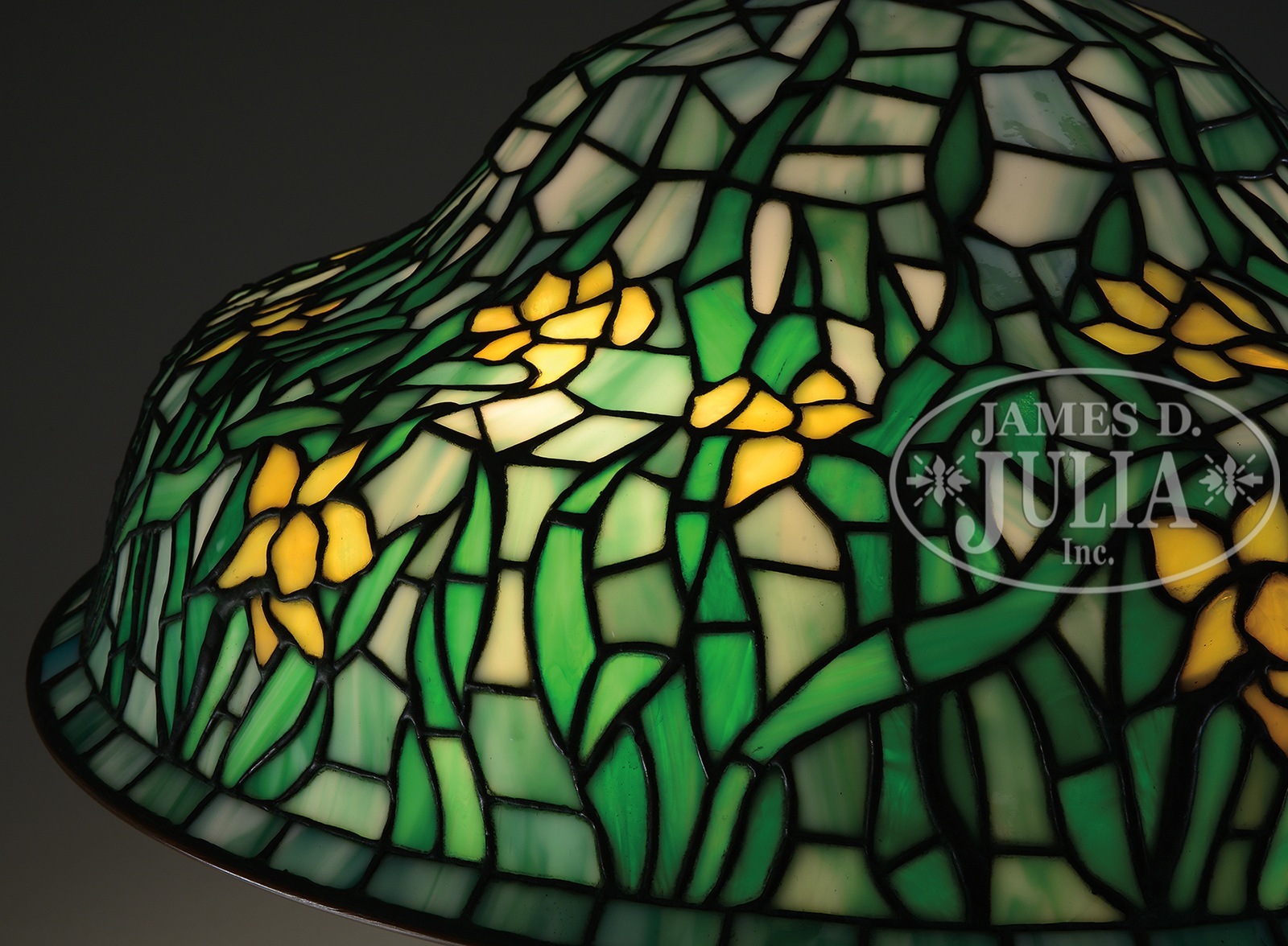 Gorham table lamp has leaded shade with pastel yellow daffodils and shaded green striated leaves surrounding the shade, all set against a white and green striated background. Shade rests on a heavy cast bronze base with swirling foot leading to vertically ribbed stem with knot center. Lamp is completed with a four-socket cluster and finished in rich brown patina with green highlights. Base and shade are unsigned. SIZE: Shade is 18″ dia. Lamp is 24″ t. CONDITION: Very good to excellent. 5-68787 (5,000-7,000) – Lot 2141
