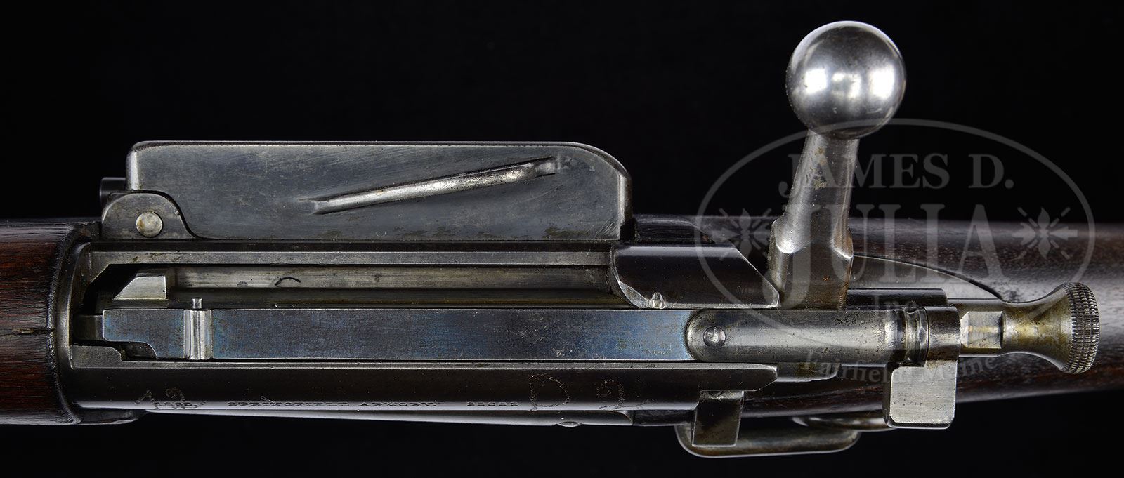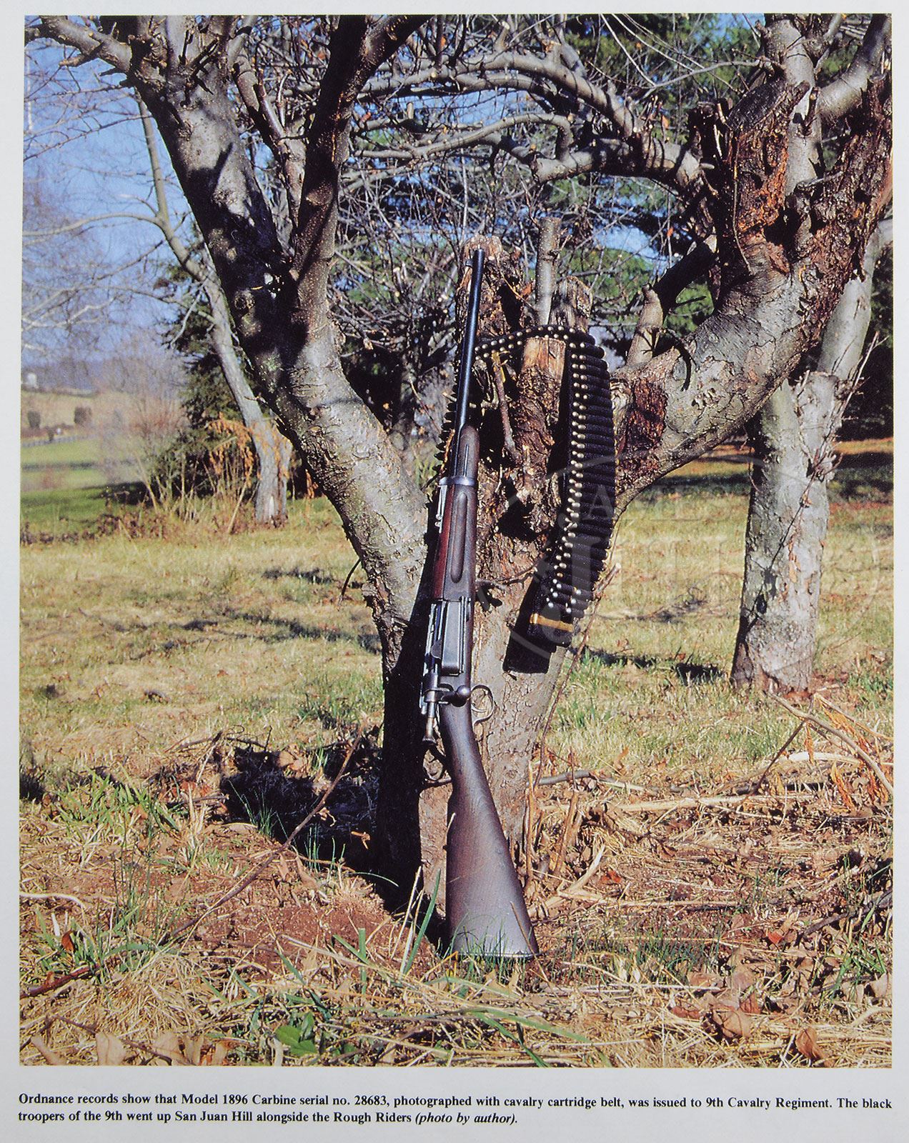 EXTREMELY RARE DOCUMENTED 1895 DATED KRAG CARBINE ISSUED TO A TROOPER OF THE 9TH U.S. CAVALRY WHICH UNIT FOUGHT IN CUBA.SN 28683. Cal. 30-40 Krag. Standard carbine with 22″ bbl, pedestal front sight and 2000-yd carbine ladder rear sight. Left side of receiver has the date 1895 with Springfield Armory markings and SN. Mounted in a 1-pc grasping groove carbine stock with short handguard and sight protective bbl band. Left side of stock has a sling bar & ring and left wrist of stock has a crisp 1898 cartouche. Buttplate is smooth with trap door. Left side of receiver has the electric pencil number “12” and “P2”. A letter from Springfield Research Service dated 2004 shows a listing of Krag carbines including this carbine, identified by SN as having been turned in from the 9th Cavalry on Jun. 14, 1900. The 9th Cavalry was a storied Black Cavalry unit who fought in Cuba and charged San Juan Hill alongside Col. Theodore Roosevelt and the Rough Riders. It is likely that this carbine participated in that battle. This carbine was pictured, in color, on pg 10 of the July/August 1989 issue of either Gun Report or Man at Arms. Extremely few documented Rough Rider arms have ever been offered for sale with most of those being Colt Single Action Revolvers. Incredibly few Rough Rider Krag carbines have ever come to light. PROVENANCE: 9th U.S. Cavalry. CONDITION: About fine. Bbl retains about 95% arsenal restored blue with scattered spots of pitting; receiver is mostly a smooth blue brown patina with mottled case colors on side plate and cartridge box. Hand guard has a crack, otherwise wood is sound with usual nicks & scratches and retains a smooth hand worn patina. Mechanics are fine; bright shiny bore. 4-47943 (6,000-10,000) – Lot 2141 Click here to view provenance