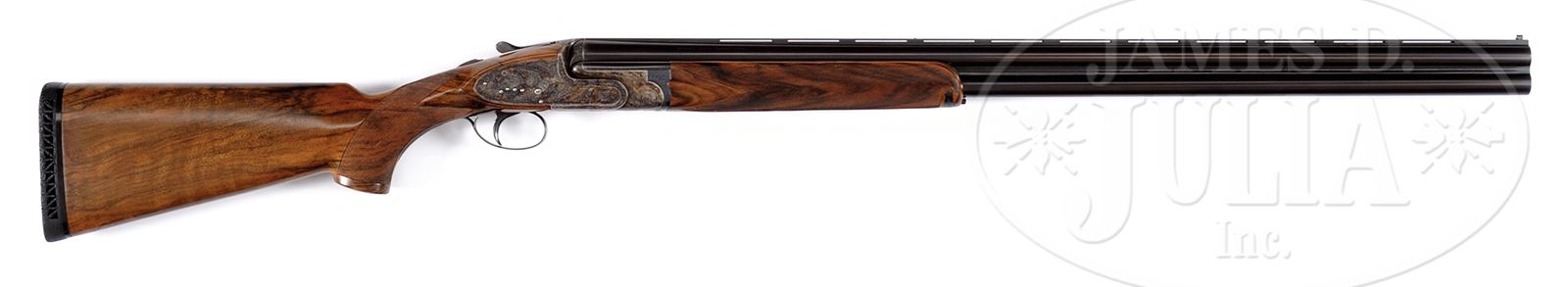 *CLASSIC IVO FABBRI SIDELOCK OVER-UNDER PIGEON GUN ENGRAVED BY ALBERTO PASOLINI WITH CASE.SN E564. Cal. 12 GA 2-3/4″ Chambers. Finely struck 30″ demi-bloc bbls are fitted with low, broad, file cut, ventilated rib and engraved “IVO FABBRI BRESCIA ITALY” on top left, and “BOEHLER BLITZ SUPER STEEL” on right. Bbl flats are stamped with 1980 Italian nitro proofs. Importers name and address (Buckhorn Trading Post, Dallas Texas) are marked on right side of bottom bbl under forend. Finely sculpted, case hardened, low profile, OU action fitted with sidelocks, features non-functional safety, non-selective sgl trigger, vented breechfaces, and incised line tumbler end cocking indicators. Action is engraved in classically styled, well cut, rose and scroll. “IVO FABBRI BRESCIA” is on bottom of action. Engravers signature (Alberto Pasolini) is on right side of trigger plate. Top lever and trigger guard with matching scroll engraving are blued. SN is at grip. Nicely veined and lightly fiddle figured European walnut pistol grip buttstock measures 14-3/4″ over black open sided Fabbri marked pad. Matching, slim, 1-pc forend with Anson type release, is nearly fully checkered, and has flush gold inlaid pigeon on bottom rear. Bore diameter: top -.725, bottom -.726. Bore restrictions: top -.038 (full), bottom -.026 (Imod). Drop at heel: 1-1/2″, drop at comb: 1-9/16″. Weight: 8 lbs 0 oz. LOP: 14-3/4″. Well made tan leather case with stitched leather corners is lined in scarlet velvet, and contains a key. CONDITION: Excellent, showing very limited use, near new, with only a few light handling marks, and a hint of silvering on action. Mechanically crisp. Ejectors are perfectly timed. Case is very fine, with a number of marks and scuffs. Straps and handle are fine. Interior cloth is very fine with some marks, compressions, and light soiling. Although understated, this gun is of the exceptional quality typical of Ivo Fabbri. 49181-14 MGM263 (40,000-70,000) – Lot 2141
