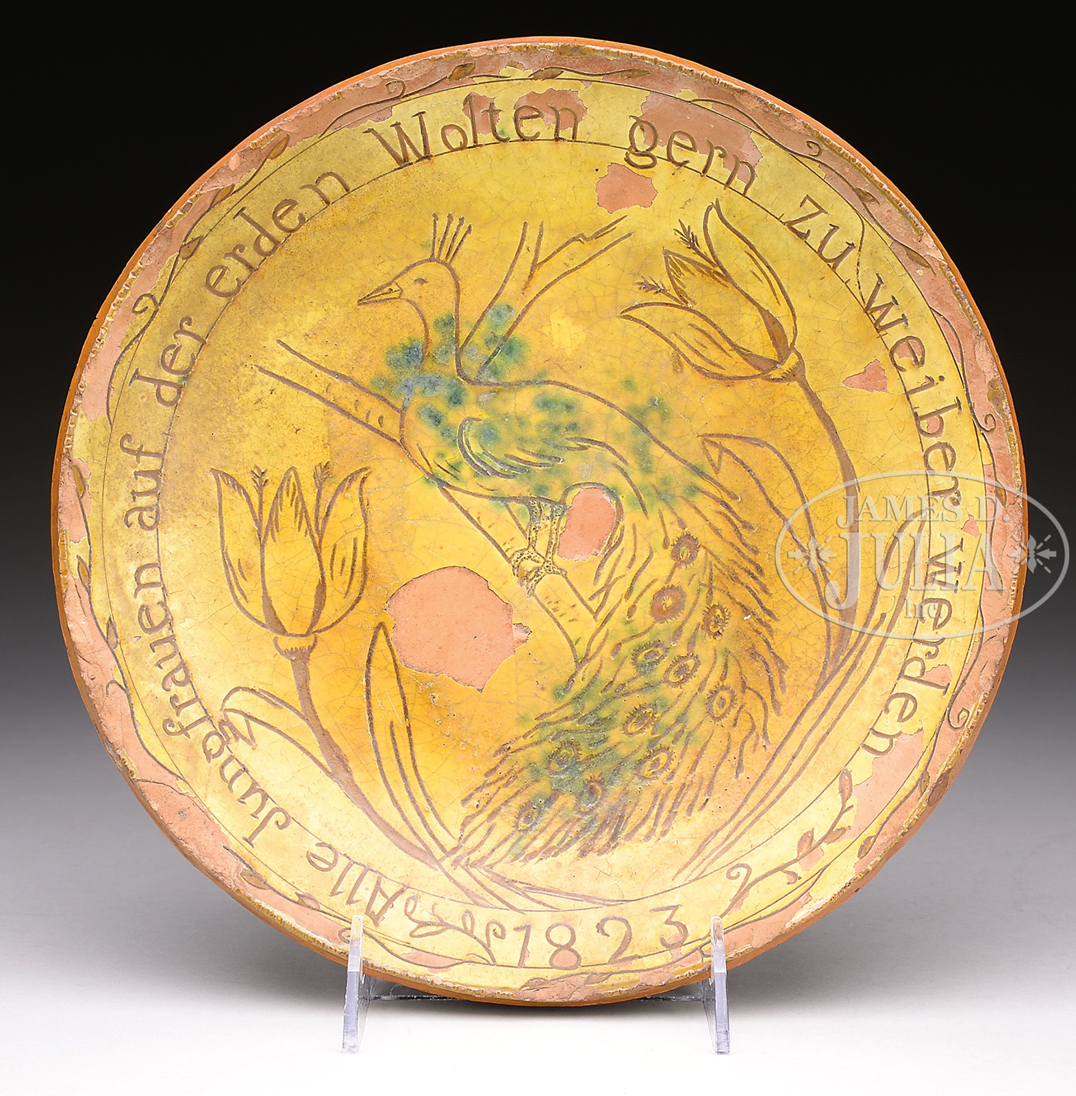 OUTSTANDING REDWARE SGRAFFITO PLATE WITH TULIPS AND PEACOCK.Southeastern Pennsylvania, 1823. Plate having outer circle with German writing and date as follows “Alle Junofrauen auf der erden Wolten gern zu weiber werden 1823″ (All the young women on the earth, would willingly become wives). Interior having full bodied peacock perched on branch flanked by tulip on each side. Peacock is highlighted in rare blue/green spot glaze against yellow/gold background. SIZE: 10” dia. CONDITION: Craquelure to glaze, some large glaze chips in background and on edge, small chipping on rim, no cracks or repairs. 49831-1 (4,000-6,000) – Lot 2143