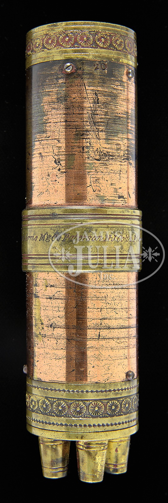 EXTREMELY RARE FRENCH ROYALTY CASED COLT PATERSON NO 3 BELT MODEL WITH MATCHING NUMBERED 12″ BARREL OWNED BY PRINCE FERNINAND-PHILIPPE, SON OF KING LOUIS-PHILIPPE I, HEIR TO FRENCH THRONE AND THE DUKE OF ORLEANS.SN 549. Cal. 34. Blue & color case hardened with 4″ & 12″ oct bbls that have German silver blade front sights and are marked with the address “Patent Arms Mg Co Paterson N-J Colt’s Pt.” with small bow tie at each end. Bbl lugs are flat on the sides where they meet the frame. Cyls are unfluted with rnd shoulders and have the Centaur scene roll marking. Mounted with 1-pc, nicely figured walnut grip that has the number “695” on the bottom left edge. SN was observed on the rear face of each bbl, wedge, rear face of both cyls, right side of frontstrap under the grip & inside backstrap. Additionally, on the cyl rotating ring no additional disassembly was effected to check for other matching numbers. Accompanied by a fine orig Colt mahogany casing with fluted lid and an empty escalloped, rectangular German silver plate in the lid. Interior is burgundy velvet lined and recessed in the bottom for the revolver and an orig brass & copper charger. It is fitted with steal wire brackets to hold the accompanying brass capper and combination loading tool/screwdriver/nipple pick with steel pins to retain the single ball bullet mold that has 3 turned walnut handles with brass ferrules and to retain the spare bbl at the front of the case. The charger has the number “20” on each end of the copper tube and on both the brass bullet & powder rings. The center brass band is roll marked with the same address as is found on the bbls. The capper has the number “255” inside the lid and on the body. Also accompanying in the case is an orig Paterson brass cleaning jag with turned walnut handle that is 13-1/2″ overall length. The spare cyl is retained in the right rear corner on a wooden dowel. Only about 800 of these #3 Belt Model Paterson revolvers were produced in the period 1838-1840 and, to date, only 7 sets are known with the matching numbered 12″ bbl. This exact gun is illustrated and described on pg 15 of “The Colt Engraving Book Volume One”, R. L. Wilson. “From the private collection of Ferdinand-Philippe, The Duke of Orleans, heir to the French throne and son of King Louis-Philippe. Cased Paterson No. 3 Belt Model; serial number 549. 4-inch barrel, with extra 12-inch barrel, and extra cylinder, with full accessories. Varnished select walnut grips. One of only three known cased No. 3 Belt Models with extra barrels in private hands and one of only five known examples”. Prince Ferdinand-Philippe, Duke of Orleans was the son of Louis Philippe the Duke of Orleans and the future King Louis Philippe I of France. Prince Ferdinand-Philippe was born Sept 1810 in Sicily while his parents were in exile. He returned to France in 1817 where he gained an education under tutors. He was a good student and took courses at the Ecole Polytechnique. In 1819, he joined the military and in 1824, King Charles X made him a Colonel and the title of Royal Highness. In 1830, at the French Revolution, his father became King of France and Prince Ferdinand-Philippe became the Duke of Orleans, Prince of Orleans and also became Prince Royal, the heir apparent to the throne. In March 1832, he was granted the annual income of $1,000,000 Francs. From 1831 to 1840 Ferdinand-Philippe led his military command fighting in Belgium where he proved himself a courageous and able commander. In 1835, he went to Algeria to fight the Arabs where he was wounded. He remained in Algeria until 1836 before returning to Paris and then back to Algeria in 1839 and again in 1840 participating in a number of battles. With his brilliant military career, his popularity and prestige greatly increased. Ferdinand-Philippe was a descendant of King Louis XIII who began what would become an extraordinary collection of firearms collection that soon numbered into the hundreds. Ferdinand-Philippe himself was a passionate collector, painter, draftsman and collector of porcelains. It was undoubtedly during or around his military activities in Algeria that he acquired, probably was presented by Col. Colt, this magnificent set. Ferdinand-Philippe died in a carriage accident in July 1842 before assuming the throne. Accompanied by a 10-pg letter from renowned author and Colt historian R. L. Wilson describing this pistol and with some history of the Duke of Orleans and the rarity of this set. He also lists all of the other known sets with 12″ bbls. In the 1990’s the Duke of Orleans one of the last Royal family collections of France was dispersed. The Duke’s firearms collection was gifted to the country of France. Non-French arms and other family effects were sold at auction by Millon & Associes. A copy of “Millon & Associes Armes” auction catalog from June 8, 1999 selling the contents of Chauteaux de Randan including Paterson SN 549 and a 50mm bronze 1837 dated medal of the Duke Ferdinand-Philippe, “Duc de Orlean’s” elegant profile with his betrothed. According to R. L. Wilson’s research, this medal was given to the Duke by the city f Paris. PROVENANCE: Prince Ferdinand-Philippe; Lot 107 June 8, 1999 Millon & Associes Armes, Paris; Page 15 Wilson “The Colt Engraving Book Vol.”; Dr. Joseph Murphy; private collection, 2009. CONDITION: Extremely fine plus, matching as noted above. 4″ bbl retains 95-96% glossy orig factory blue with some minor flaking on right side of muzzle. Frame & hammer retain most of their orig case colors, strong and bright on right side; moderately faded on the left. Front strap & backstrap are mostly silver patina with strong case colors on the buttstrap. Grip is sound with a few minor nicks and retains most of its orig varnish. Mechanics are tight. Strong bright bore with some minor roughness at the breech end. Cyl in the revolver retains about 98% glossy orig blue and about 99% Centaur scene r