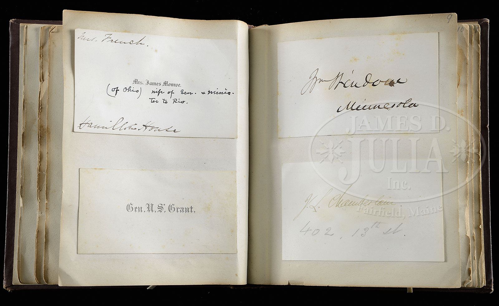 AUTOGRAPH ALBUM WITH SIGNED CARDS. Album contains about 45 laid-in cards of Congress & political figures including: Andrew Johnson signed as Gov. of Tennessee; John A Logan signed as Senator previously Union Gen.; John B. Gordon, Senator from Georgia and previous Confederate General; Calling card of “Mr. & Mrs. Stephen A. Douglas” (not signed); Joshua L. Chamberlain, Civil War General & Gov. of Maine; Printed calling card of General U.S. Grant; Ambrose E. Burnside of R.I.; Printed calling cards of Joshua Chamberlain & Hannibal Hamlin; Samuel Maxey of Texas previous Confederate General; and many others of less renown. SIZE: 6″ x 5″. CONDITION: Good, some foxing, glue discoloring. 9-90945 (500-700)