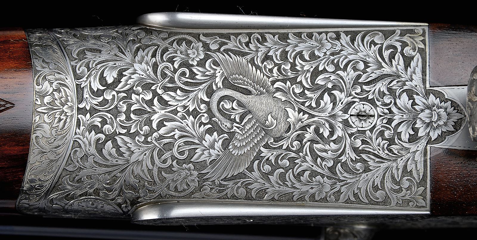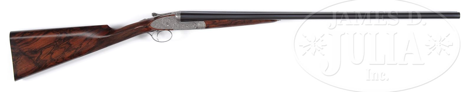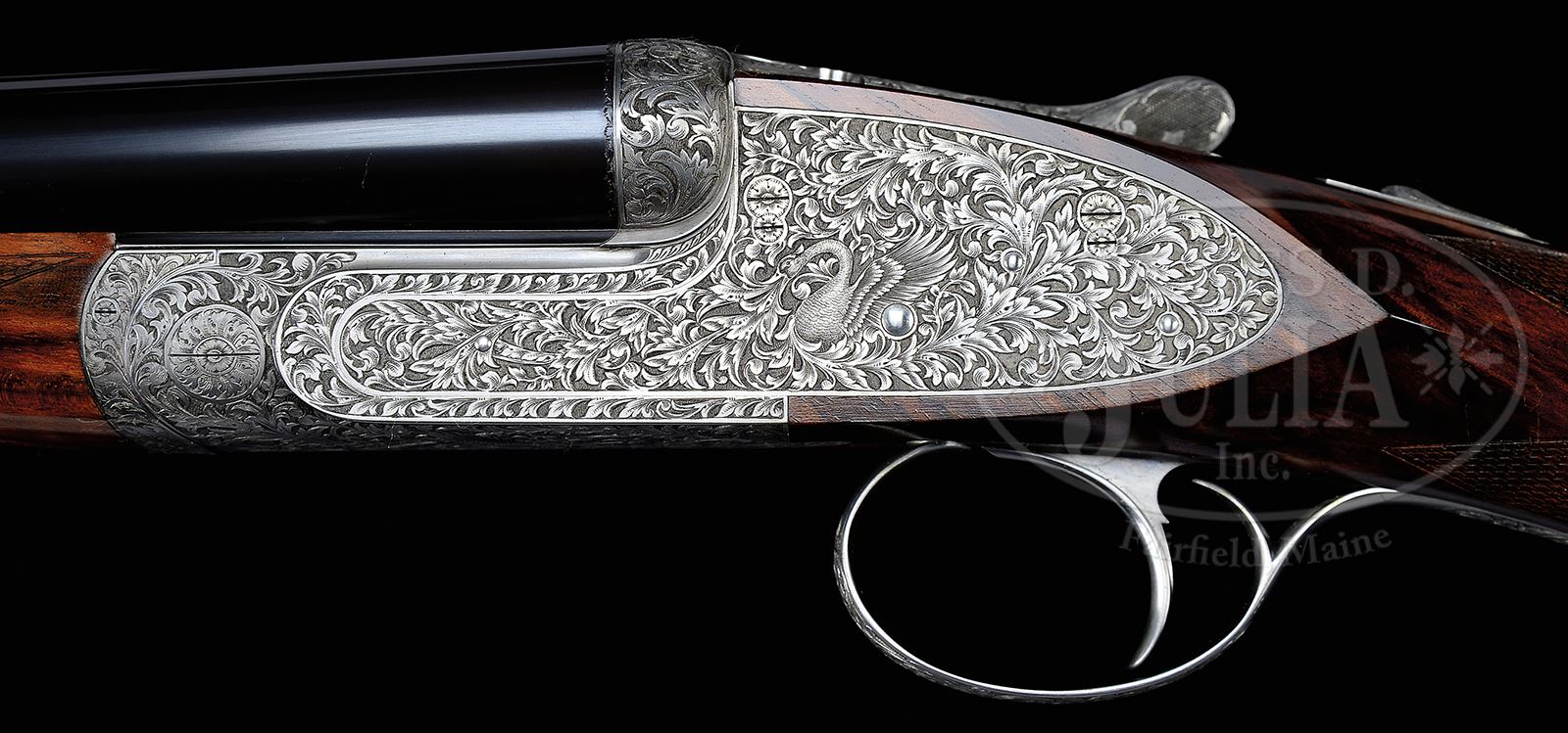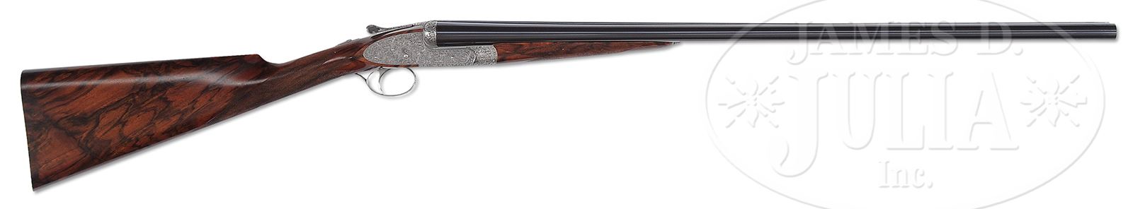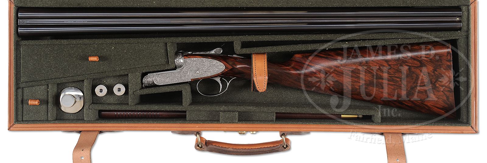 *SUPERB FLLI RIZZINI R1-E 20 BORE GAME GUN WITH EXCEPTIONAL SWAN THEME ENGRAVING BY MUFFOLINI WITH CASE.SN 2230. Cal. 20 ga. 2-3/4″ Chambers. Beautifully struck 28″ chopper lump bbls are engraved “Flli RIZZINI – MAGNO V.T.” on narrow, game rib. Bbl flats are stamped with year 2000 Italian nitro proofs. Bottom of right bbl is engraved with importers name (William Larkin Moore). Coin finished, sidelock action features non-automatic safety and single non-selective trigger. It is engraved with full coverage truly exceptional semi-relief climbing and trailing open acanthus and scroll. This exceptional engraving melds into central motif of quartering portrait of swan, wing outstretched, on each lockplate. Bottom of action portrays this same swan face on. Fences are more deeply carved with scroll and acanthus. This theme extends to top lever and trigger guard. SN is on tang. This striking engraving is by noted Italian engraver Stefano Muffolini, whose signature is on trigger plate. Beautifully marbled and lightly figured red-toned European walnut straight grip buttstock measures 14-7/8″ over skip line checkered wood butt. Stock shaping is flawless with sharp fields around lockplates, and crisp transition to grip, which is checkered in very well cut flat top borderless point pattern. Matching splinter ejector forend has Anson release. Bore diameter: left -.630, right -.632. Bore restrictions: left -.015 (mod), right -.009 (IC). Drop at heel: 2-1/8″, drop at comb: 1-7/16″. Weight: 6 lbs 3 oz. LOP: 14-7/8″. High quality tan leather case with stitched leather corners has green canvas outer cover with russet leather trim. Interior is lined in olive green felt, and has large paper Rizzini label in lid, along with info label for this gun. Case contains 2-pc walnut and brass cleaning rod with mop, brush, and jag (still in tissue), a pair of snap caps, and a round oil bottle. CONDITION: Essentially as new, appears unfired since proof, with only the faintest of light handling and assembly marks on wood and metal. Case leather is excellent, as protected by its outer cover, which has some scuffs and rubs. Interior is excellent. This esteemed maker produces fewer than a dozen guns each year, with a tariff of approx $100,000.00 each before engraving. 49417-21 MGM363 (65,000-95,000) – Lot 2144