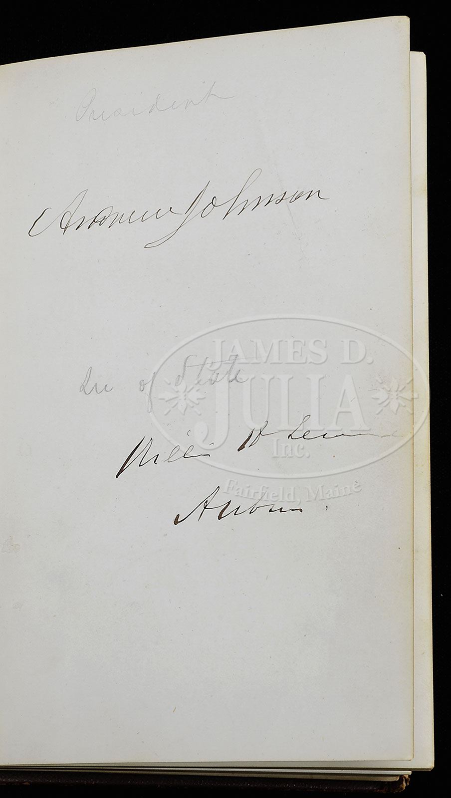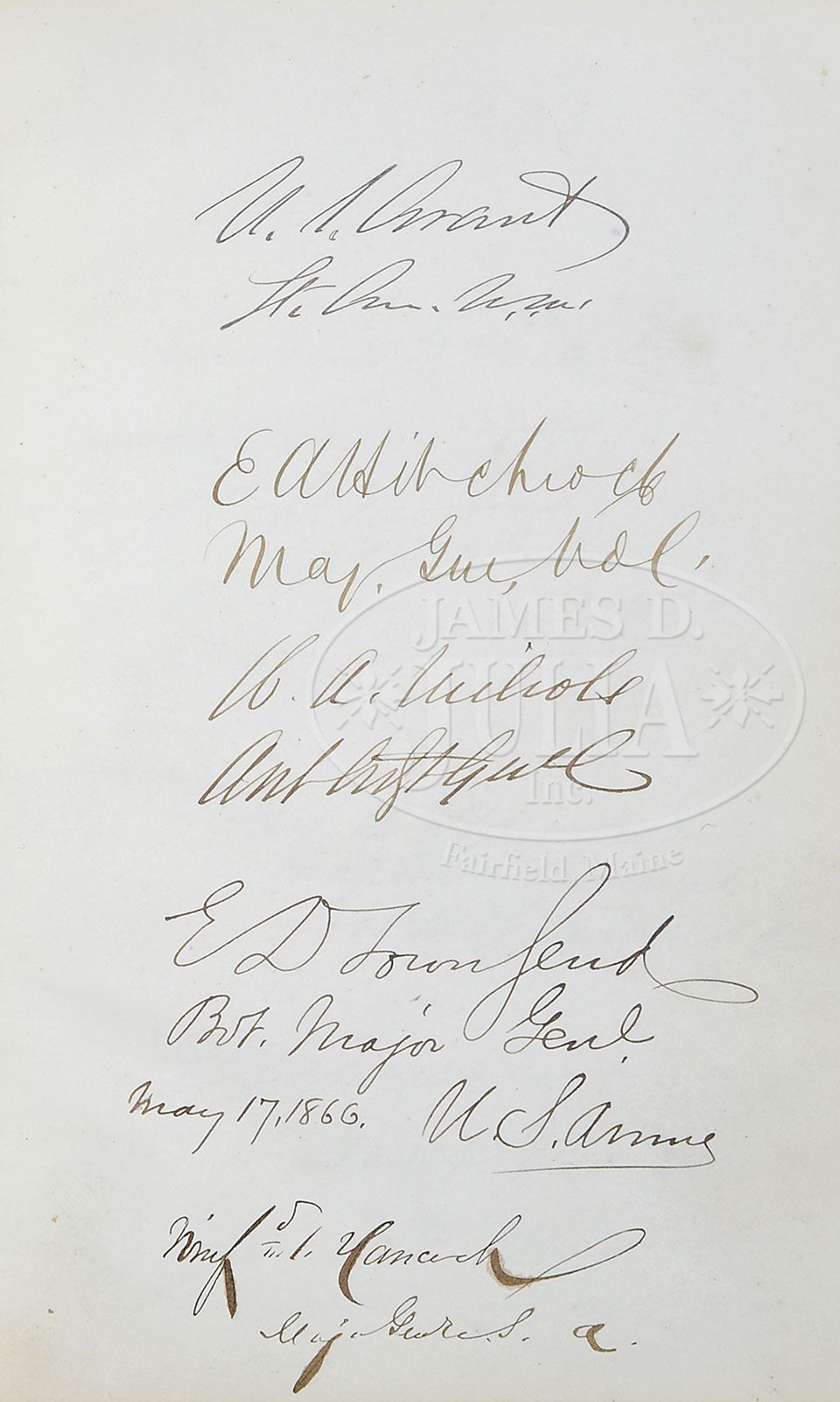 ALBUM OF 250+ AUTOGRAPHS DURING THE ANDREW JOHNSON ADMINISTRATION, 1866-67. Signatures of President Andrew Johnson, of most of his cabinet including Gideon Welles and Edwin Stanton. There are over 250+ autographs in this album including many Senators & House members and also such notables as Ulysses S. Grant, Lt. Gen; E.A. Hitchcock, Maj. Gen.; E.D. Townsend, Adj. Gen.; Winfield Scott Hancock, Gen.; Quincy A. Gilmore, Gen; C.C. Auger, Gen.; O.O. Howard, Gen.; David Hunter, Gen.; Horace Porter; E.S. Parker; & other notable Civil War Officers. Most Congressmen of the Andrew Johnson Administration are found although we did not check all 250+ autographs. CONDITION: The album has some worn edges, generally good. Autographs are strong and very good. 9-90942 (1,000-2,000)