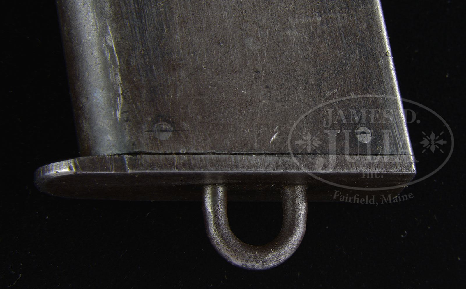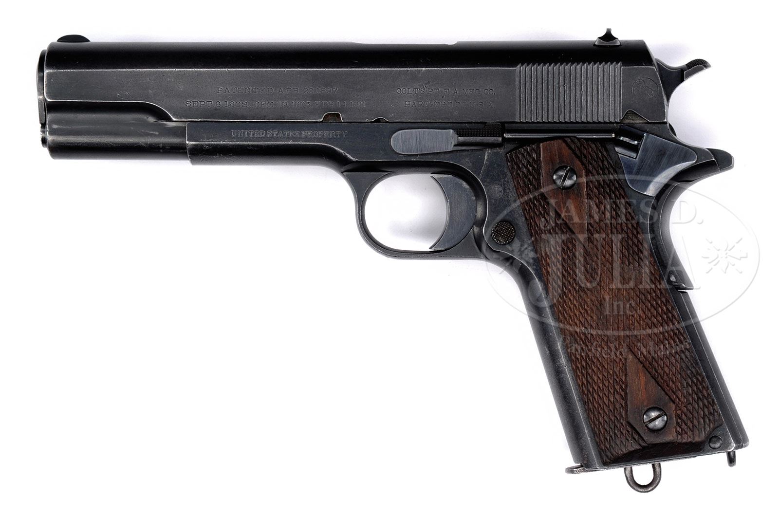 *RARE 1ST NAVY CONTRACT COLT MODEL 1911 SEMI-AUTO PISTOL.SN 810. Cal. 45 ACP. Blue finish with 5″ bbl, orig fixed sights with thin front blade and rnd top rear sight. Slide has standard markings on left side with “1911” last patent date and rampant Colt in a broken circle. Right side of slide is marked “MODEL OF 1911 U.S. NAVY”. Left side of frame has the “WGP” (Major Walter G. Penfield) inspector initials. Right side of frame has the SN in the forward position and is stamped hand “DEL” just forward of the slide lock stud hole. Mounted with diamond checkered walnut grips and accompanied by an extremely rare, orig, 2-tone, 1st Model lanyard loop magazine with exposed base. This pistol was part of the very first Navy contract in 1912. Very few of these early pistols survive today with most either lost at sea or altered in some manner, many of which were accurized for target shooting. Pistol has early attributes including short grip safety. CONDITION: Very good. Overall retains about all of a re-dipped finish with fine pinprick pitting around left grip and numerous small nicks on the slide & front strap; slide lock & thumb safety may be replacements. Mechanics are fine, worn bore with fine pitting. Magazine is mostly a light blue/gray patina. 4-55333 (4,000-7,000) – Lot 2145