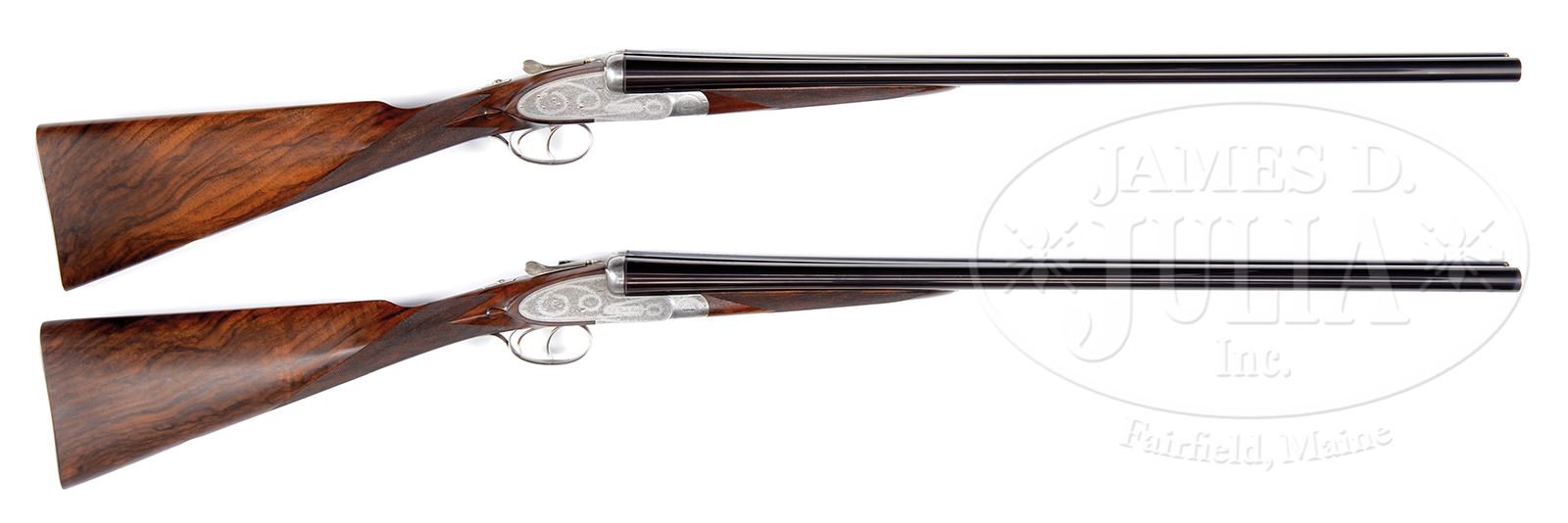 *NICELY MATCHED PAIR OF PIOTTI “KING – 1” SIDELOCK EJECTOR GAME GUNS MADE FOR J. RIGBY & CO WITH CASE.SN 8863/ 8864. Cal. 12 ga. 2-3/4″ Chambers. 28″ Chopper lump bbls with swamped, narrow game ribs, have gold inlaid “1” and “2” at rear portions. Guns are a true pair with “1” and “2” gold inlaid on top levers and forend tips. Bbls are engraved “Made for J Rigby & C. London” and “By Fratelli Piotti of Gardone V.T. Italy”. Bottoms of bbls are stamped with 1990 Italian nitro proofs for 2-3/4″ chambers. Coin finished sidelock actions feature automatic safeties (S inlaid in gold), raised arrow tumbler end cocking indicators, and double triggers (front “loose”). Actions and lockplates are engraved with well cut traditional small scroll with rose bouquet highlights. Coin finished single beaded trigger guards have SNs at grips. “Flli. Piotti Italy” is on each lockplate. Well matched, dark veined and lightly figured European walnut straight grip buttstocks measure 15-1/2″ over fully checkered wood butts. Stocks feature drop points, diamond hands, closely spaced borderless point pattern checkering, and .585 marked gold ovals engraved with initials “JWS”. Matching splinter ejector forends have Anson releases. BBL set no. “1”: Bore diameter: left -.727, right -.727. Bore restrictions: left -.025 (Lt Mod), right -.014 (I mod). Drop at heel: 2-1/4″, drop at comb: 1-1/2″. Weight: 6 lbs 11 oz. LOP: 15-1/2″. BBL set no. “2”: Bore diameter: left -.727, right -.727. Bore restrictions: left -.027 (I mod), right -.016 (mod). Drop at heel: 2-1/4″, drop at comb: 1-1/2″. Weight: 6 lbs 11 oz. LOP: 15-1/2″. High quality brown leather 2- gun motor case with stitched leather corners is embossed “J.W.S.” on top. Case is lined in burgundy cloth and has gold embossed black leather Rigby label in lid. Case contains 2-pc rosewood and brass cleaning rod and a Rigby bench cloth. CONDITION: Excellent, showing evidence of little use, with light cartridge halos on breechfaces. Most finish loss on bbls is due to contact with forend during firing. There are a few scattered light marks. Coin finish is excellent, as are stocks, with only a few handling marks in their hand rubbed oil finish, and slight compressions to checkering on butts. Bores are excellent. Actions are tight. Ejectors are strong and in time. Case leather is excellent with a few light rubs and some small dots of white paint. Straps and handle are excellent. Interior cloth and label are excellent. Cloth lightly soiled. A great pair of classically styled game guns with a current retail of over $39,000.00 each. 49305-3 MGM146 (25,000-35,000) – Lot 2145