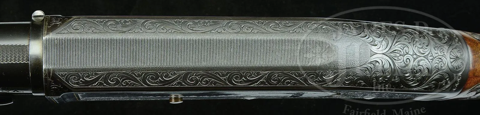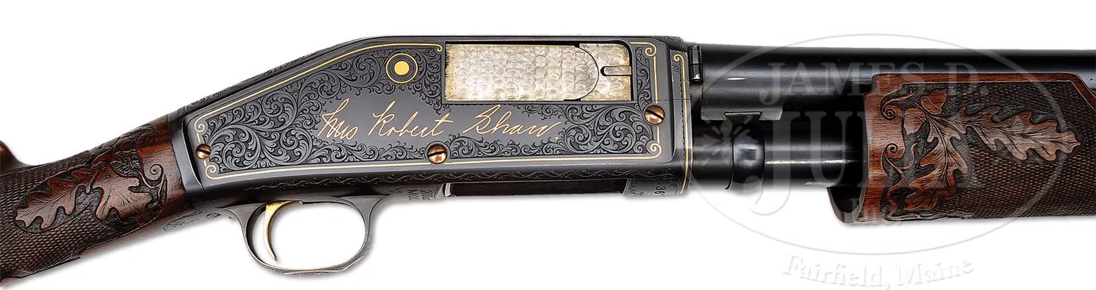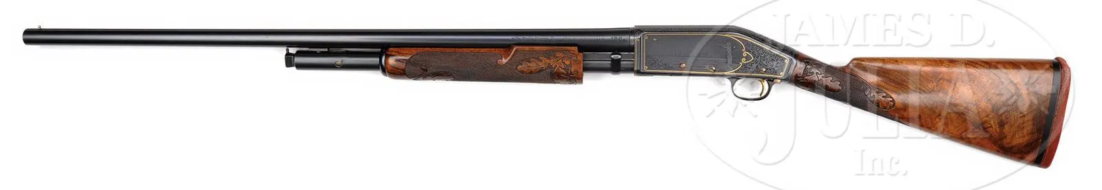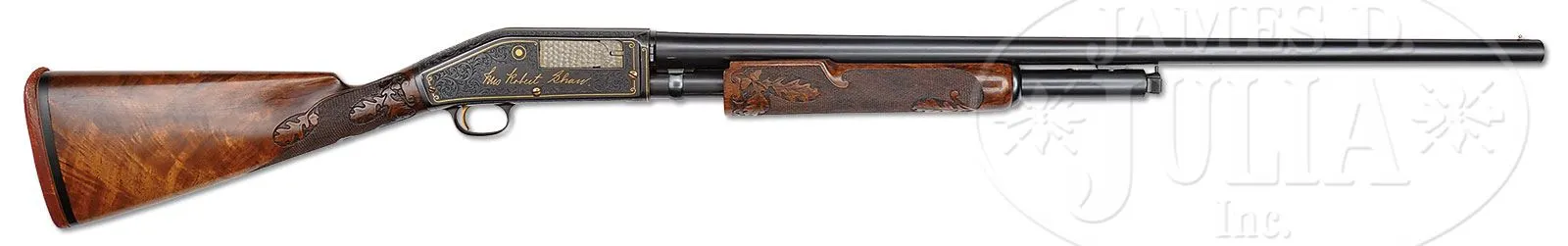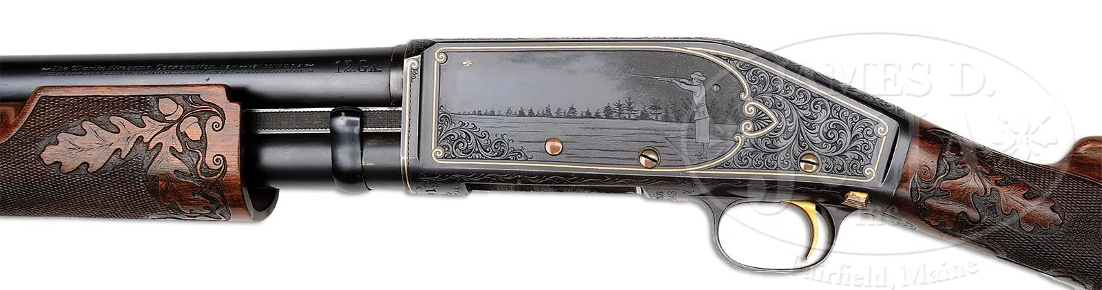*EXTREMELY RARE ONE-OF-A-KIND SPECIAL FACTORY ENGRAVED MARLIN MODEL 43TS PUMP ACTION SHOTGUN.SN 3671. Cal. 12 Gauge. Most rare of the Marlin shotguns this Model 43 Trap Special shotgun has a 30″ full choke bbl, matted top and single silver bead. Mounted with exceptional French walnut, checkered & carved with oak leaves & acorns. Forearm is the extended style with matching checkering & carving. Buttstock has a straight grip and an old solid red pad. Receiver has exceptional engraving probably by Alden George Ulrich with the very large vignette of a lady shooting trap with trees in the background and very fine shading behind the lady’s image. It depicts a broken clay bird inlaid in gold. Right side is inlaid in gold script “Mrs Robert Shaw”. Right side also has an engraved & inlaid image of a clay bird with gold center and gold wire outline. Both side panels are surrounded by very fine, intertwined foliate arabesque patterns with very fine shaded background and gold wire borders. Engraving extends over the top & bottom of the receiver and on to the trigger guard which is also inlaid with gold wire in an elliptical pattern. Top of the receiver has a serrated concave groove surrounded by fine hand applied matting. Screw heads, trigger & slide release are all gold plated. This shotgun is pictured, both sides, on p.394 of the book Marlin Firearms, Brophy with credit to the Lewis & Leyton Yearout Collection. Accompanied by the orig bill of sale to Mr. Yearout from the late Chris Anderson of Carson City, NV, dated Nov. 1 , 1973. Additionally accompanied by Mr. Yearout’s Collection inventory card which also shows the date and from whom he purchased it. According to the referenced publication in a chart on p.396 the Model 43TS cost 100.00 in 1922 and maintained that price right through the end of production in 1930. The bbl address on this shotgun is for the “The Marlin Firearms Corporation” which was used only 1922-1924 at which time it was changed to “The Marlin Firearms Company”, which was used 1925-1930. This shotgun is extraordinarily special and suitable for the most discerning collector or museum collection. PROVENANCE: Estate Collection of Lewis & Leyton Yearout. CONDITION: Extremely fine, plus. The metal overall retains about 99% crisp orig factory blue with only some tarnishing of screw heads and wear on the trigger face. Forearm has a small dent & crack in the bottom rear edge, otherwise wood is sound with light handling & storage nicks and retains most of its orig varnish with some darkening around the wrist. Mechanics are crisp; bright shiny bore. 4-53912 JR101 (7,500-12,500) – Lot 2145a Click here to view provenance