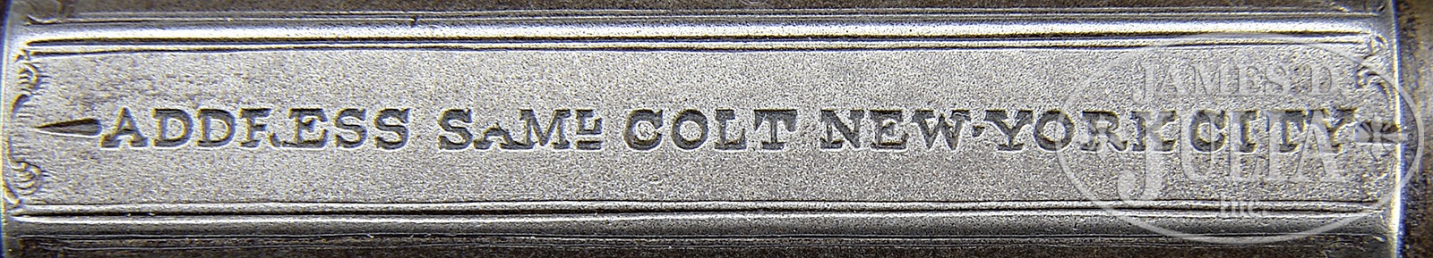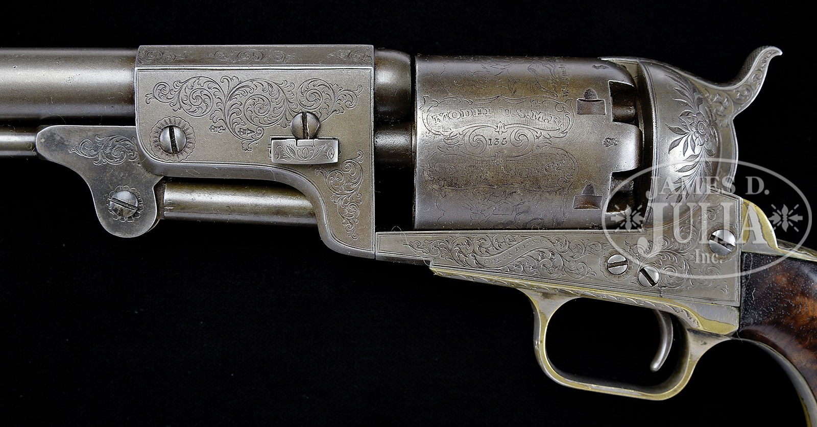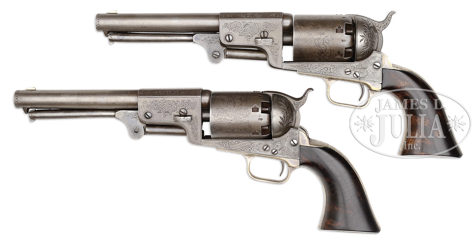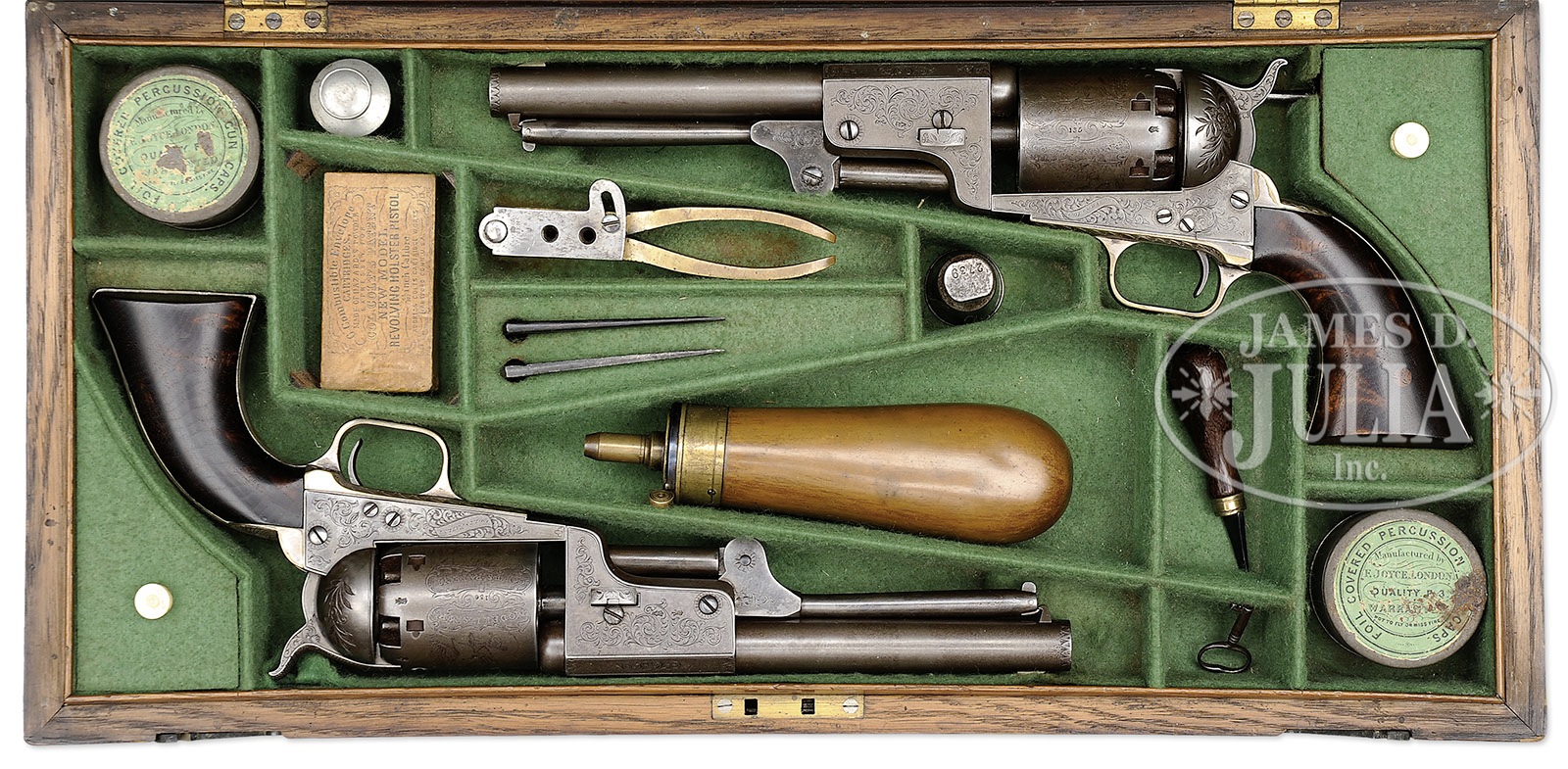RARE CASED ENGRAVED PAIR OF HARTFORD/LONDON 3RD MODEL DRAGOON PERCUSSION REVOLVERS- NRA SILVER MEDAL No. 283.SN 135 & 136. Cal. 44. Revolvers are virtually identical with 7-1/2″ oct to rnd bbls, German silver front sights and New-York City right hand addresses with brackets. Left sides of frames are engraved “COLTS PATENT” in ribbons. The silver-plated brass trigger guards and backstraps contain highly figured, 1-piece oil finish walnut grips. Cyls and bbl lugs have English proofs. They are similarly engraved in English style with light foliate arabesque patterns in about 50% coverage without background shading. Hammer screws are engraved with large rosettes, recoil shields are engraved with foliate and floral patterns. Foliate arabesque patterns extend over the bbl lugs and top side flats, onto the rammer pivot and leaf and vine patterns on rammer handles. The 2 rammer screws also have engraved rosettes. Rammer screw on #135 enters from the left and on #136 from the right. Cyls have usual 6 chambers with Dragoon/Indian fight scene roll marking. The “MODEL U.S.M.R. AND COLT’S PATENT” panels appear to have been hand enhanced. Accompanied by an original, brass-bound, green felt lined, English oak casing with empty medallion in the lid and swinging latches with a mortised lock in the front. Period original casing originally designed for 8″ revolvers, now housing these 7 1/2″ guns. Inside the lid has an original Colt’s directions for loading and cleaning label. Bottom is compartmented for two revolvers, a Barlow bag shaped flask with graduated spout, a brass Colt’s patent 2-cavity mold with bright sprue cutter and bowed handles with an “S” inspector mark on the right side, 2 large tins of Joyce caps, 2 L-shaped nipple wrenches, a sealed packet of 6 combustible cartridges, a pewter oil bottle, a military-style steel oil bottle, a wood handle cleaning rod, 7 spare nipples and a small turn screw. Also accompanied by an NRA sliver medal awarded for one of ten best arms displayed at an NRA meeting. According to The Book of Colt Firearms, Wilson, there were only about 700 Hartford/English Dragoons produced in the period 1853-1857. He speculates that there were about 150 of those 700 that were engraved. It is well recorded that there were 73 engraved English dragoons returned to the US in September, 1861, just at the onset of the Civil War. Simple extrapolation of the estimated numbers shows that probably fewer than 80 English dragoons were sold in England. This pair of revolvers is pictured on pg. 149 of Colt Engraving, Wilson; pg 236 The Colt Engraving Book Volume One, Wilson; pg 62, plate 35 Samuel Colt Presents, Wadsworth Atheneum; pg 70 of Colt’s History & Heroes, Hamilton and pg 98 The Book of Colt Firearms, Wilson. None of the illustrations show a case. PROVENANCE: Johnie Bassett Collection; J.P. Altmeyer Collection; George Allen Collection; Robert Q. Sutherland Collection; Arnold Marcus Chernoff; Michael Leff Estate Collection; Mr. Leff’s notes show also the William M. Locke Collection. CONDITION: Revolvers are in virtually identical condition, all matching except grip on #135 which number is obscured. Overall both revolvers retain a smooth, cleaned gray metal patina. Cyl on #135 shows 80-85% strong dragoon Indian fight scene with clearly legible cartouches. Grip on #135 has been repaired with what appears to be a screw and re-gluing with a plug in the left side. This grip retains a fine hand worn patina. Cyl on #136 also retains 80-85% strong dragoon Indian fight scene with sharp, slightly enhanced cartouches. Grip also shows a glued repair and retains a smooth, hand worn patina. Neither grip shows much wear. Mechanics are fine on both revolvers. Bore on #135 is bright with scattered pitting. Bore on #136 is bright and shiny with a few scattered spots of pitting. Case has a couple of grain checks in the lid, otherwise is sound with usual handling and storage nicks, scratches and a few small gouges and retains about 80% original varnish. Interior is moderately faded with yellowed label and light soil in the bottom. Flask has a small dent otherwise is fine with traces of original finish. Mold has a few light nicks and dings with bright sprue cutter and has sharp cavities. Cap tins show spots of rust with one label showing wear with a couple of missing spots. Cartridge packet is crisp and clean, still sealed. Other accessories are fine. Altogether a fine and rare set. 4-49622 (75,000-100,000) – Lot 2146