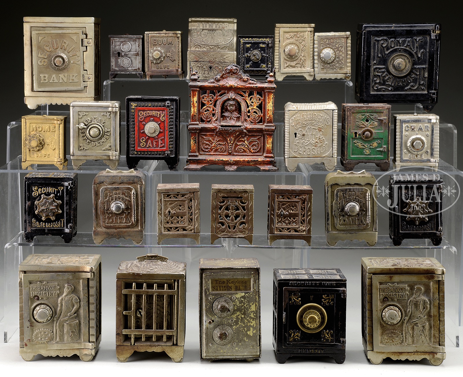 LOT OF 27 CAST IRON & TIN SAFE BANKS.Large lot of cast iron safe banks with nickel plating, paint and stencil decorations. Nine of the smaller safe banks have combination to open doors. Others are marked “Children’s Safe Deposit Bank”, “The Bank of Industry”, “Royal Safe Deposit”, “Jewel Safe”, a tin bank marked “The Keyless Savings Bank”, “Junior” cash register bank, and “The Ideal Safe Deposit Bank”. SIZE: Varies, tallest is 6-1/2″ t. CONDITION: Averages good with no apparent cracks, breaks or chips in castings. 48820-28 (600-1,000) – Lot 2146 Auction: Advertising, Toy & Doll - Spring 2015 Please Note: All prices include the hammer price plus the buyer’s premium, which is paid by the buyer as part of the purchase price. The prices noted here after the auction are considered unofficial and do not become official until after the 46th day. |
