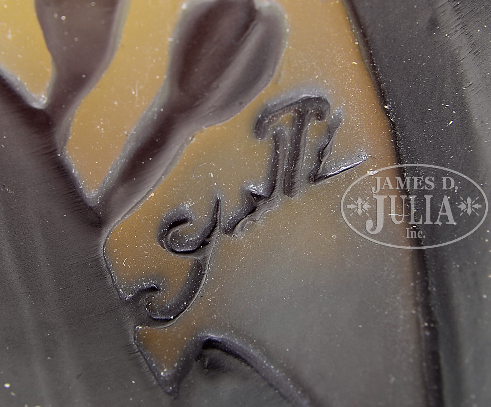 GALLE MOLD BLOWN HYACINTH VASE.Galle hyacinth vase has mold blown pattern of brown leaves and stems leading to clusters of bright blue hyacinth flowers, all set against a frosted yellow background. Signed on the side in cameo “Galle”. SIZE: 12″ t. CONDITION: Very good to excellent. 5-69047 (9,500-12,500) – Lot 2148