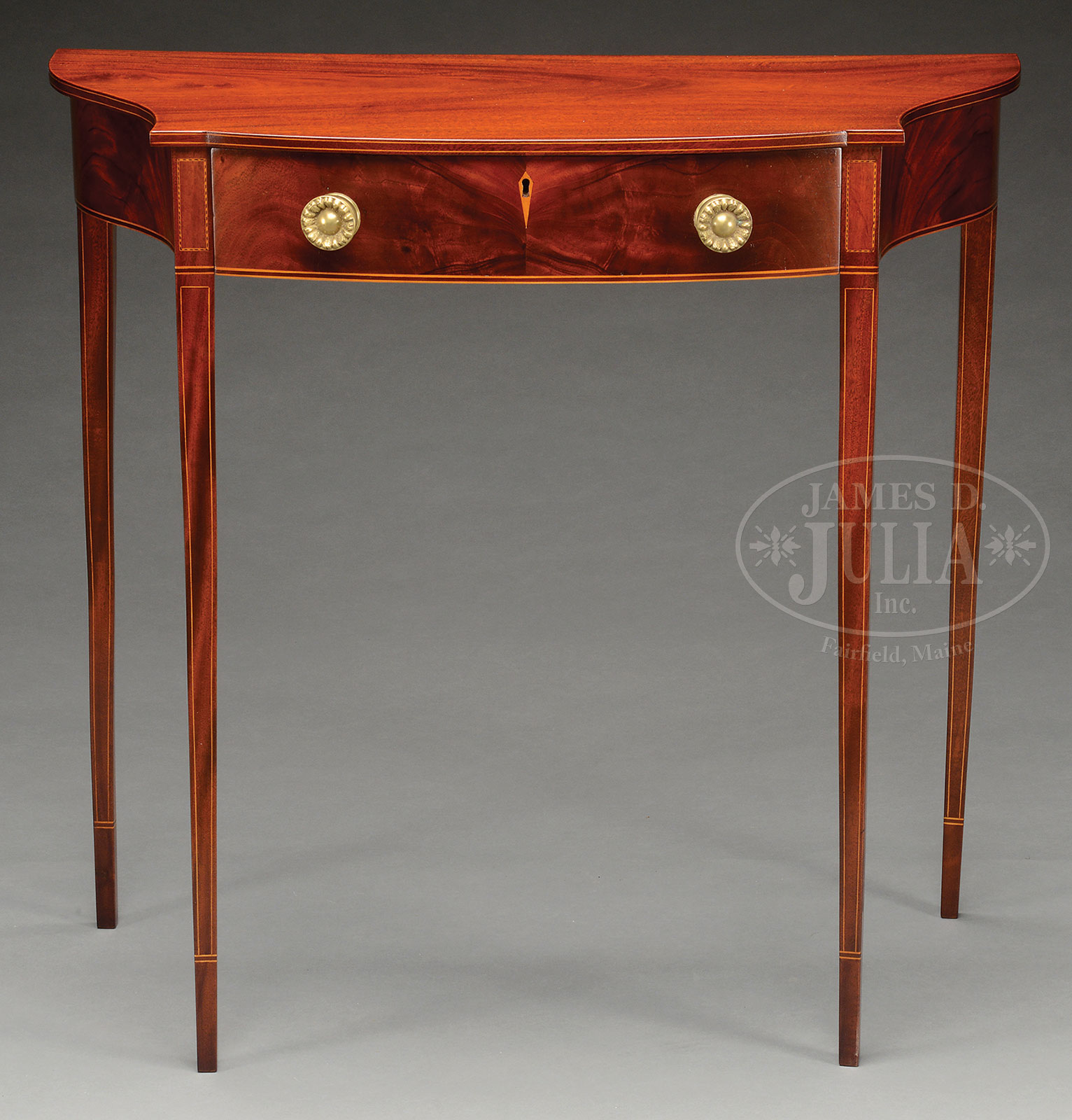 FINE DIMINUTIVE FEDERAL INLAID MAHOGANY SERVER.Circa 1810, Massachusetts. The square table with elliptic front and half-elliptic ends fashioned from a single board above the conforming apron fitted with a single drawer mounted with original molded brass handles. The front with double string inlay beneath an elongated diamond escutcheon. The interior fitted with compartments. The side panels of figural mahogany each bordered with double string inlay. Raised on delicate tapering square legs, string inlaid with cross-banded cuffs. The server with professional French polished surface. SIZE: 34-3/4″ h x 36″ w x 17-3/4″ d. CONDITION: Very fine and original with no restoration or blemishes. 52132-3 (6,000-8,000) – Lot 2148