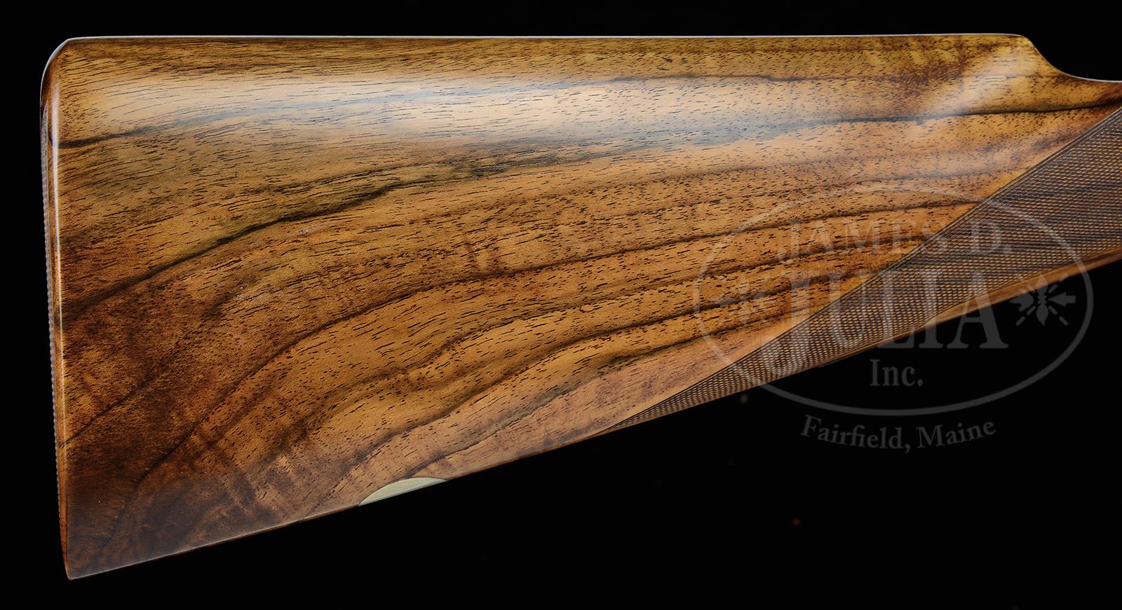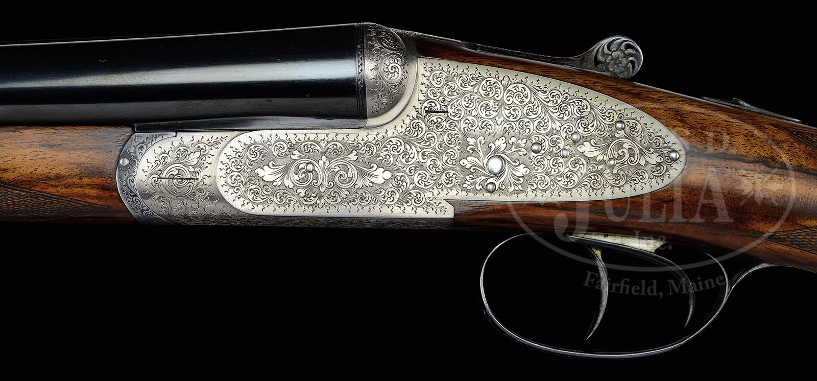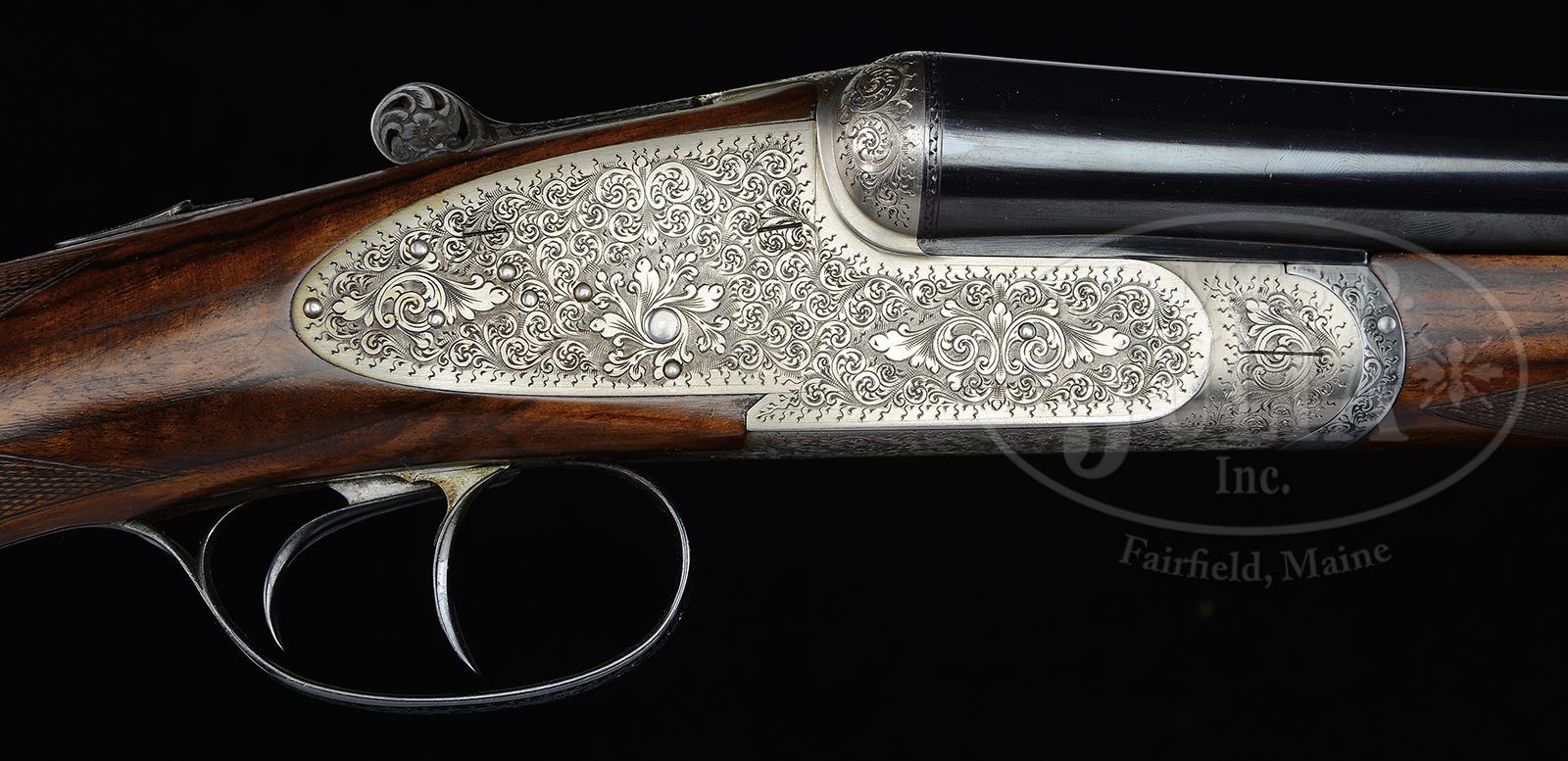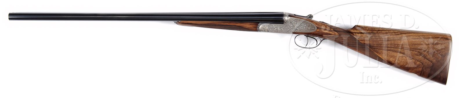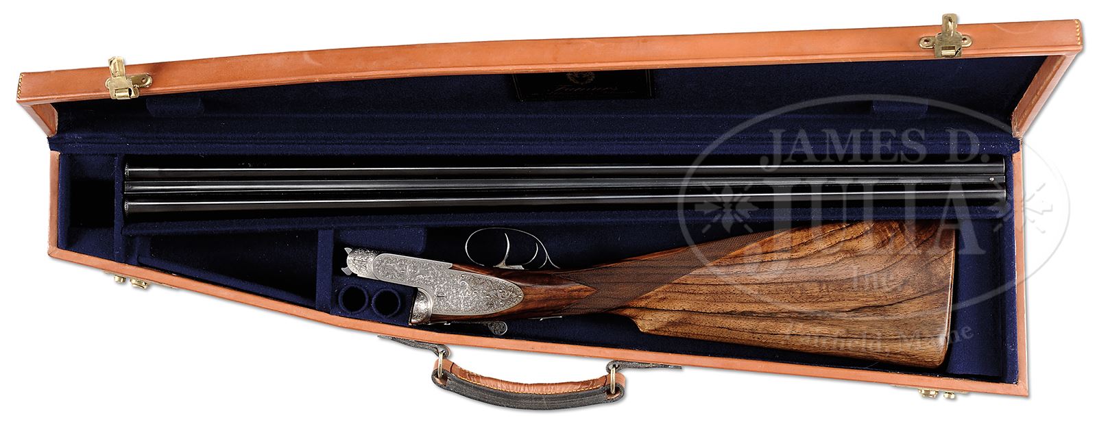 *EARLY FAMARS SIDELOCK EJECTOR GAME GUN WITH CASE.SN 29198. (1973) Cal. 12 ga. 2-3/4″ Chambers. 27-5/8″ Dovetailed bbls with slightly raised, concave game rib, are engraved “Armi Famars” on top of left bbl. Bbl flats are stamped with 1973 Italian nitro proofs, SN, and “FAMARS”. Coin finished full sidelock action features automatic safety, bushed strikers, and double triggers (front articulated). Lockplates are slightly rounded in Boss style. Top lever is pierced. Action is engraved with 90% coverage medium scroll with floral and foliate highlights. Engravers signature is on trigger plate. Top lever and trigger guard with matching engraving are blued. Flesh-toned, dark streaked and light stump figured European walnut straight grip buttstock measures 14-1/4″ over checkered wood butt, and features point pattern checkering at grip. A vacant silver oval is on toe line. Matching splinter ejector forend has Anson release. Bore diameter: left -.728, right -.727. Bore restrictions: left -.039 (extra full), right -.020 (mod). Wall thickness: left -.032, right -.031. Drop at heel: 2-3/16″, drop at comb: 1-5/16″. Weight: 6 lbs 13 oz. LOP: 14-1/4″. Tan, trapezoidal, VC type leather case is lined in purple cloth, and has gold embossed Famars label in lid. PROVENANCE: Letter from Famars USA with info regarding this gun, and stating that the current replacement cost for a “Venere” sidelock is approx $75,000.00. CONDITION: Excellent, near new, with a number of light marks and scratches on bbls, mostly at breech ends. Coin finish is generally excellent, bright on beads, with some oil darkening. Stocks are excellent with a few minor light pings. Bores are excellent. Mechanically crisp. Case leather is excellent with some very light scuffs. Handle is excellent. Interior cloth has only one or two light compressions. 49469-1 MGM189 (8,000-12,000) – Lot 2150 Click here to view provenance