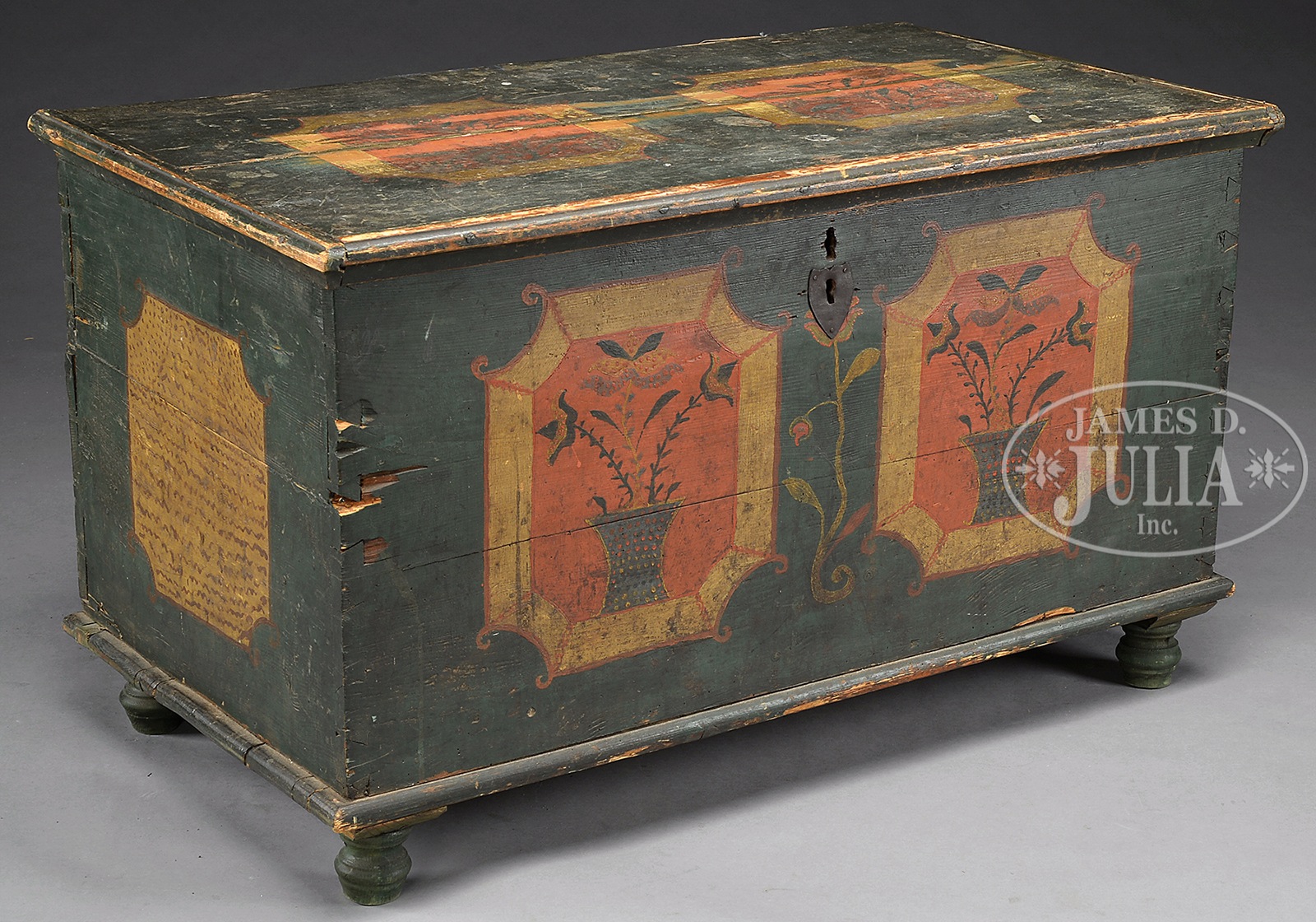 EARLY 19TH CENTURY CONTINENTAL DOWER CHEST WITH PAINT DECORATION.A green painted dovetail chest with two decorated, panels on top and front with stylized flowers and urns. Sitting on turned feet. SIZE: 44″w x 22-1/2″d x 25″h. PROVENANCE: From a fine Kentucky Estate. CONDITION: Typical losses, wear and drying splits. Feet of a later origin. 9-92251 (1,000-2,000) – Lot 2151