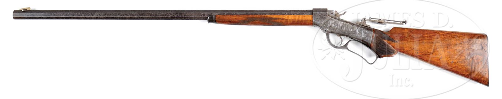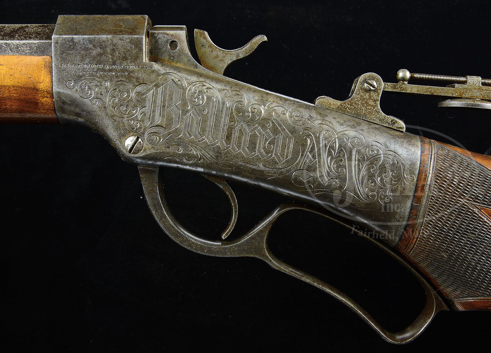 RARE MARLIN BALLARD #4-1/2 A-1 MID-RANGE SINGLE SHOT TARGET RIFLE.SN 1815. Cal. 40-65 Ballard Everlasting. Scarce Ballard rifle with 30″ medium weight oct bbl, nickel silver Rocky Mountain front sight, no provision for a rear sight and an orig, short base mid-range vernier tang sight with 3-3/4″ staff. Receiver is engraved by L.D. Nimschke with the large panel on the left side engraved “Ballard A 1” and “Mid-Range” on the right side. Both panels are surrounded by light foliate arabesque patterns. Mounted with nicely figured, light colored European walnut with slim checkered forearm that has carved horn schnable tip and a serpentine grip buttstock with checkered steel buttplate. Accompanied by its orig black leather covered, dark green velvet lined sight case for the sights on this rifle plus four extra front sight inserts. Also accompanied by Mr. Yearout’s Collection inventory card which shows he purchased this rifle from well known old time dealer, Ray Saign, of Minneapolis, MN in Apr. 1973. PROVENANCE: Estate Collection of Lewis & Leyton Yearout. CONDITION: Very good. Bbl retains 30-50% dull orig blue mixed spotting; receiver retains faded case colors with rust spotting, as does the lever, hammer and breech block. Stock has a small screw hole in top of the wrist which has caused a 1-1/2″ crack, otherwise wood is sound with usual nicks, dings & scratches and overall retains 88-90% strong orig varnish. Mechanics are fine; brilliant shiny bore. Sight case is missing one small corner of the leather covering and shows edge wear, a few nicks & dings with very lightly faded interior. 4-53973 JR72 (4,000-7,000) – Lot 2151 Click here to view provenance