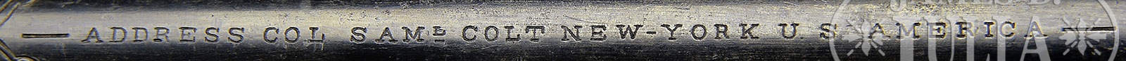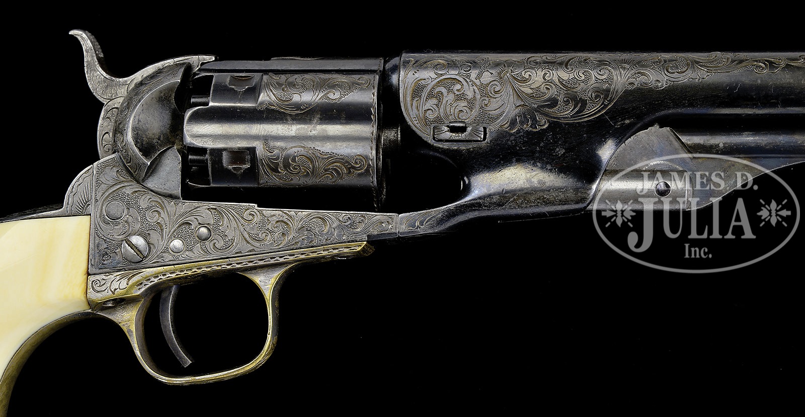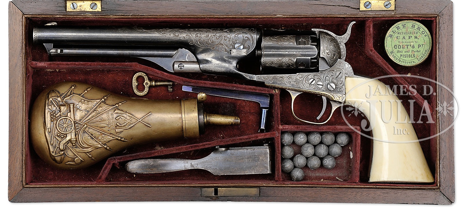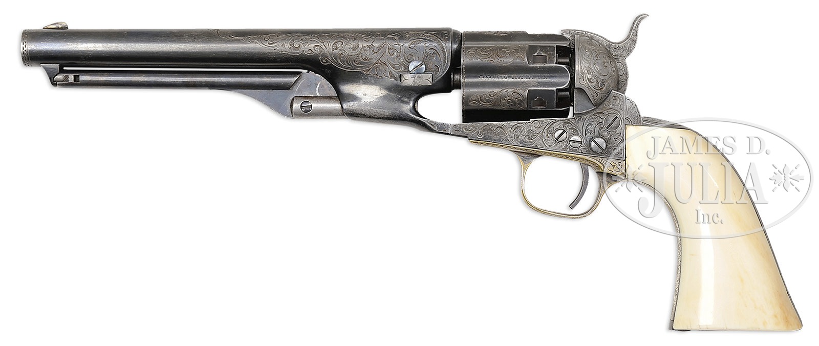 RARE CASED ENGRAVED COLT MODEL 1860 FLUTED ARMY PERCUSSION REVOLVER.SN 3547. Cal. 44. Blue & color case hardened with 7-1/2″ bbl, German silver front sight and New-York U.S. America address. Left side of frame has “COLTS PATENT” and the silver plated brass trigger guard & steel back strap contain its orig, matching numbered,1-pc, Army-sized ivory grip. Cyl is full fluted style with all six safety pins crisp & serviceable. Frame is 4-screw style with flat head hammer screw and cut for shoulder stock. Revolver is engraved by Gustave Young with about full coverage foliate arabesque patterns on the frame with one scroll terminating in a flower blossom on the left recoil shield. Matching foliate arabesque patterns extend over the bbl and terminate just forward of the address. Top of the back strap is engraved in Mr. Young’s minimal starburst panel with foliate arabesque pattern on the back strap, heel, butt strap & trigger guard. Raised areas of the cyl, over the chamber areas are engraved to match. Hammer is also engraved to match with a wolf’s head on each side of the nose, foliate arabesque patterns on the shank and fish scale patterns on the top edge & sides of the spur. It is well recorded that there were about 4,000 of these revolvers with fluted cylinders produced out of the first 8,000 or so revolvers made. Many of these fluted Army revolvers were shipped to southern dealers on the eve of the Civil War and are sometimes considered secondary Confederate arms. Accompanied by an orig, burgundy velvet lined, Colt mahogany casing, compartmented in the bottom for the revolver, a sgl sided “COLTS PATENT” trophy of flags & arms angle spout flask, a blued “COLT’S PATENT” 2-cavity bullet mold with sprue cutter, an L-shaped nipple wrench, a small tin of Eley’s caps and a functioning key. Given the very limited number of these revolvers produced, and the time frame in which they were produced, it is statistically safe to say that extremely few were engraved and even fewer were cased. This is an orig casing built for the 7-1/2″ bbl revolver with Army grip vs. the 8″ standard production revolver. PROVENANCE: Michael Leff Estate Collection. CONDITION: Very fine, all matching including wedge, cyl & grip. Bbl retains about 70% thinning orig blue, glossy & bright in sheltered areas; rammer pivot & handle retain about all of their dark orig case colors; frame retains traces of case colors in the most sheltered areas having faded mostly to gray; hammer is a gray patina; cyl retains 60-70% orig blue, mostly in the flutes & rebated area; trigger guard retains 40-50% orig silver and the back strap is a cleaned gray metal patina. Grip has a few age lines, shows very little wear and retains a wonderful mellow ivory patina. Mechanics are fine; strong sharp bore with moderate pitting. Case has a couple of grain checks in the lid and another in the bottom, otherwise is sound with handling & storage nicks & scratches and retains about 75-80% orig varnish; interior is lightly faded in the lid with one area of soil from contact with the cylinder; bottom is moderately faded & soiled with light damage from the front sight and some slight loose material in the rear edge; flask is mostly a dark brass patina; mold is very fine, other accessories are fine. Altogether an extremely rare & desirable set. 4-49633 (55,000-75,000) – Lot 2152