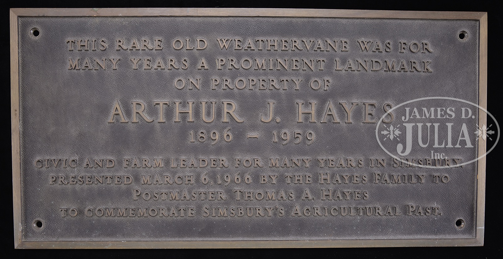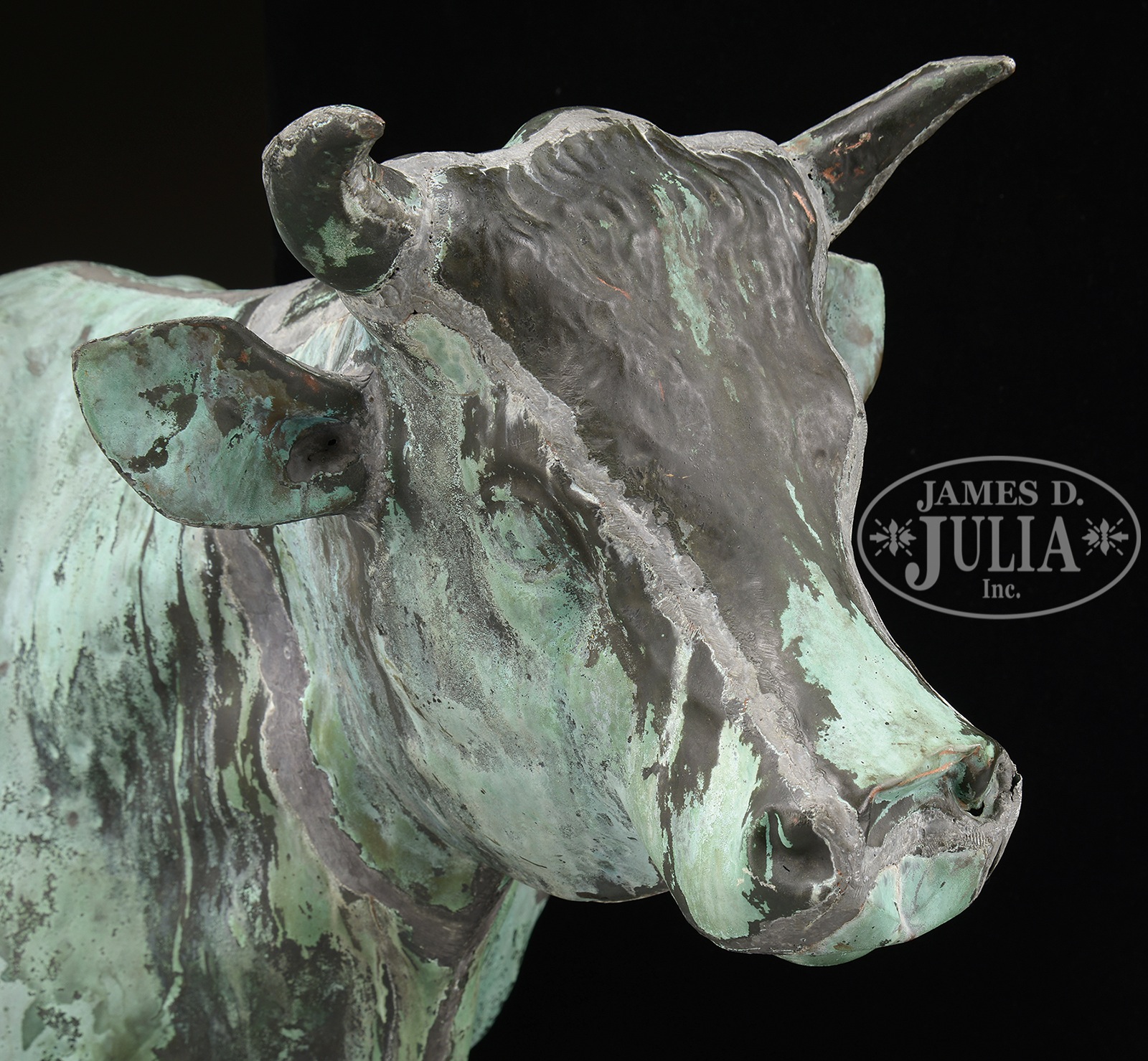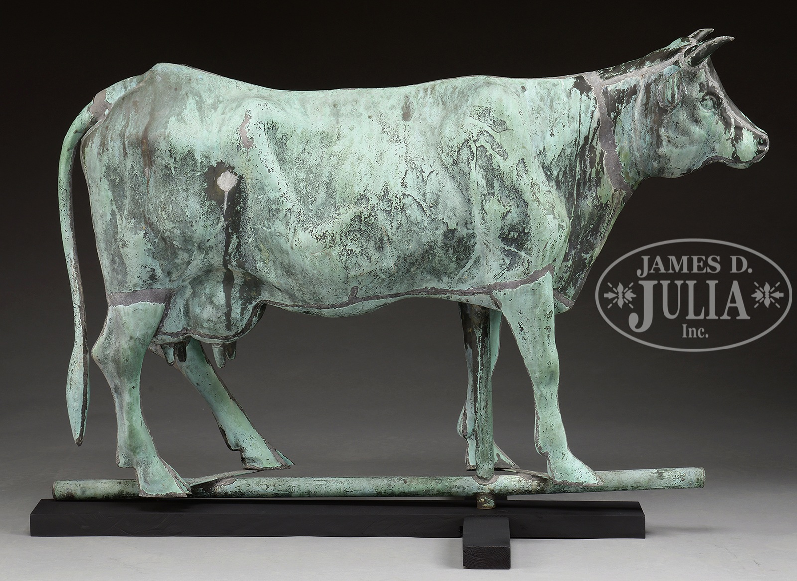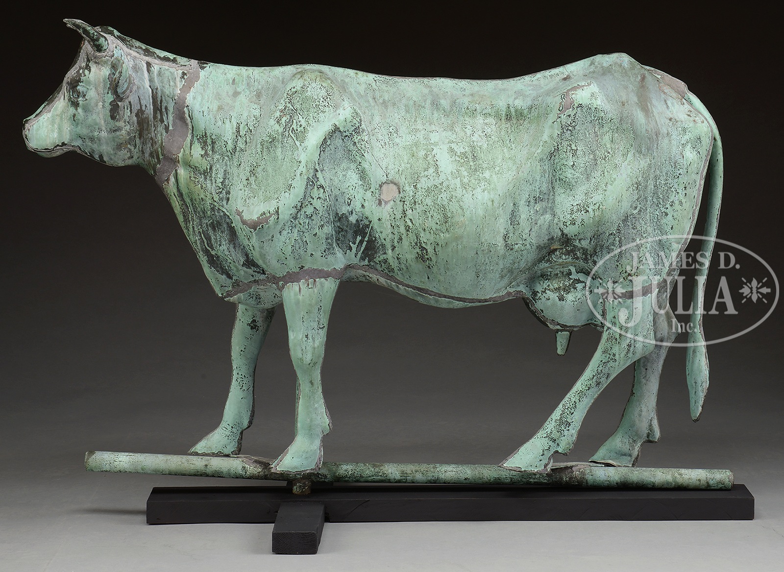 MONUMENTAL AND IMPORTANT FISKE COW WEATHERVANE.Circa 1890. Commissioned by William Hayes of Tariffville Connecticut for his barn, and probably created by J W Fiske, New York City, New York. The form is of a short horn Jersey cow, and though known examples of this scale are extremely rare, there is a similar weathervane illustrated in the Fiske catalog of that era. This huge weathervane is constructed from repousse copper panels soldered together, and is attached to the original large scale copper tube, the vertical portion of which shows significant wear and is unquestionably original. The weathervane is in an exquisite verdigris patina, testimony to a hundred years of active daily service on the cupola of the Hayes’ Dairy Barn, before going to work on the cupola of the Simsbury post office. An iconic and extremely well documented piece of Americana. Accompanied by a complete history of ownership, including a bronze plaque from the Simsbury, Connecticut post office where the weathervane resided from its dedication in 1966 until 1988, but for a day short of a year, when it was stolen and then recovered. Also included are a number of articles and early photographs of the weathervane. SIZE: 33″ h x 48″ l x 14″ w. CONDITION: Good, with very minimal traces of original sizing and gilt remaining on the underside of hindquarters. It has never been re-surfaced and the only repair noted is a single bullet hole expertly repaired at the center of its being. The repair has weathered significantly due to the overall patina. Additionally there are some dents present around tail and body junction, nose and middle of proper right side. None of these are visually distracting. 49302-1 (25,000-35,000) – Lot 2152