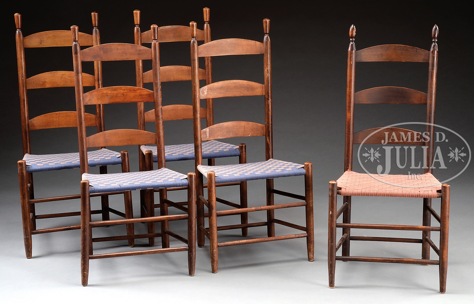 1st quarter 20th century. New Lebanon, New York. Each chair offset with 3 arched slats joined to cylindrical styles surmounted by unusual cylindrical finials believed to be experimental at time Top slat held in place by wooden pegs. Each chair with newer woven taped seats. Single ladder back of similar form but with “onion” form finials and tapering cylindrical frontal legs. Chair retains original surface and taped seat. NOTE: This lot is accompanied by original bills of sale from 1998. SIZE: Set of 4: 40″ h (back) 16″ h (seat). Single: 41″ h (back) 17″ h (seat). CONDITION: Structurally very good. 49945-1 (1,200-1,800) – Lot 2152