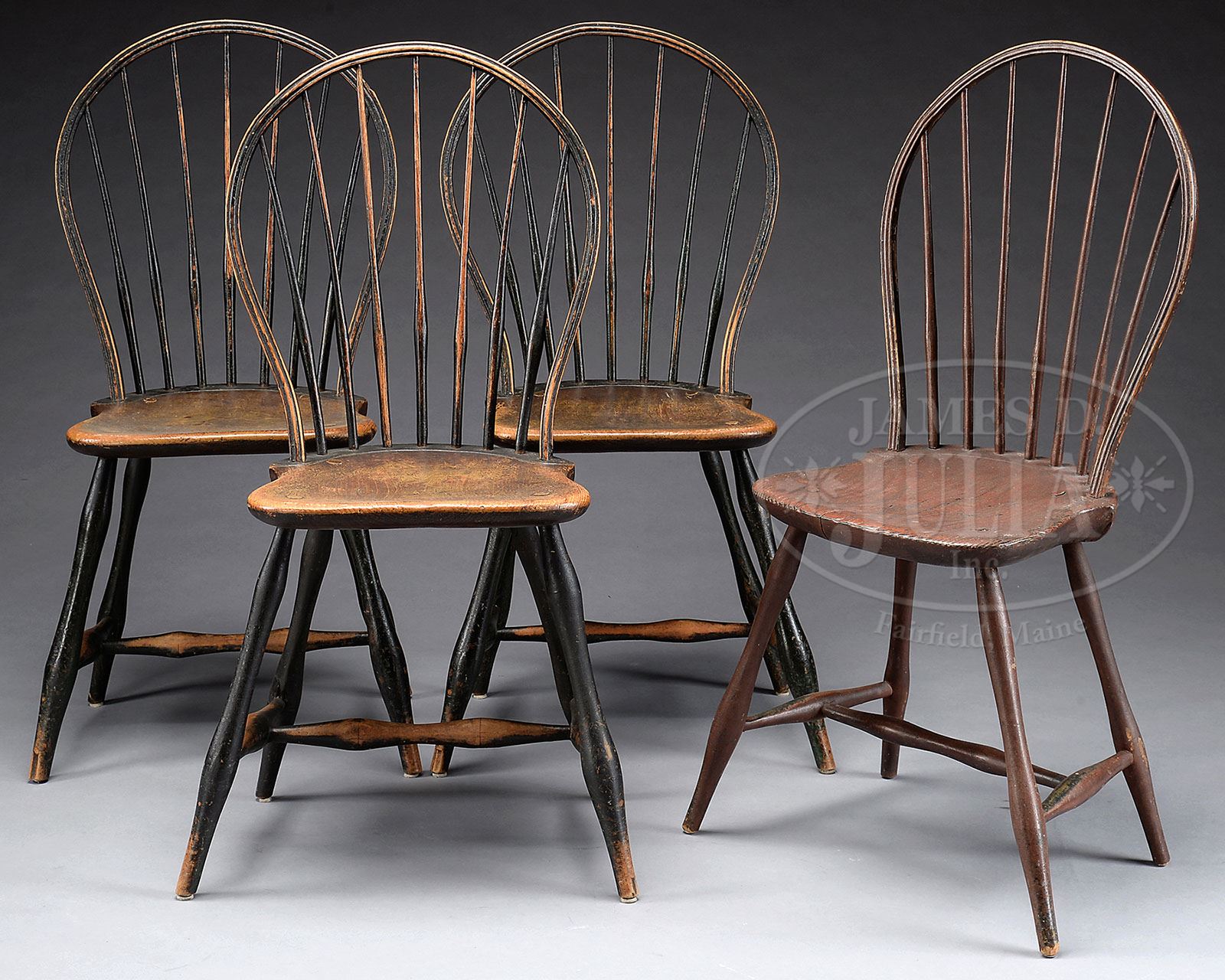 SET OF FOUR BOW-BACK WINDSOR SIDE CHAIRS. Late 18th century, Connecticut. Each molded bowed crest rail above seven swelled spindles joined to the shaped saddle seat raised on swelled splayed and raked legs joined by conforming H-stretchers. NOTE: Three chairs in original bottle green paint with mustard and red painted pine seats; the fourth chair overpainted in old red, the seat of chestnut. Although this chair has slightly thinner crest rail and minimally smaller circumference of the swells in the legs, we believe the set to be by the same hand. SIZE: 38-1/2″ h. Seat: 18-1/2″ h. CONDITION: Painted surfaces as noted, the fourth chair with old iron brace stabilizing an early crack to underside of seat. 9-92073 (2,500-4,000)