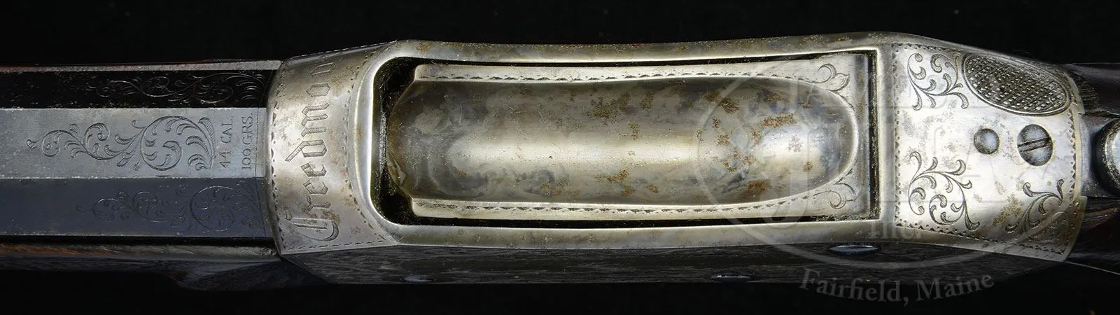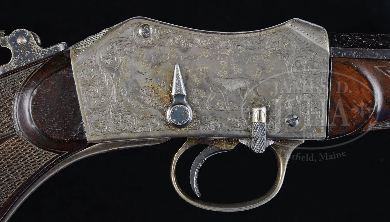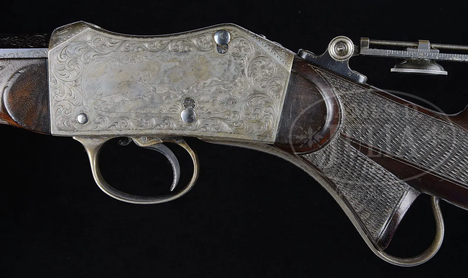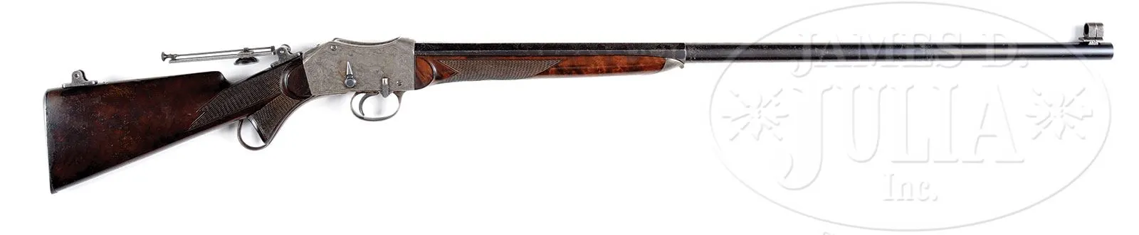 VERY RARE ENGRAVED PROVIDENCE TOOL PEABODY LONG RANGE CREEDMOOR SINGLE SHOT TARGET RIFLE.SN 187. Cal. 44-100 Peabody. Spectacular long range rifle with 32″ medium weight, oct to rnd bbl with incorrect globe front sight, no provision for a rear sight and the correct providence tool long range vernier tang sight with alternate heel mount base. Receiver is wonderfully engraved, probably by Conrad Ulrich, with the large vignette of two running bull elk being chased by two hounds through a field scene on the left side. Right side has the large vignette of a German Pointer on point with a partridge in the foreground of a field scene. Both vignettes are surrounded by extremely well executed foliate arabesque patterns with incredibly fine pearled background. Top front of the receiver is engraved “Creedmoor” with fine engraving patterns on top rear of receiver, trigger guard and lever. Matching engraving patterns extend about 1-1/2″ over the exposed bbl flats in the chamber area. Chamber area also has the caliber marking. Trigger bow is engraved “PEABODY & MARTINI PATENTS”. Mounted with very highly figured, dark American walnut with elaborately checkered semi-schnable, metal tipped forearm and pistol grip stock with smooth steel buttplate. According to a noted single shot authority there were fewer than 50 Peabody rifles ever engraved. Accompanied by Mr. Yearout’s Collection inventory card which shows that he purchased this rifle from Cletus Klein of New Braunfels, TX in Jul. 1990. PROVENANCE: Estate Collection of Lewis & Leyton Yearout. CONDITION: About fine, all matching including receiver, forearm, buttstock & buttplate. Bbl retains about 70% bright orig blue; receiver retains about 50-60% faded case colors. Stock has a crack and a couple of chips in the wrist, otherwise wood is sound with nicks, dings & scratches. Butt stock retains about 70% orig varnish and the forearm most of a cleaned finish. Mechanics are crisp; bright shiny bore. 4-53791 JR65 (5,000-7,000) – Lot 2154 Click here to view provenance