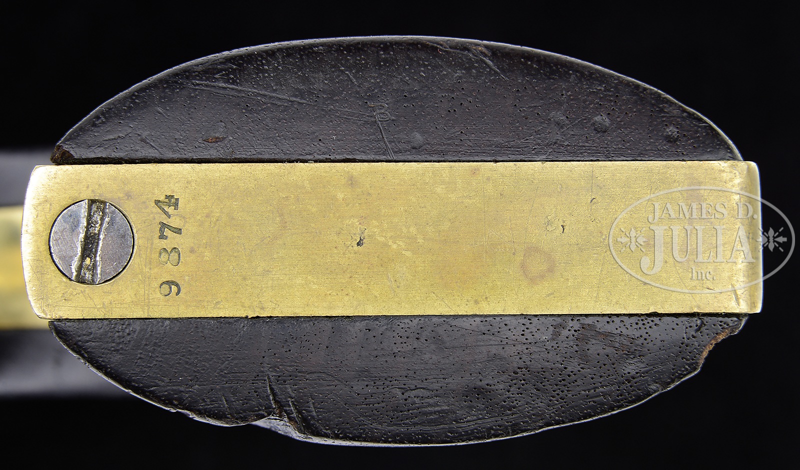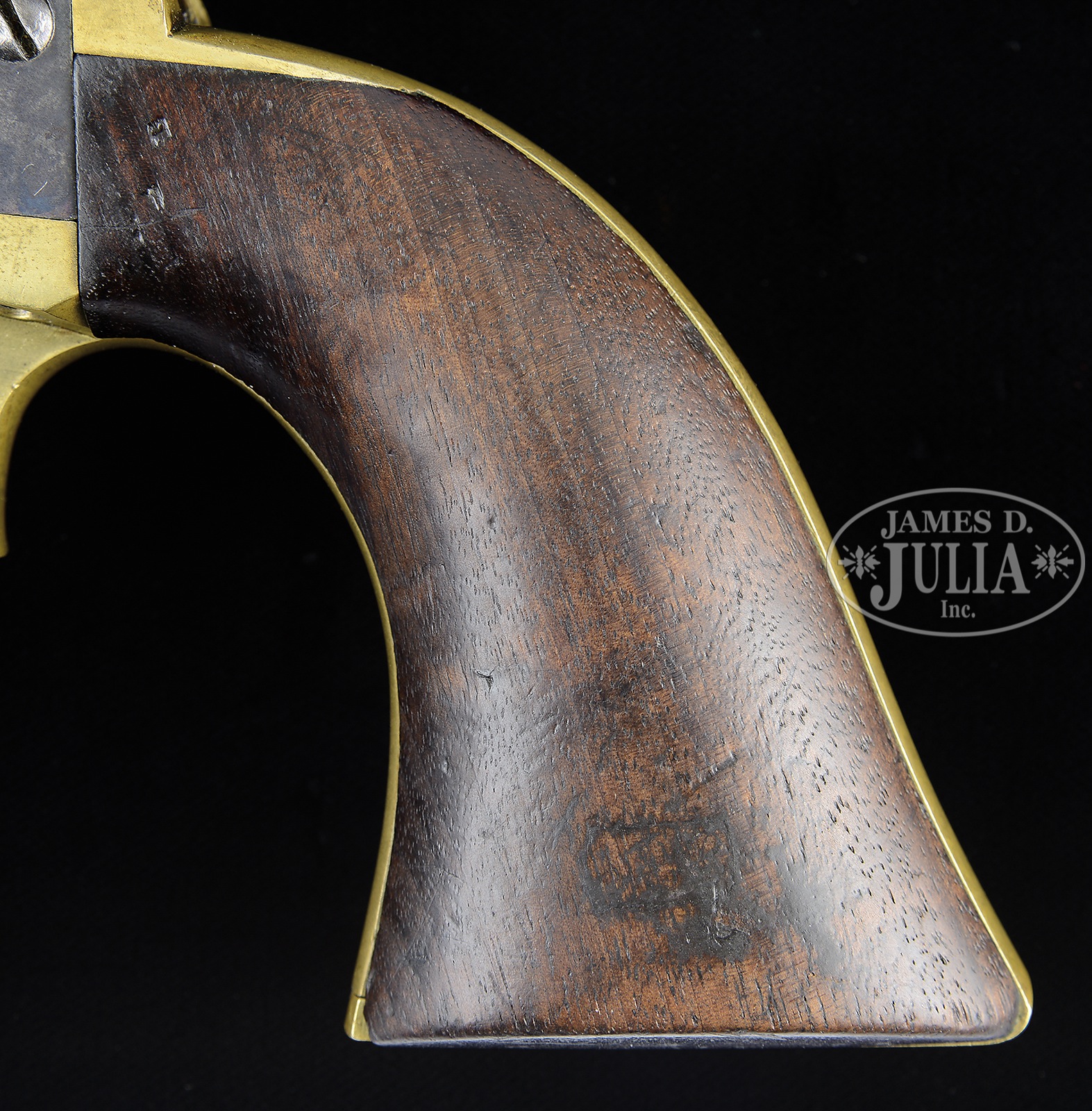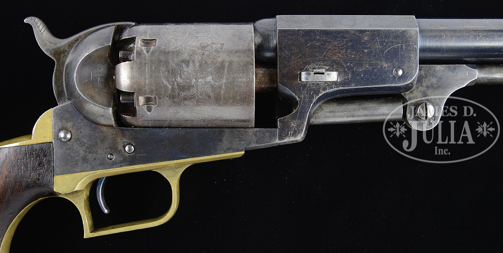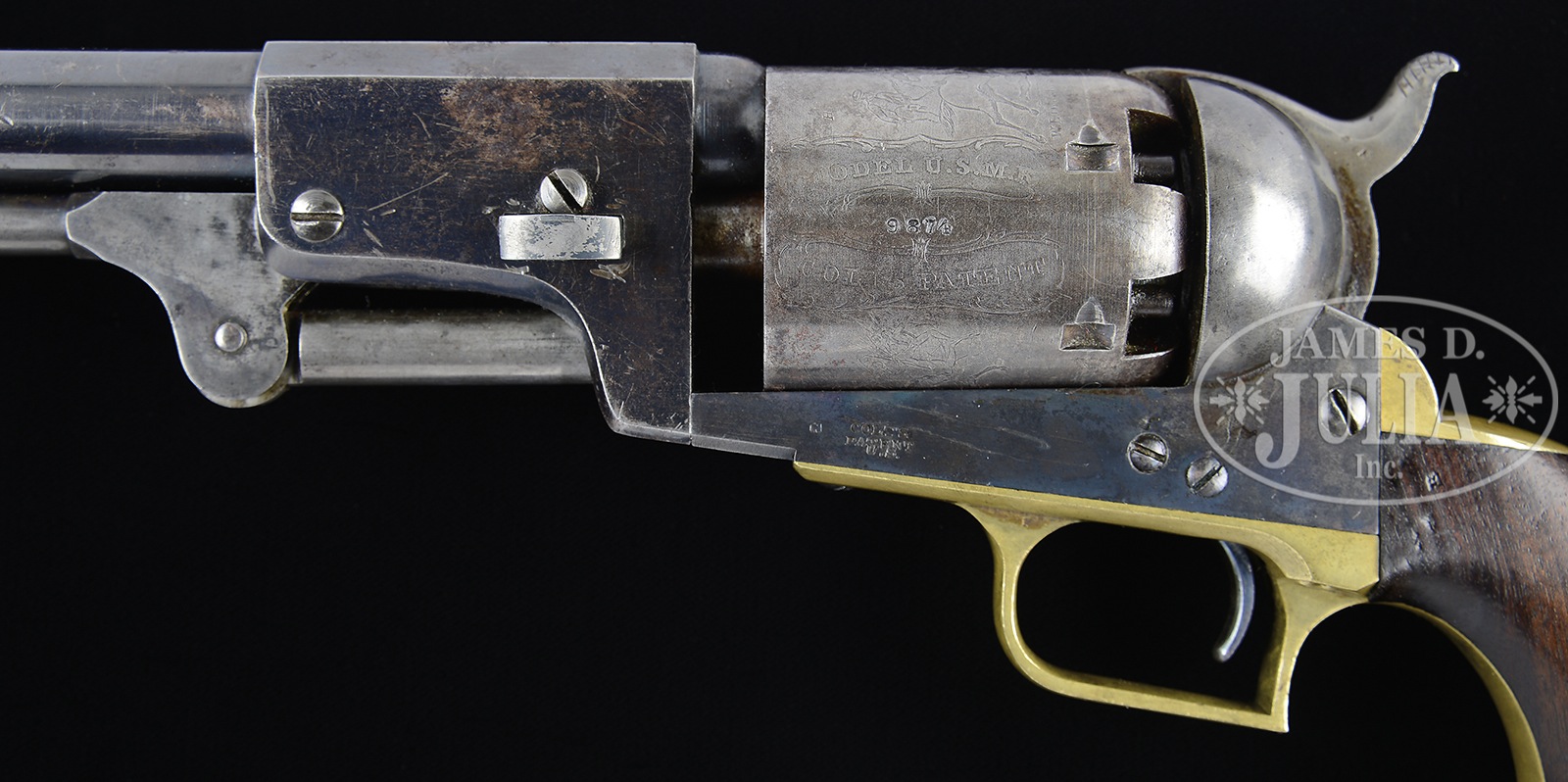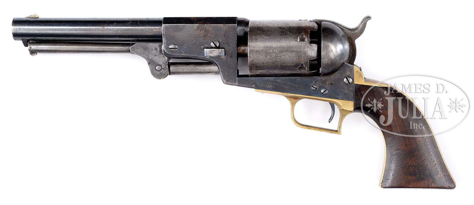 SCARCE COLT 2ND MODEL DRAGOON PERCUSSION REVOLVER.SN 9874. Cal. 44. Blue & color case hardened with 7-1/2″ oct to rnd bbl, German silver front sight & 1-line New York City right hand address with dashes. Rammer has a vertical latch. Left side of frame is marked “COLT’S PATENT” over a tiny “U.S.”. Cyl is unfluted with Dragoon/Indian fight scene roll marking and “MODEL U.S.M.R. / COLT’S PATENT” cartouches surrounding the SN. All 6 safety pins are crisp. The brass trigger guard & backstrap contain an oil finished 1-pc walnut grip with number “10644” in backstrap channel and an indecipherable inspectors cartouche on the left side with a faint “WAT” (William A. Thornton) sub-inspector cartouche on the right. Various parts of the revolver have other small inspector initials. The 2nd Model Dragoon was the lowest production of the 3 Dragoon models with only 2,700 produced in the period 1850-1851. The majority of these revolvers were issued to mounted infantry or Dragoons fighting Indians on the American frontier to replace the Walker revolvers from the Mexican War. Then later, they were issued in the Civil War where they again saw hard service and continue to serve back on the American frontier after the war. Few survive today and of those extremely few retain any orig finish. CONDITION: Very fine, all matching except grip as noted. Bbl retains about 90% strong orig blue with scattered light age spots and a few small nicks with sharp edge wear. Rammer pivot retains most of its orig case colors, fading to grey and rammer handle has dark case colors. Frame retains most of its orig case colors, also fading to grey. Hammer retains about 60% faded case colors on the sides, stronger on the back edge. Cyl is mostly a blue grey patina showing about 95% strong Dragoon/Indian fight roll marking scene with a few spots of light surface pitting. Cartouches surrounding SN are fine. Trigger guard & backstrap are a medium mustard patina. Grip has a chip in the bottom right edge and a set of scratched initials on the top right side and overall retains a hand-worn patina. Mechanics are fine. Bright shiny bore with some very minor roughness toward the muzzle. 50142-6 JR117 (25,000-35,000) – Lot 2154