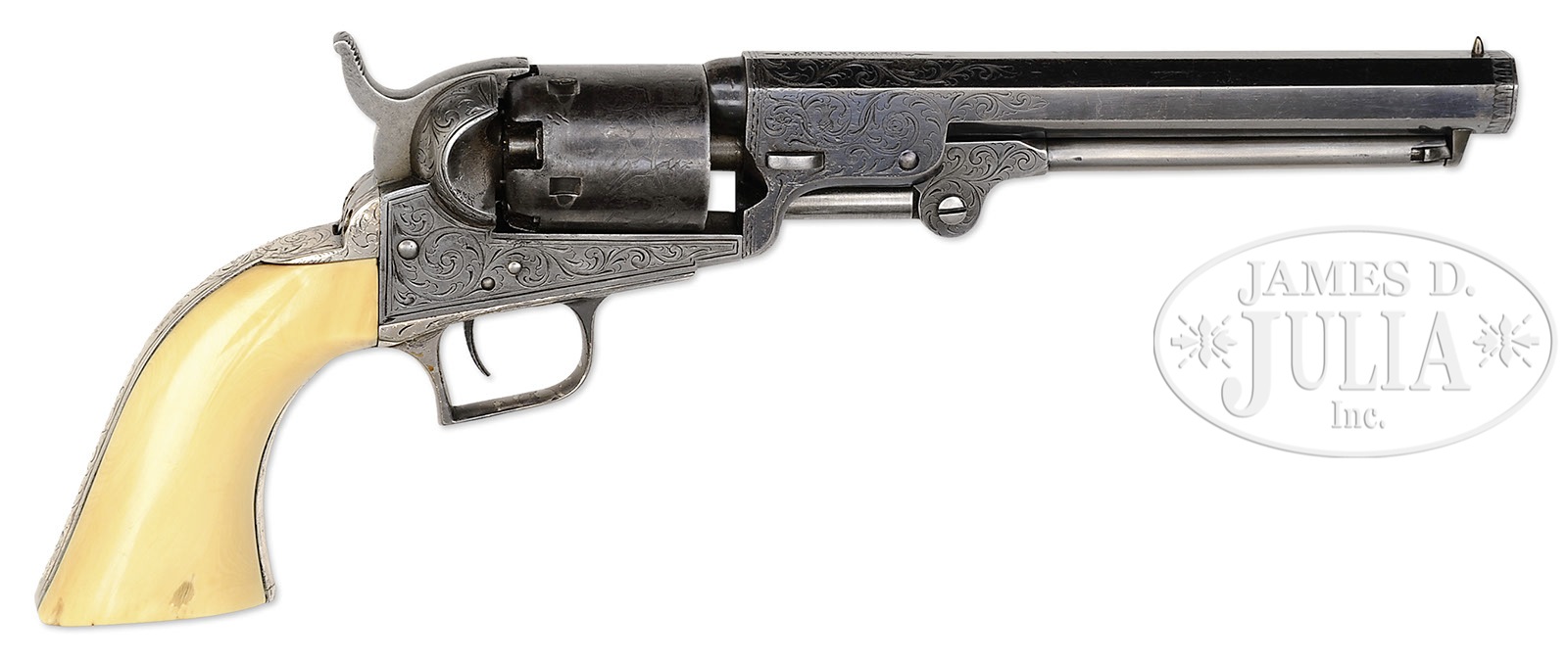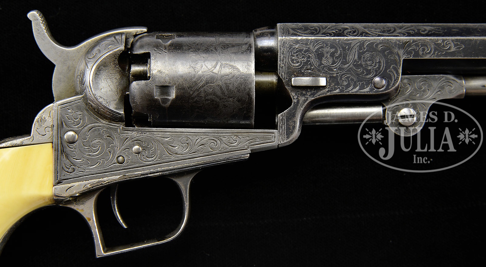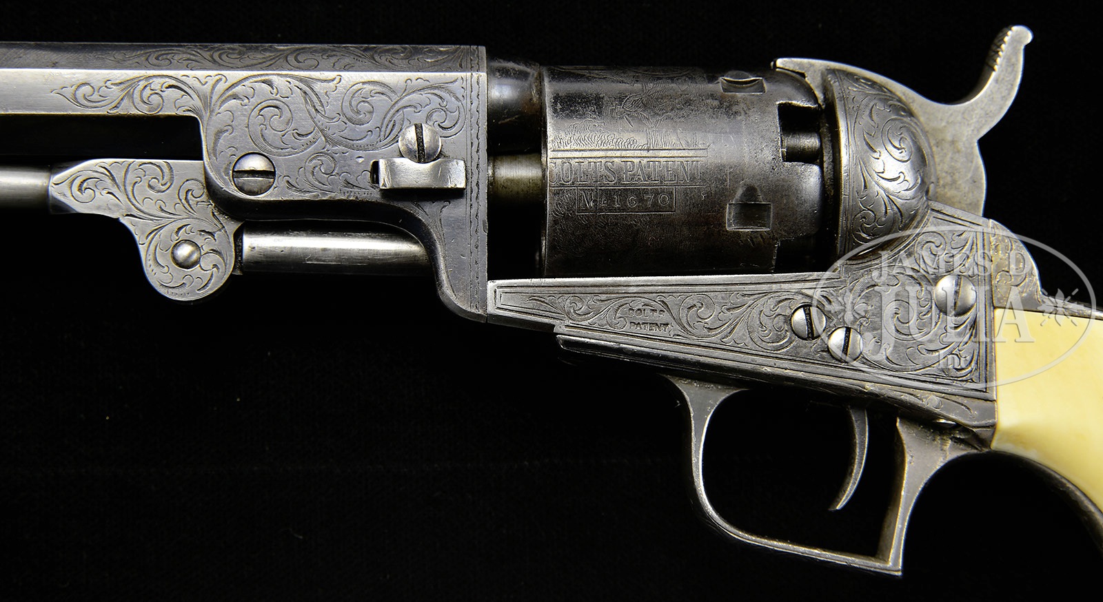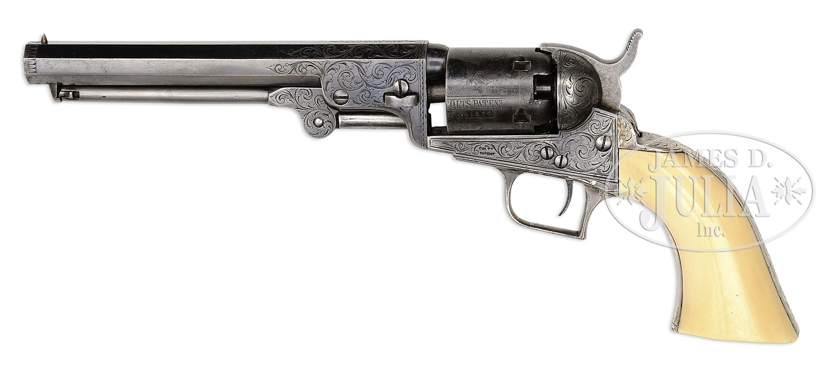 SN 11670. Cal. 31. Blue & color case hardened with desirable 6″ bbl that has brass pin front sight and 2-line right hand New York City address with dashes and its orig, matching numbered 2-pc rammer. Address has been dbl struck. Frame has a tiny “COLTS PATENT” and the silver plated square back brass trigger guard & back strap contain what is probably its orig 1-pc smooth ivory grip. Cyl is usual 5-chambers with rectangular stop notches and six crisp safety pins. Cyl also has the stagecoach holdup scene roll marking. Revolver is engraved in late vine style without shaded background. Frame has nearly full coverage foliate arabesque patterns which extend over the bbl lug, top side flats and rammer pivot. Back strap, butt strap & trigger guard are engraved to match. Accompanied by what is probably its orig green velvet lined mahogany casing, compartmented in the bottom for the revolver, a 1-sided brass flying eagle & shield flask. Eagle has a ribbon in its beak inscribed “E PLURIBUS UNUM”. Also accompanied by an early brass 2-cavity “COLTS PATENT” bullet mold without sprue cutter, a packet of five combustible cartridges, an L-shaped nipple wrench and a functioning key. It also has a cap tin with homemade Eley Bros. label. There were a total of about 15,000 Baby Dragoon revolvers produced during the period 1847-1850 with the attached rammer first appearing around the 11,600 range making this one of the very earliest to have this feature. At about the same serialization the cylinders had rectangular stop notches and the stagecoach holdup scene roll marking. Mr. Leff’s notes indicate additional provenance of Leon C. (Red) Jackson. PROVENANCE: Leon C. (Red) Jackson; Michael Leff Estate Collection. CONDITION: Fine to very fine, all matching including rammer, wedge & cyl; grip is unnumbered; bbl retains about 80% of an old restored finish which might explain the dbl struck address; rammer & handle are a gray patina; frame is also a gray patina; cyl retains about 50% thin orig blue and shows about 85% stagecoach holdup scene roll marking; trigger guard retains most of its re-silvered plating and the back strap about 80% restored plating. Grip has a chip on the right heel and another small chip on the right side, otherwise is sound showing light to moderate wear and retains a beautiful, mellow ivory patina. Mechanics are fine; worn bore with strong rifling and moderate pitting. Case has a repaired crack in the lid with another diagonal grain check and a couple of grain checks in the bottom, otherwise is sound and retains most of an old restored finish; interior is lightly faded & soiled with solid partitions; accessories are all fine. 4-49638 (7,500-10,000) – Lot 2156