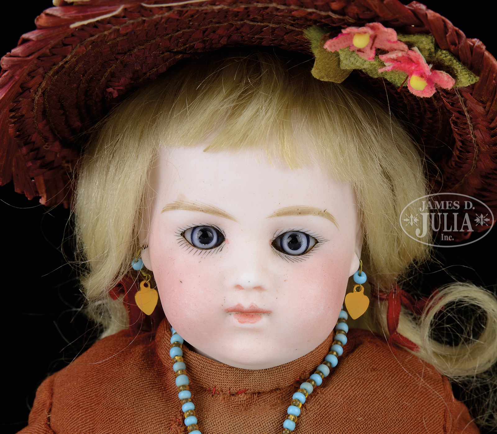 This little charmer is a great cabinet size being only 10″ tall and marked “5-0″ on the rear of her head. On the proper kid body with bisque lower arms (missing partial pinky on left hand), she is dressed in period clothing and an antique blond mohair wig. Her antique leather shoes are appropriate but unmarked. Bisque is pale and creamy with well-defined light eyebrows and the typical early style blue paperweight eyes with original eyeset. Head has the normal compression spring assembly attaching it to the bisque shoulder plate and the bisque head appears to be without any flaws such as hairlines, eye chips, etc. other than the faintest of faint white nose tip. A wonderful and rare to find size, this would make a great addition for those that appreciate quality and the best. SIZE: 10” t. CONDITION: Body is correct but slightly soiled and upper arm area by shoulders shows some wear and lacking sawdust and/or filler. 48887-1 (10,000-12,000) – Lot 2156