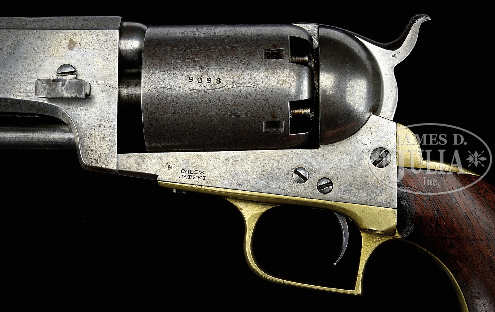 FINE COLT 2ND MODEL DRAGOON PERCUSSION REVOLVER.SN 9398. Cal. 44. Usual configuration with 7-1/2″ oct to rnd bbl, German silver front sight and 1-line New York City address. Left side of frame is marked “COLT’S PATENT” and the square back brass trigger guard and backstrap contain an oil finished 1-pc walnut grip with matching SN in backstrap channel. Left side of grip has a legible inspector cartouche and right side has the oval “WAT” (William A. Thornton) sub-inspector cartouche. Cyl is unfluted with Dragoon/Indian fight scene roll marking and “MODEL U.S.M.R. / COLT’S PATENT” cartouches surrounding the SN. Rammer latch is vertical style. The 2nd Model Dragoon was the lowest production of the 3 models of Dragoons with only 2,700 manufactured 1850-1851, of which the U.S. government purchased approximately 2,000. These revolvers usually saw very hard service with most being issued to mounted infantry and Dragoons fighting Indians on the American Frontier and are rarely found today with any orig finish. CONDITION: Very good, all matching except wedge which has the number 904, obviously a period of use replacement. No orig finish remains, being an overall smooth gray metal patina. Cyl is matching patina and shows about 65-70% Dragoon/Indian fight scene roll marking with mostly legible cartouches and 1 serviceable safety pin. The unplated trigger guard and backstrap are a medium mustard patina. Grip has a chip in left side at the frame, otherwise is sound, showing moderate wear and a hand worn patina. Mechanics are fine, very bright shiny bore. 50154-2 JR132 (8,000-12,000) – Lot 2156