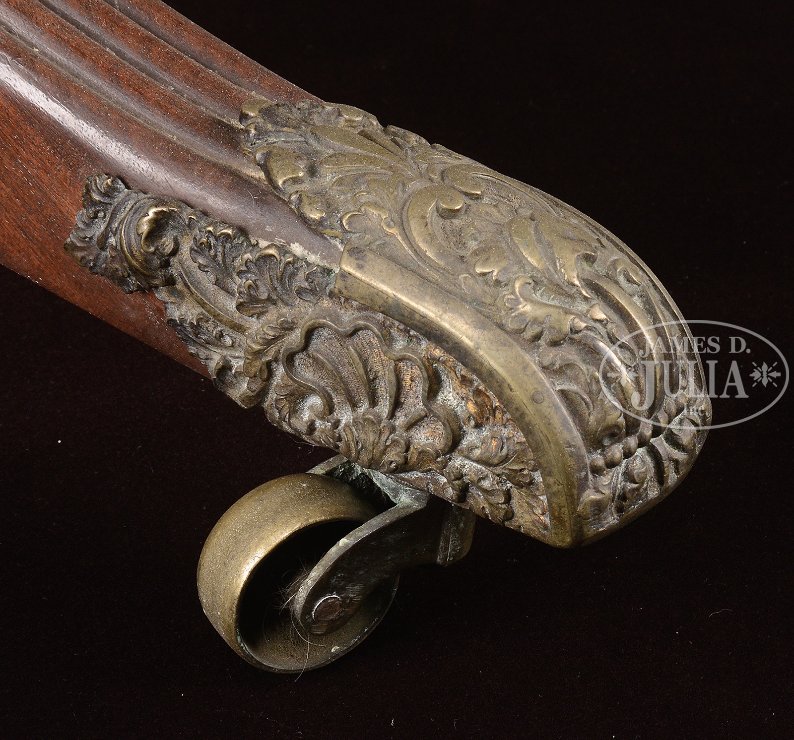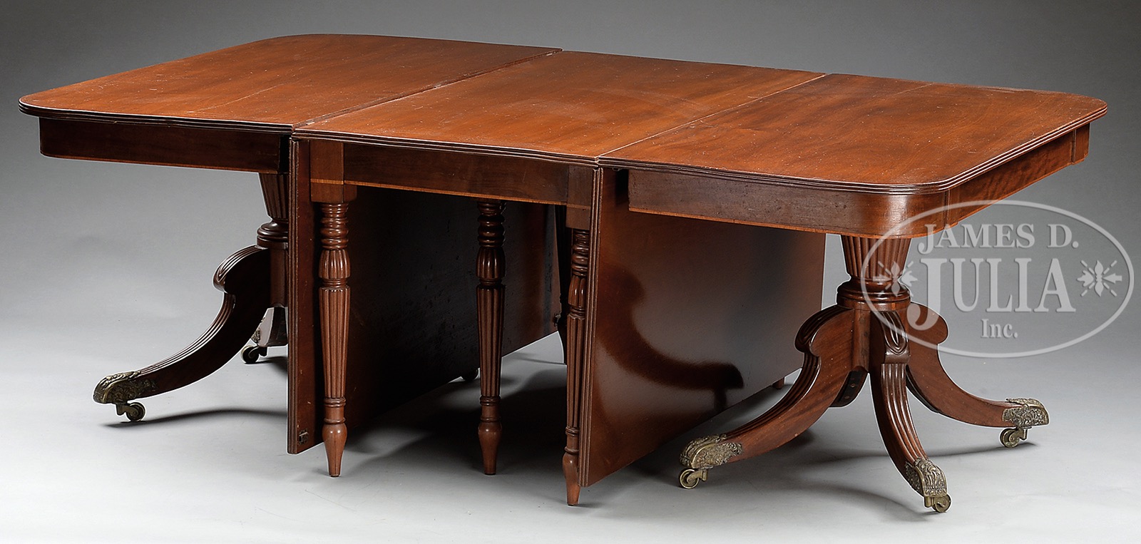 Circa 1800, American or Scottish. A Classical banquet table of inspired design, made from highest-grade Santa Domingo mahogany, in appealing old maintained surface. The architectural unity, refined carving, and historic surface are rare and appealing features. The center section can also be used as a stand-alone dining table with drop leaves, and the two demilune-ends can serve as consoles. The top is composed of well-figured single 27″ wide boards. The table comfortably seats fourteen (provision could be made for expansion with the addition of leaves and clips). The table’s design allows for exceptional seating with no interference from the legs or apron. Santa Domingo mahogany; pine secondary wood. Retaining the original brass hardware, including brass foot mounts, castors and “D” clips. SIZE: 29″ h x 55″ w x 134″ l. PROVENANCE: Found in Savannah, Georgia. CONDITION: Very good condition. Original maintained shellac surface. 51405-1 (15,000-25,000) – Lot 2156