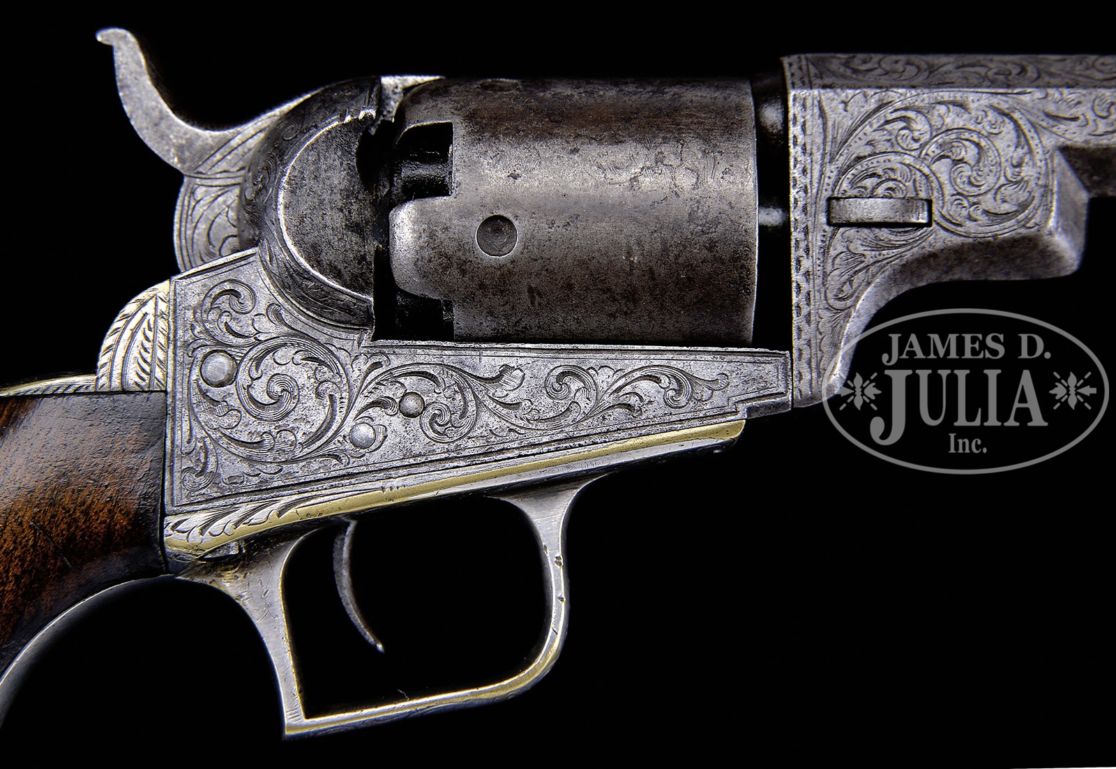 RARE CASED ENGRAVED COLT MODEL 1848 BABY DRAGOON PERCUSSION REVOLVER.SN 8065. Cal. .31. Usual configuration with 4″ oct bbl, pin front sight and 2-line, left hand, NY city address, made without rammer. Usual 5-shot cylinder with rnd cylinder stop notches and orig single safety pin. Squareback silver-plated brass trigger guard and backstrap contain a 1-pc varnished walnut grip matching numbered to this revolver. Revolver is engraved in early vine style with about 70% coverage which also extends down the backstrap, over the buttstrap and trigger guard. Accompanied by an orig burgundy velvet-lined mahogany casing with shield shaped brass lock escutcheon. Case is compartmented in bottom for the revolver, a dbl-sided early “COLTS PATENT” eagle flask, orig brass loading tool, brass 2-cavity “COLTS PATENT” bullet mold without sprue cutter that has a tiny “W” inspector mark. Also accompanying is a lacquered Ely’s cap tin, lead bullets & balls & functioning key. This revolver is of a transitional type with the earlier style left hand bbl address with capping cutout in right recoil shield. Cylinder is usual 5 shots and appears to have remnants of dragoon & Indian fight scene roll marking. There were only about 11,600 Baby Dragoons produced without rammers which certainly makes them one of the more rare Colts. Cased and engraved examples are exceedingly rare. This was Colt’s first attempt at a small bore revolver after the collapse of the Paterson enterprise. They were readily accepted by the American buying public who carried them to the far reaches of the world but especially on the American frontier and Northwest Territories where they saw extensive and continuous service under harsh circumstances usually with very limited maintenance. They continued in service throughout the Civil War into the 1870’s until superseded by the advent of the cartridge revolver. PROVENANCE: Michael Leff Estate Collection. CONDITION: Fine to very fine, all matching including wedge & grip. Overall retains a gray metal patina showing moderate wear with scattered surface erosion. Engraving remains reasonably sharp showing expected wear. Cylinder is matching gray patina with scattered pitting and traces of dragoon Indian fight scene roll marking. Trigger guard and backstrap retain just about all of their orig silver-plating. Grip has a chipped right toe & left heel, otherwise is sound and retains about 70% orig varnish. Mechanics are fine, strong, lightly worn bore. Case is sound with small grain check in bottom and light handling & storage marks and overall retains most of its orig varnish. Interior is lightly faded & stained with light to moderate soil in the bottom. Accessories are all fine. 4-49640 (20,000-30,000) – Lot 2157