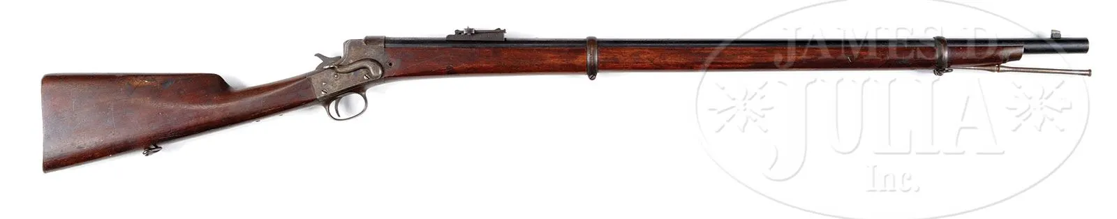 EXTREMELY RARE REMINGTON NO.3 HEPBURN LONG RANGE MILITARY RIFLE.SN 5307. Cal. 44-90 Remington Straight. Military style target rifle with 34″ rnd bbl, square base front sight and special 1,200 yd, windage adjustable, non-standard rear sight. Top of bbl has the usual 1-line Remington & Sons address. The bbl has an extra hole forward of the rear sight which would allow the sight to be moved forward per a shooters preference. Mounted with uncheckered straight grain American walnut with full length forearm, two bands, the upper of which has a sling loop and straight stock with smooth steel buttplate. Buttstock has a corresponding sling loop. Bottom of the forearm is grooved for a cleaning rod which now contains a replacement trapdoor Springfield cleaning rod. According to Flayderman’s Guide to Antique American Firearms the quantity of these rifles produced circa 1880s, is unknown but they are exceedingly rare having been produced strictly for long range military matches, primarily at Creedmoor. According to the book Remington Hepburn Rifles, Rowe, production was very limited in the period 1883-1887. This book shows two different sights available for the long range Creedmoor rifle but obviously other sights could have been furnished. Accompanied by Mr. Yearout’s Collection inventory card which shows that he purchased this rifle from renowned collector, author and dealer, Norm Flayderman, in Dec. 1978. PROVENANCE: Estate Collection of Lewis & Leyton Yearout. CONDITION: Very good. Bbl retains about 80-85% bright orig blue with freckles of surface rust; receiver retains most of its orig case colors with light spotting; one screw is battered. Stock has a hairline back of the top tang and the forearm has a screw hole at the right side at the receiver probably from an old wall mount, otherwise wood is sound. Mechanics are fine; bright bore with fine pitting. 4-53963 JR92 (4,000-6,000) – Lot 2157 Click here to view provenance