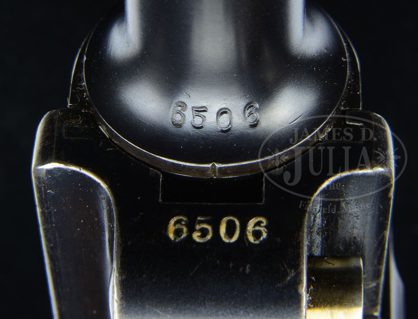 *EXCEPTIONAL 1900 AMERICAN EAGLE US TEST TRIALS LUGER PISTOL.SN 6506. Cal. 7.65, 4-3/4″ bbl with full SN on bottom. American Eagle above chamber. DWM scroll on center toggle link. Dished toggles with toggle lock. Proper test trials range SN on front of frame. Take down lever is numbered on right side, which is proper for the 1,000 test trial guns. All numbered parts are matching including the checkered walnut grips. Grip safety. Proper plain wood bottom magazine. CONDITION: Excellent retaining 95% blue and 80% straw. There are minor dings on front grip strap most likely from a ring on finger. Finish on bbl has been restored to new. Grips are lightly worn and oil soaked. Magazine has very little wear. Bore is lightly frosted. Mechanics are very fine. 4-53735 (6,000-10,000) – Lot 2159