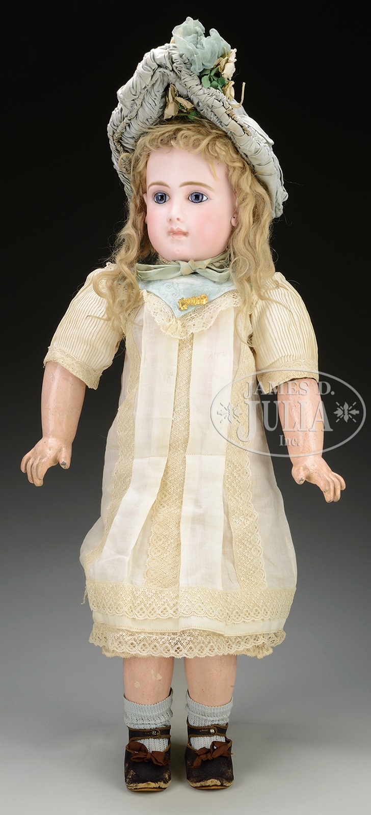 25″ EJA JUMEAU.A classic EJA marked only “12” on the back of the head and on an 8 ball-jointed Jumeau body with coil spring attaching bisque head to composition body. The bisque head itself has wonderful pale bisque with attached ears, well-defined lips and stunning blue paperweight eyes. Dressed in a fanciful cream/ecru outfit with a blond wig, Paris B shoes marked “12”, and a fabulous pale blue bonnet to finish the package. The EJA models were somewhat of an enigma in many ways a transition between the early portrait faces and the well-known Cody/long face look. Regardless of which Jumeaus are your favorite, this gal has a strong presence and one cannot help but be drawn to her. SIZE: 25″ t. CONDITION: Bisque head appears to be free of any damage such as hair lines, cheek rubs, eye chips, etc. Original coil spring in neck so neck socket not inspected. Normal wear to compo body most noticeable at joints but overall condition is very fine. 48885-1 (8,000-12,000) – Lot 2159 Auction: Advertising, Toy & Doll - Spring 2015 Please Note: All prices include the hammer price plus the buyer’s premium, which is paid by the buyer as part of the purchase price. The prices noted here after the auction are considered unofficial and do not become official until after the 46th day. |