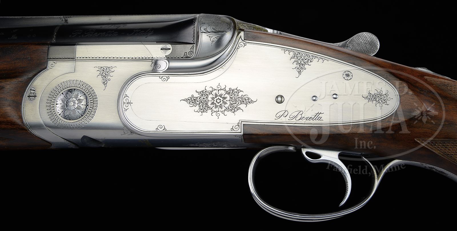 *FINE BERETTA SO5 TRAP WITH CASE.SN C14930B. Cal. 12 ga. 2-3/4″ Chambers. 29-1/2″ Mono-bloc bbls are marked with typical Beretta nomenclature, chamber, bbl information, importer, and warning, on top bbl either side of relatively wide, matted, ventilated rib. Bottom of mono-bloc is stamped with year 2000 Italian nitro proofs, SN, and grade. Coin finished, low profile, Beretta sidelock action features non-automatic safety and non-selective single trigger. Action has minimal engraving, but what is present is of the highest quality, with exceptionally well cut sprays of scroll and double line borders. “P. Beretta” is gold inlaid on bottom. Central portion of trigger guard bow is silver inlaid “TRAP”. Nicely marbled and lightly figured European walnut extreme pistol grip high comb buttstock measures 14-7/8″ over thin, open sided, Beretta pad. Point pattern checkering and a right hand palm swell are at grip. Nicely matching one piece small beavertail forend has Beretta’s Deeley type release. Bore diameter: top -.722, bottom -.723. Bore restrictions: top -.037 (full), bottom -.032 (full). Drop at heel: 1-5/8″, drop at comb: 1-3/16″. Weight: 8 lbs 11 oz. LOP: 14-7/8″. Gray ABS Beretta embossed case with three combination locks, is lined in checkered gray, blue, and brown velvet. Case contains bags for bbls and action, a set of rosewood handled turnscrews, and compartment in lid contains 3-pc cocobolo and brass cleaning rod with mop, brush, and jag in black leather container. Information paperwork is in pocket. CONDITION: Essentially as new, appears unfired since proof, with only the lightest of handling and assembly marks in wood and metal. Case is excellent. This fine gun retails for over $25,000.00. 49181-3 MGM367 (8,000-12,000) – Lot 2159