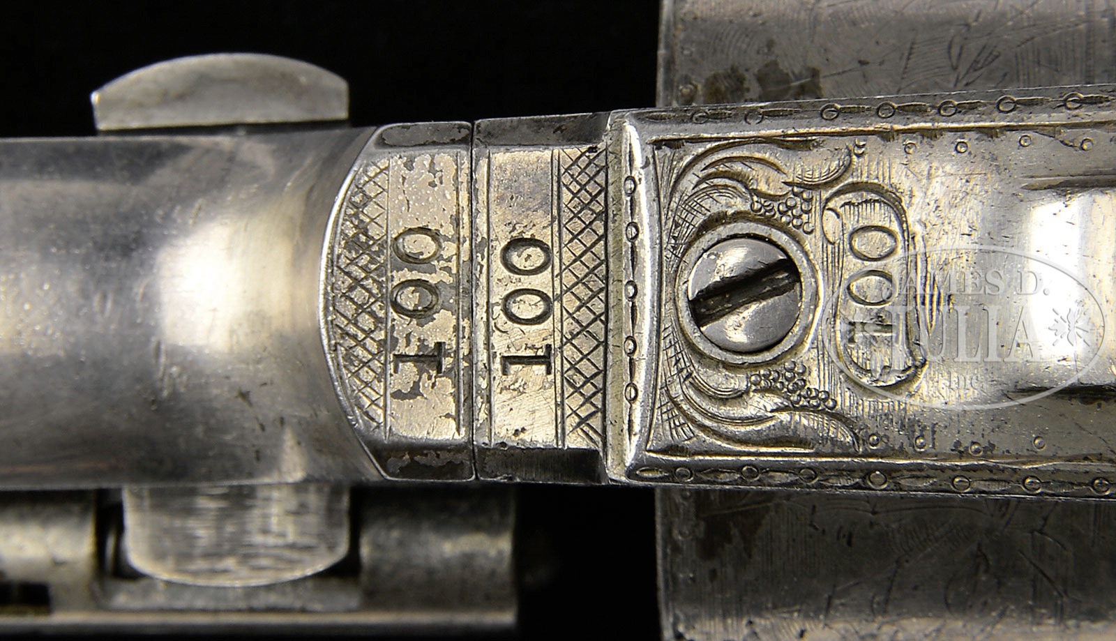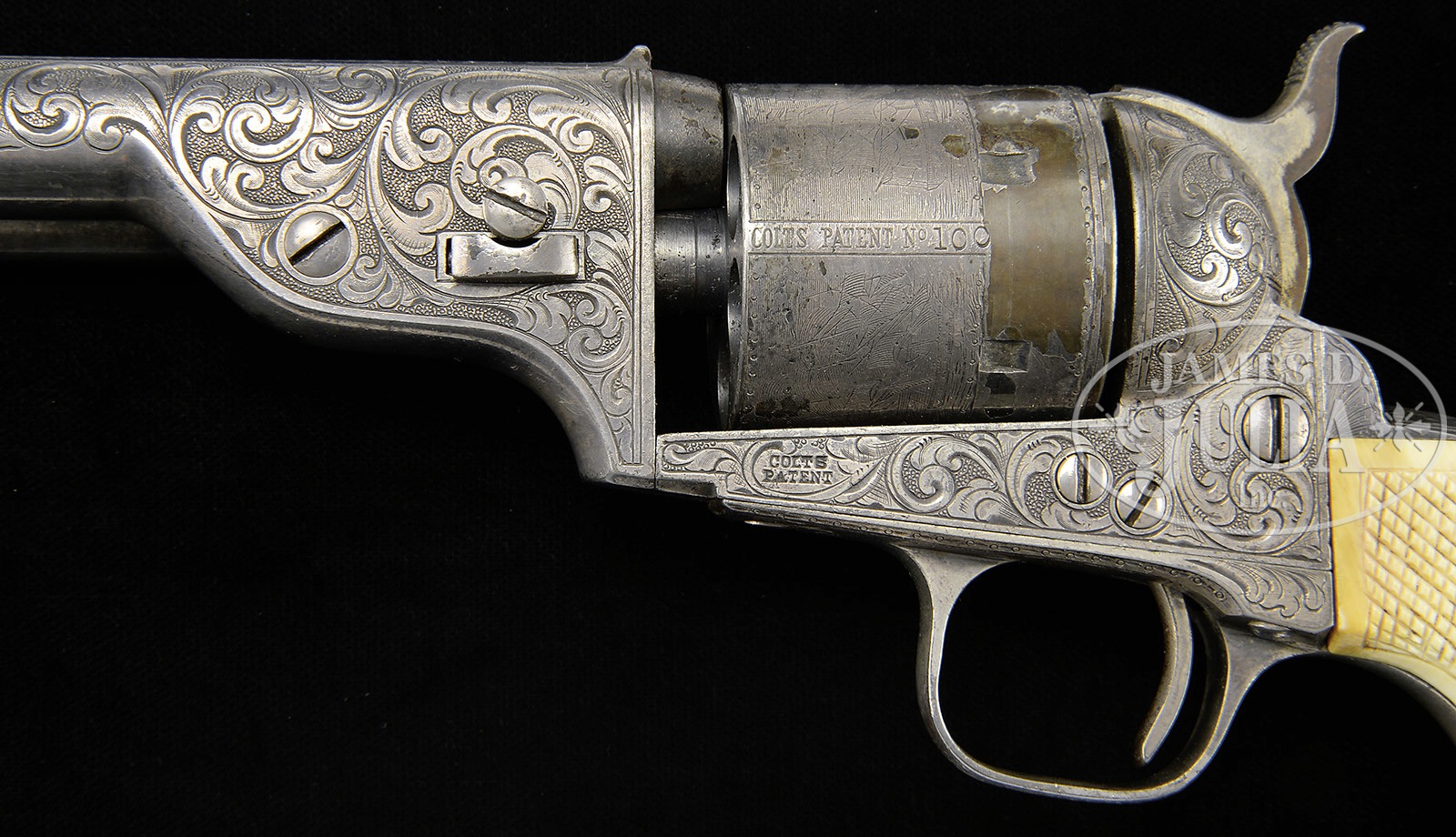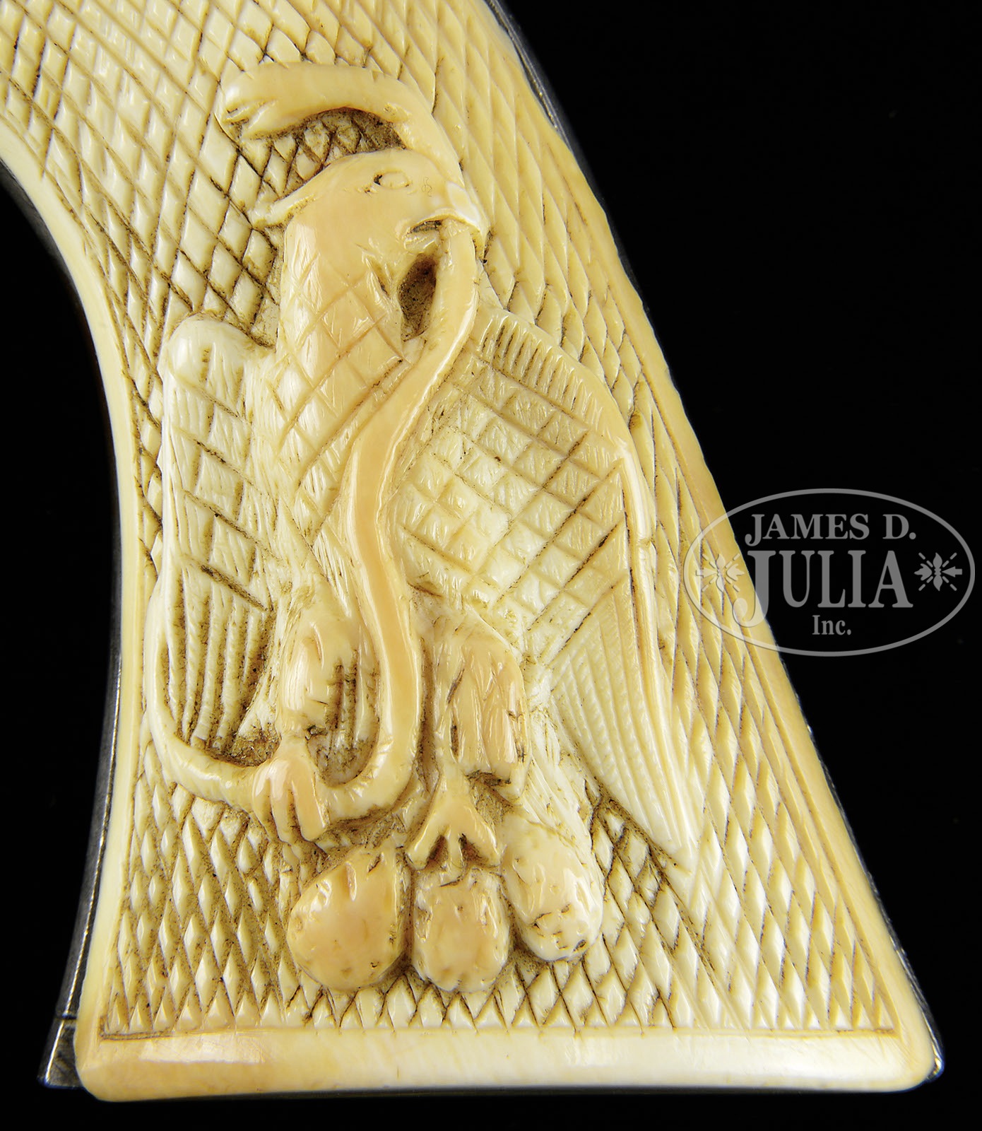 RARE ENGRAVED COLT MODEL 1871-72 OPEN TOP REVOLVER.SN 100. Cal. 44 RF Henry. Silver finish with 8″ rnd bbl, German silver front sight and 1-line U.S. America address. Left side of frame is marked “COLTS PATENT”. Cyl has straight sides and has the Ormsby Naval battle scene roll marking. Mounted with 1-pc checkered ivory grip that has raised carved Mexican eagle on the left side. Grip is orig style with two slabs of ivory attached to two wooden spacers to create a 1-pc grip. Grip is numbered inside the right top edge with what appears to be “196” or “190”. Revolver is engraved in Gustave Young style with full coverage on the frame of foliate arabesque patterns that have pearled background. Matching patterns extend over the bbl lug and around the front sight with geometric patterns down the top of the bbl. Ejector housing is engraved in a spiral feather pattern. Back strap is engraved in Mr. Young’s typical fan or spider web pattern with foliate arabesque patterns on the back strap, at the heel, butt strap & trigger bow. Frame is slightly undersized. Wedge is a matching numbered replacement and SNs appear to have been re-stamped before restoration. Hammer spring is a replacement with roller groove in the tip. Firing pin is attached to the hammer nose with two rivets. The engraving is very old and appears to have been done during the period of use. Very few Open Top Revolvers were produced and even fewer were engraved making this revolver indeed rare with a unique serial number of 100. PROVENANCE: Michael Leff Estate Collection. CONDITION: Very fine. Overall retains 80-85% strong silver finish with some light flaking and small losses on the bbl & cyl. Cyl shows 60-70% Ormsby Naval battle scene. These revolvers are known for having light cyl rolls. Grip has some fine chips on the right rear edge and some light rust staining in the back strap channel which does not correspond to the current back strap. Grip shows moderate wear. Mechanics are fine, strong bore, lightly frosted in the grooves. 4-49702 (20,000-30,000) – Lot 2160