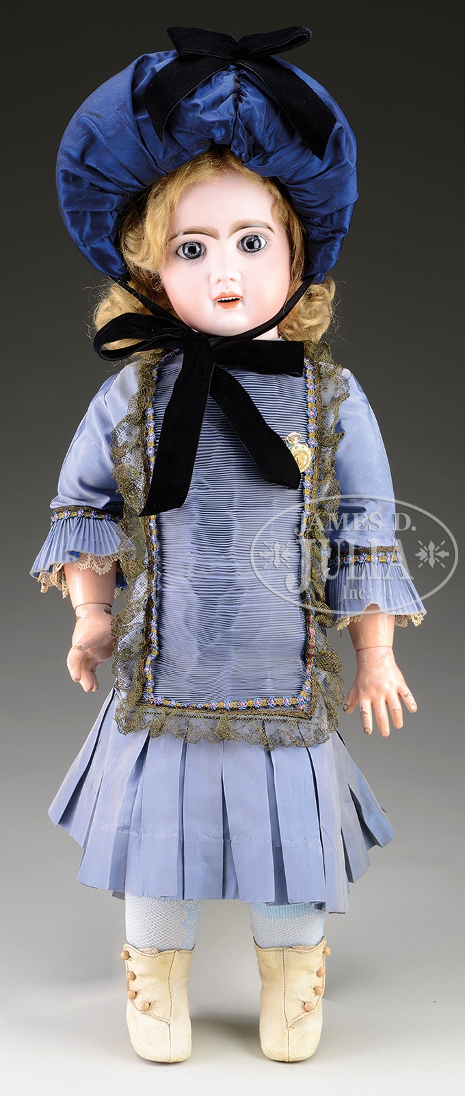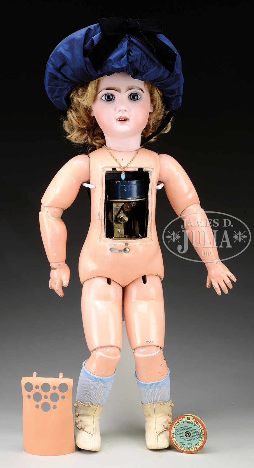 24-1/2″ PHONOGRAPH TETE JUMEAU.Which came first…the Phonograph Jumeau or the Edison Talking Doll?? The Edison version was marketed first and then the Jumeau version a few years later. Both were most ingenious creations from the latter part of the 19th Century however the Edison version was a commercial failure while the Jumeau version was quite a bit more successful due to its interchangeable records that were also more durable than the wax records of the Edison model. This particular example features an open mouth Tete Jumeau with fine bisque, blue paperweight eyes, and a fully jointed marked “Jumeau” composition body. Attractively dressed in an appropriate Bebe styled outfit with one record present. SIZE: 24-1/2″. CONDITION: As stated above, bisque head appears to be free of any damage such as eye chips, hairlines, and/or cheek rubs. 49025-1 (2,000-2,500) – Lot 2160 Auction: Advertising, Toy & Doll - Spring 2015 Please Note: All prices include the hammer price plus the buyer’s premium, which is paid by the buyer as part of the purchase price. The prices noted here after the auction are considered unofficial and do not become official until after the 46th day. |