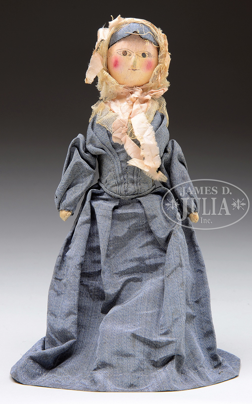 Most likely this doll is from the late 1700s/early 1800s and the painted surfaces on this doll appear to be in original finish. The clothing is old and quite aged, but not original to her. More than likely, at one point in time, this doll had simplistic arms and legs, which have subsequently been lost. Yet, her overall appearance is outstanding and elegant. At some point a long time ago, a mother redressed this doll and made cloth arms and a bunting below her torso. The painted facial features include a minuscule but well-defined mouth, exaggerated cheek blush, and painted intense eye features. A great package, which could only be better if her extremities were still present, but still a desirable and appealing early doll. SIZE: 12″ h overall. Head to bottom of torso is 6-1/2″ h. CONDITION: Blacklight reveals no paint enhancement. Carved wooden nose has been somewhat worn down with age and devoid of paint. 37883-2 (2,000-4,000) – Lot 2161