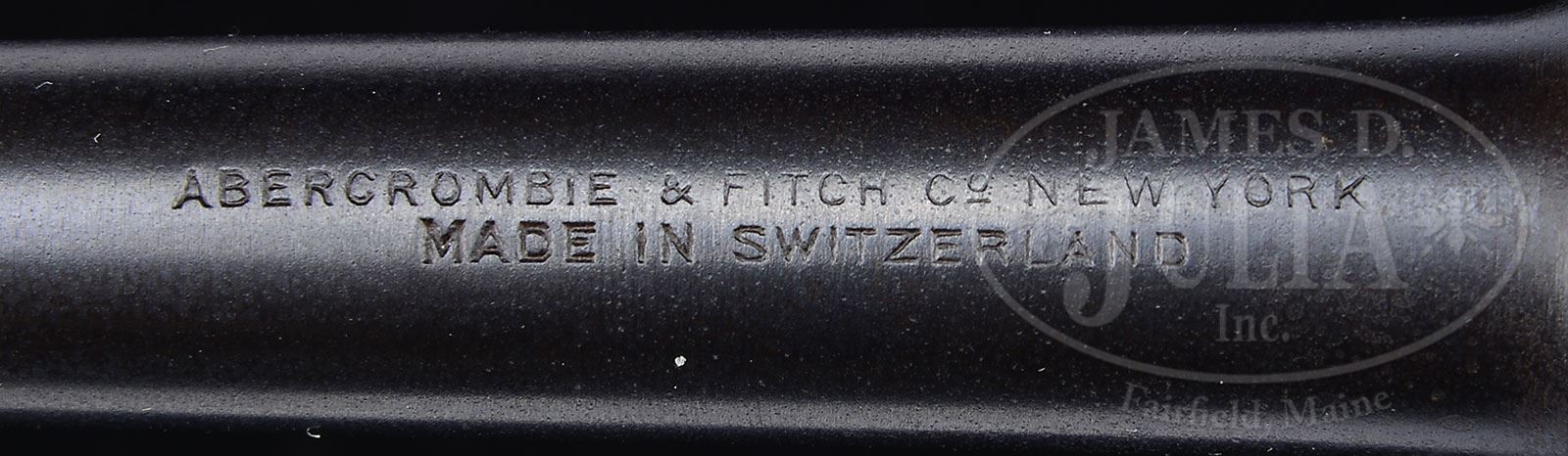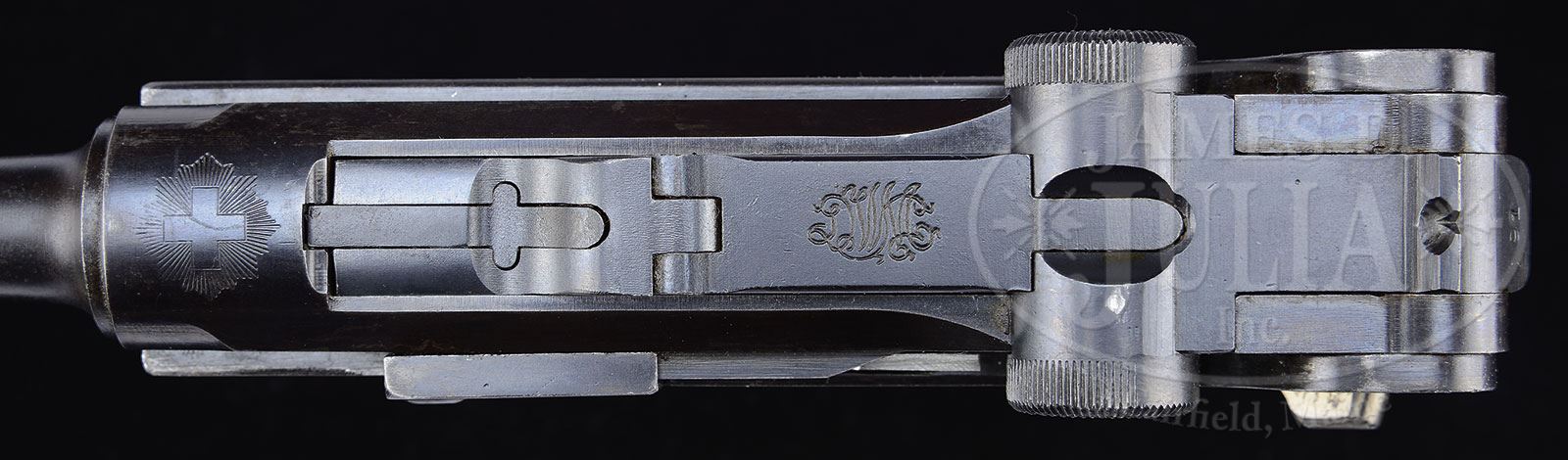 *EXTREMELY RARE 1906 SWISS COMMERCIAL LUGER SOLD THROUGH ABERCROMBIE & FITCH.SN 3191i. Cal. 30 Luger. Fine example of a 1906 Swiss commercial with 4-3/4″ bbl, Swiss type front sight, marked on the top of bbl “ABERCROMBIE & FITCH CO. NEW YORK / MADE IN SWITZERLAND”. Bottom of bbl has the SN parallel to the bore. Chamber area of receiver is marked with the Swiss cross in a sunburst. Toggle link has the intertwined “DWM” trademark. Pistol is built on a long frame with grip safety. Thumb safety in the up position exposes a bright panel. Mounted with unnumbered full checkered walnut grips. None of the parts have a proof mark. Accompanied by one orig, unmarked Swiss wood base magazine with metal insert. According to various publications there were 100 of these pistols sold to Abercrombie & Fitch by Hammererli of Lenzburg who had imported them from the old “DWM” company which was operating under the name “BIKW”. These pistols were shipped without bbls. The Swiss fabricated the bbls as found here. There were 51 of these pistols in cal 7.65 (30 Luger) and 49 in 9mm. Only a few survive today in any form. CONDITION: Extremely fine plus, all matching except firing pin, grips & magazine which are all correctly unnumbered. Overall retains 96-98% crisp orig blue with a heavier rust blue on the Swiss bbl. Pistol shows light muzzle end and sharp edge wear with thinning on high point of side plate. Straw colored parts retain strong, light gold finish showing wear on the trigger face and lock bolt. Grips are equally new with only a small holster bruise on the right side and about two chipped diamonds with no hand oil staining. Grips show light wood grain. Mechanics are crisp; brilliant shiny bore. Shows little or no use. Magazine is fine. 4-56081 (8,000-15,000) – Lot 2162