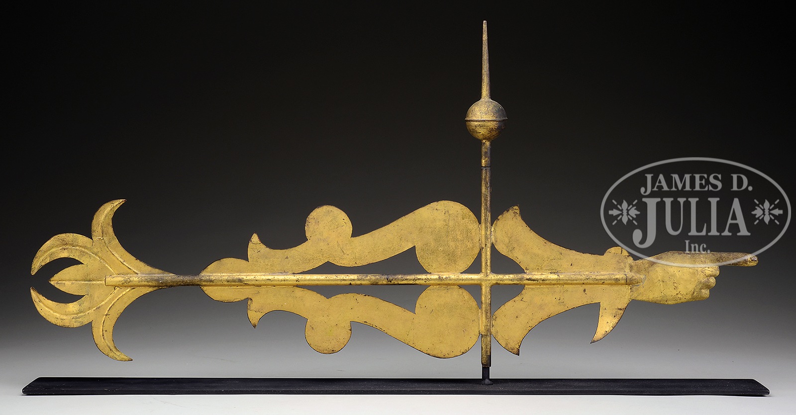 Third quarter of the 19th Century. Embossed sheet copper banner with well detailed pointing hand, adjoining spire topped rod. Old in-use worn gold leaf surface. Accompanied by a museum stand. REFERENCE: Weather Vanes, Klamkin, p30. SIZE: 17″ h x 36″ l. CONDITION: Very good with only minor seam separation top of hand. 49974-18 (4,000-8,000) – Lot 2163