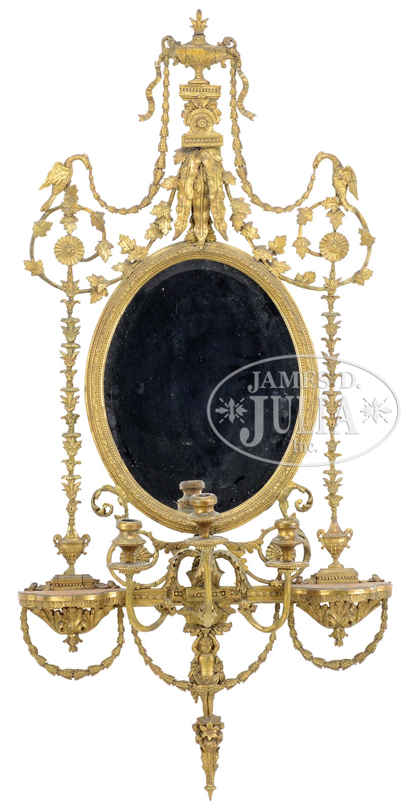 First quarter 19th century, England. The oval beveled mirror plate within a beaded and foliate molded surround flanked by classical urns emitting fanciful floral totems joined to scrolling grapevines each centered with a floral rondel above which is perched a pair of standing opposing Phoenix birds. The crest applied with a classical urn ribbon tied with belle flower swags joined to the birds and raised on a floral pedestal above a cluster of pendant water leaves. The mirror joined to a pair of shaped shelves centering three scrolled candle arms with carved wood cups and bobeches above the pendant apron of three floral swags centering a putti on floral stand. SIZE: Overall 54″ t x 26″ w. CONDITION: All elements original, mirror has been reinforced with flat metal braces in the rear. Small areas of professional restoration to leaf tips and slight gilding touch-ups throughout, nicely blended and unobtrusive. 51348-49 (1,500-2,500) – Lot 2163