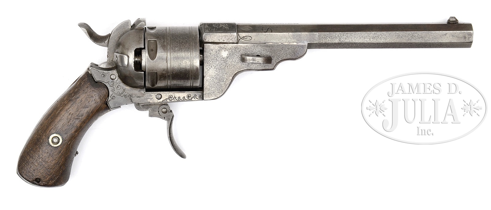 SN 24. Cal. .32RF. Scarce Belgian copy of a belt model Paterson with 5-1/8″ oct bbl, pinched post front sight, folding trigger & smooth 2-pc homemade walnut grips. Frame & backstrap, along with bbl lug are lightly engraved. Cylinder is quite unusual in that it appears to be a fluted cylinder inserted into steel tube with stop notches on outer diameter. Accompanied by a black velvet-lined homemade walnut case. PROVENANCE: Michael Leff Estate Collection. CONDITION: About good. No orig finish remains being an overall blue-gray patina with light pitting on bbl & bbl lug. Cylinder is matching patina. Mechanics are weak and may need adjustment. Grips are crude & poorly finished. Case is fine. 4-49642 (2,000-4,000) – Lot 2165