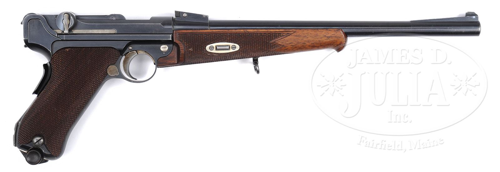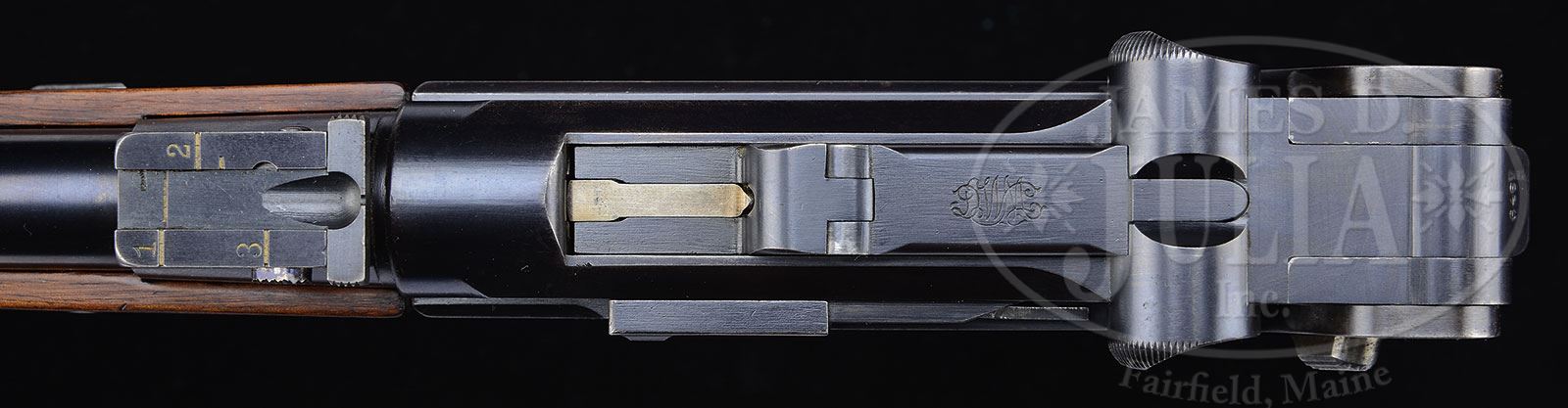 *EXCEPTIONAL CASED MODEL 1902 DWM LUGER CARBINE OF SIR J. BUCHANAN-JARDINE.SN 21646. Cal. .30 Luger. Usual configuration with 11-13/16″ tapered rnd bbl, ramp front sight & 4-position rear sight graduated 1, 2, & 3 with a half point stop between 2 & 3. Frame is long style with grip safety & flat bolt, dished toggles & unmarked extractor. Area under the safety, when in the up position, is polished bright. Small parts are straw colored. Mounted with full checkered walnut grips, a checkered schnable-tip forearm with sling swivel, all matching numbered to this pistol. Accompanied by one orig wood base magazine that has a small flaming bomb proof on the bottom. Also accompanied by its orig, matching numbered walnut stock with checkered straight wrist & serrated horn buttplate with tab. Bottom of stock also has a sling swivel. There were about 2,500 of these pistols produced for sale in Germany, Europe and the U.S.. Accompanied by a red felt-lined, russet brown leather & oak trunk casing, French fitted in the bottom for the pistol, stock and an orig Luger barrel-end brass cleaning rod. Inside the lid has a small pink leather label marked “DEUTSCHE WAFFEN=UND / MUNITIONSFABRIKEN / KARLSRUHE I.B.”. Top of the lid is embossed “Sir J. BUCHANAN-JARDINE”. Case is complete with carrying handle & straps. Sir John William Buchanan-Jardine, 1900-1969, was educated at at Eton Royal Military College, Sandhurst and Trinity College, Cambridge. He was a captain in the Royal Horse Guards and saw service during WWII. He was also the head of Jardine Matheson Co., one of the largest British firms in China. Jardine Matheson was multifaceted, involved in imports & exports, merchandising & manufacturing, insurance & investment, textiles & engineering. Their head office was in Hong Kong with subsidiary offices in London, Japan, Singapore, Malaysia, Brunei, Thailand and Australia. At one time, he was chosen as the “World’s best dressed man” by Savile-Rowe Tailors. CONDITION: Very fine to extremely fine, all matching including grips, forearm & stock, magazine is properly unnumbered. Bbl & receiver retain 95-96% strong orig blue with faint sharp edge wear and a spot of wear from the forearm. Bolt & toggle system retain about 99% orig blue. Frame retains 95-96% strong orig blue with sharp edge wear & dulling of the blue on front & backstraps. Small parts retain strong straw colors showing wear on trigger face. Grips are crisp showing nice wood grain with very light staining & a few tiny chipped diamonds. Forearm shows light to moderate wear. Stock is sound with a series of small dings on right side & series of small bruises on left side, and overall retains most of its orig hand-rubbed oil finish. Stock iron retains about all of its orig blue. Mechanics are crisp, bright shiny bore with some very minor roughness that may clean. 4-54073 (20,000-30,000) – Lot 2165 Click here to view provenance