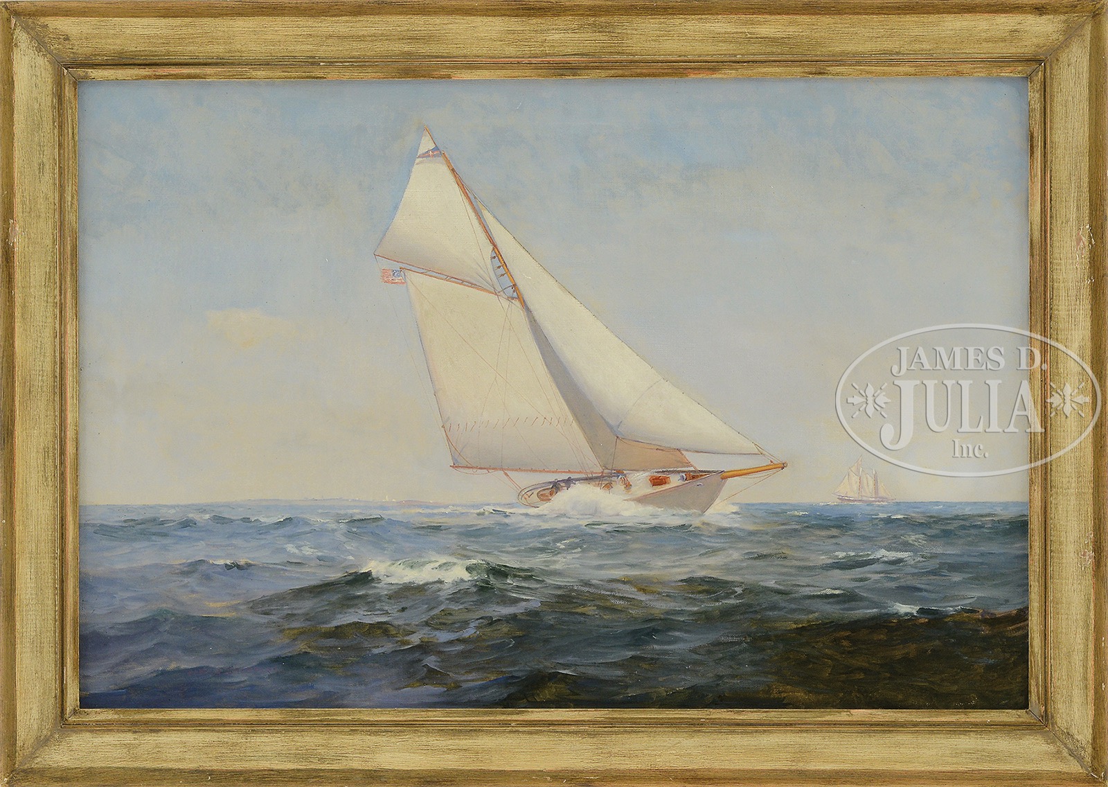 WARREN W SHEPPARD (American, 1858-1937) “THE VIGILANT”.Oil on canvas portrait of the center board sloop, Vigilant, owned by a syndicate led by Charles Iselin, which included Cornelius Vanderbilt, Henry Astor Carey, and Edwin Dennison Morgan, amongst others. She was launched on June 14th 1893 and is best known for winning the 1893 America’s Cup against British challenger Valkyrie II. The single masted sloop sails left to right along the horizon line with a two-masted ship in the distance and a hardly visible point of land to its stern. Housed in a Friedrichs Company gold tone wood frame. Signed lower left “Warren Sheppard”. SIZE: 20″ x 30-1/4″. Overall 24-1/2″ x 34-1/2″. CONDITION: Very good. 51350-7 (3,000-5,000) – Lot 2166
