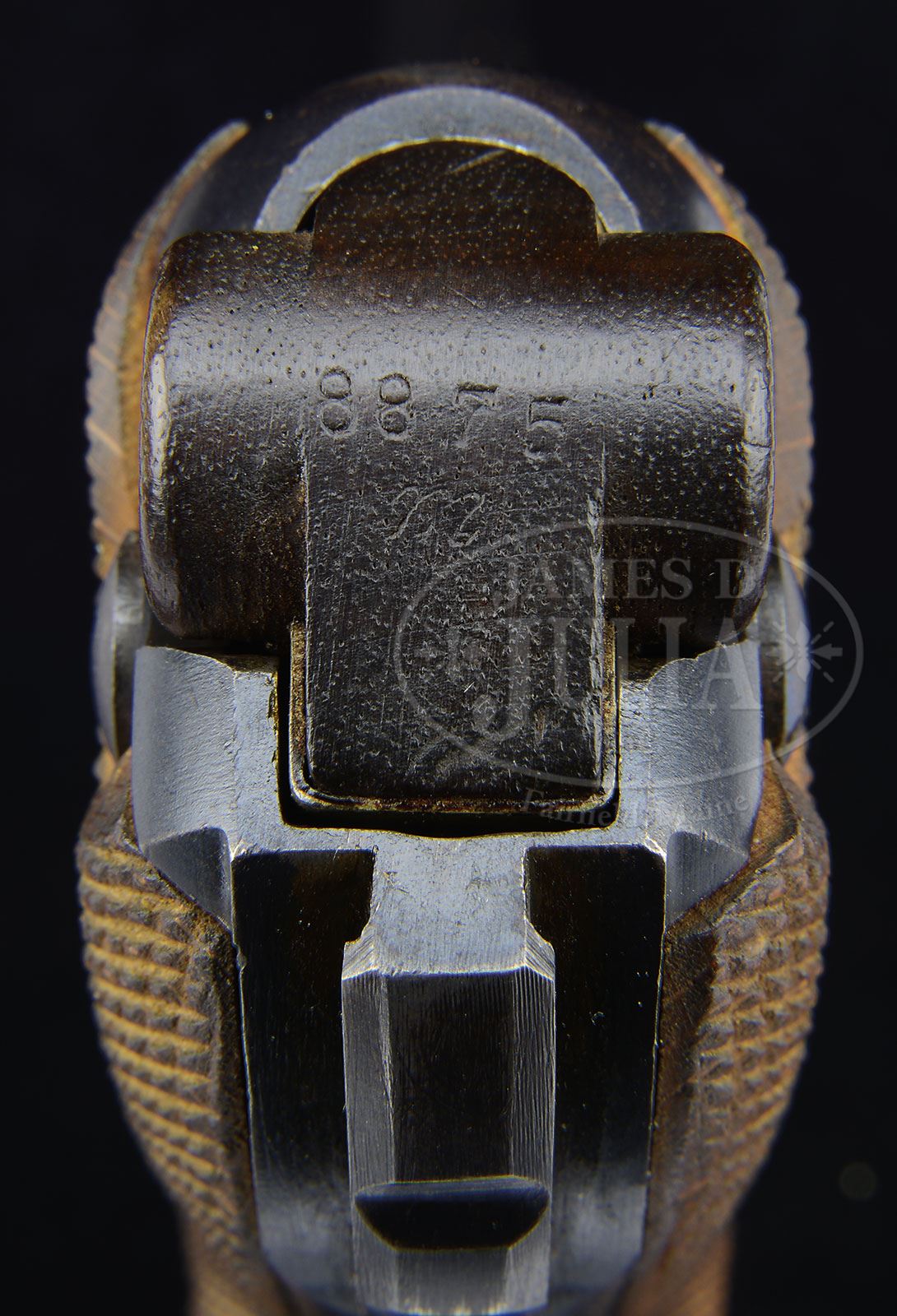 *RARE UNIT MARKED 1917 LUGER ARTILLERY RIG WITH MATCHING STOCK & MAGAZINE.SN 8875. Cal. 9mm, 8″ bbl with multi-position adjustable rear sight and full SN on bottom. 1917 date above chamber. DWM scroll on center toggle link. Imperial proofs on right receiver. All numbered parts are matching. Checkered beech grips. Front grip strap is stamped “R.J.R.222.1.2.” (Reserve Infantry Regiment). Original matching wood bottom magazine. Original matching numbered walnut stock with black 1917 dated holster with attaching straps. Holster contains original Imperial proof tool and proper cleaning rod. CONDITION: Very fine retaining 97% blue and 80% straw with scattered light frosting. Grips are lightly worn and retain original color. Bore has light frosting. Stock is very good with minor dings and dents. Corners and sharp edges are worn. Holster is solid with light flaking and cracking and minor scuffs. Stitching has not been dyed. Take down tool is lightly pitted. Cleaning rod shows normal wear. Mechanics are fine. 4-53852 (5,500-10,500) – Lot 2170